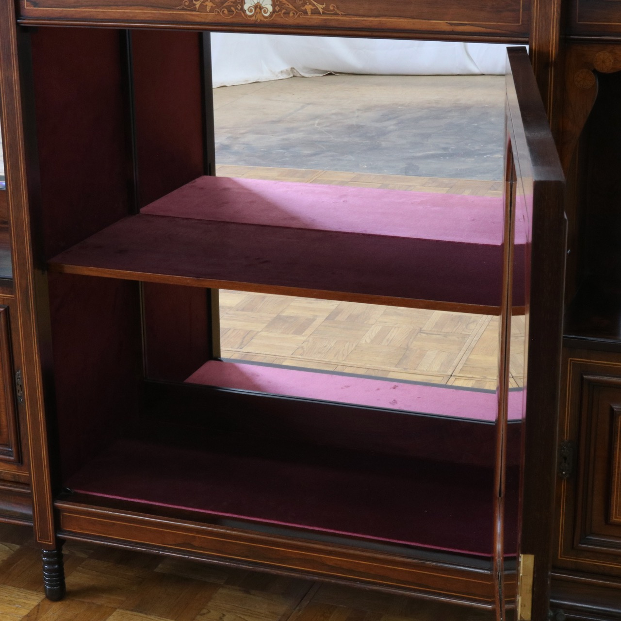 扉四角のインレイやベロアの生地が張られた棚板など、趣高い仕上がりです。