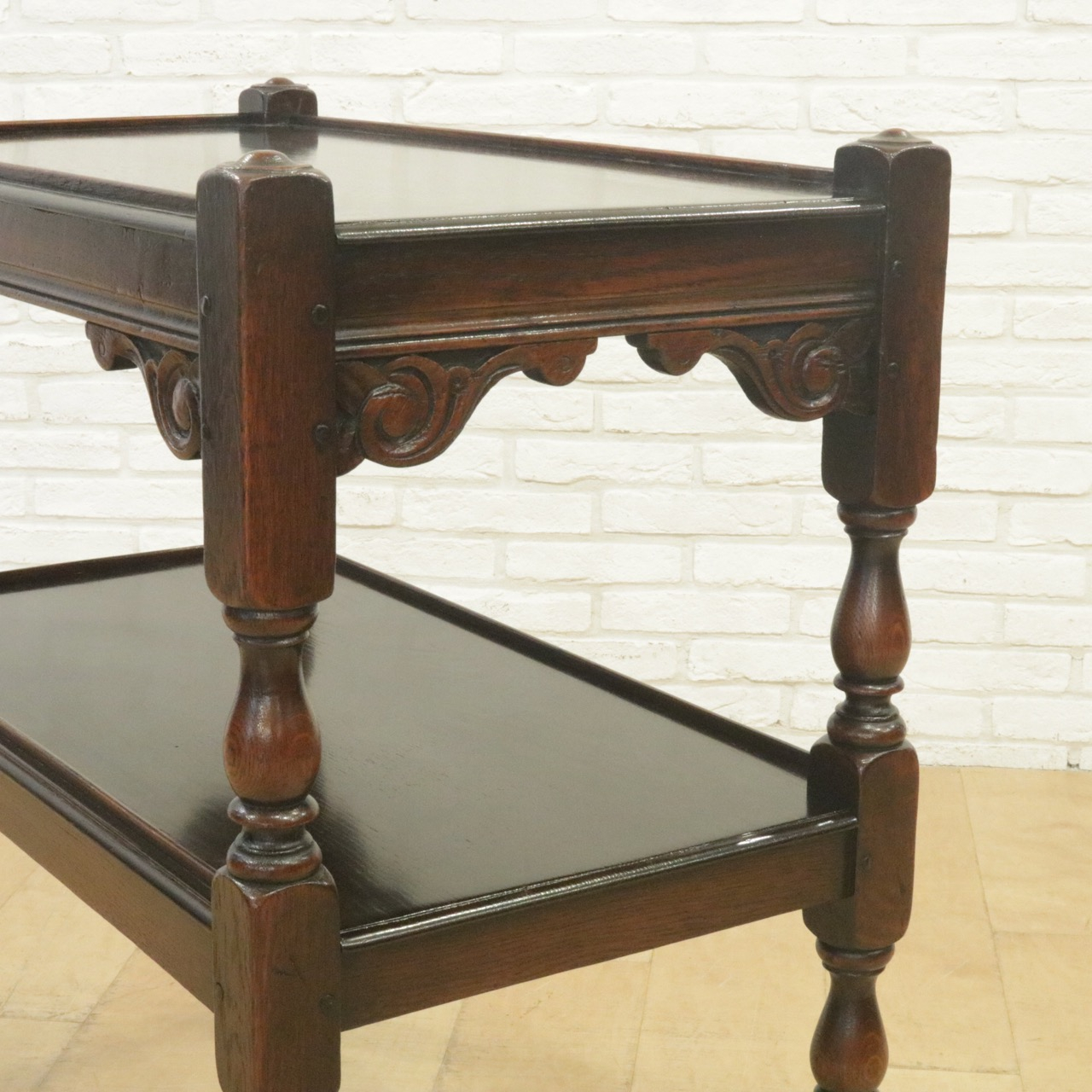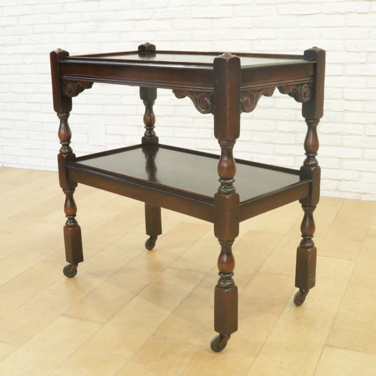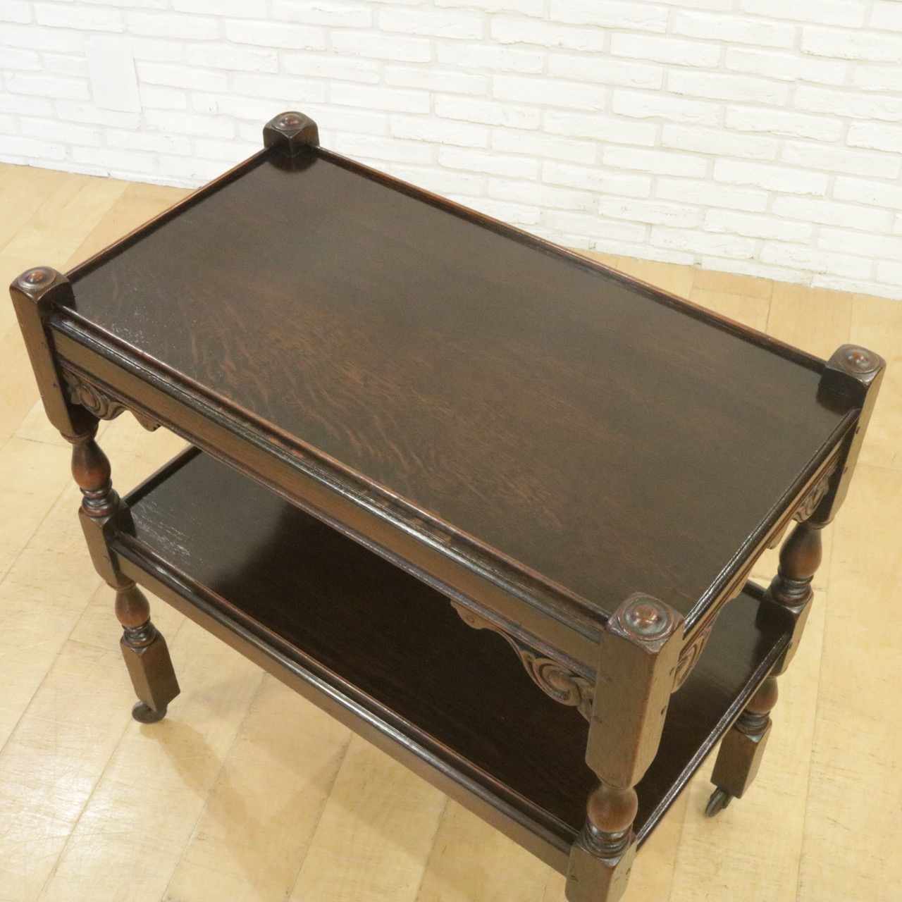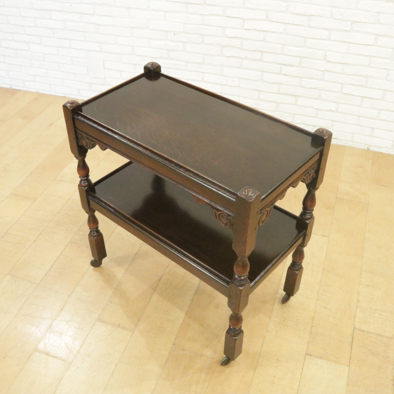 配送料の目安 ▶︎1930年代、オーク材のトローリー 。コーナーにはスクロールの彫刻が施されアクセントに。食器運びから小物を置いたり飾ったり、活躍度の高いアイテムです。