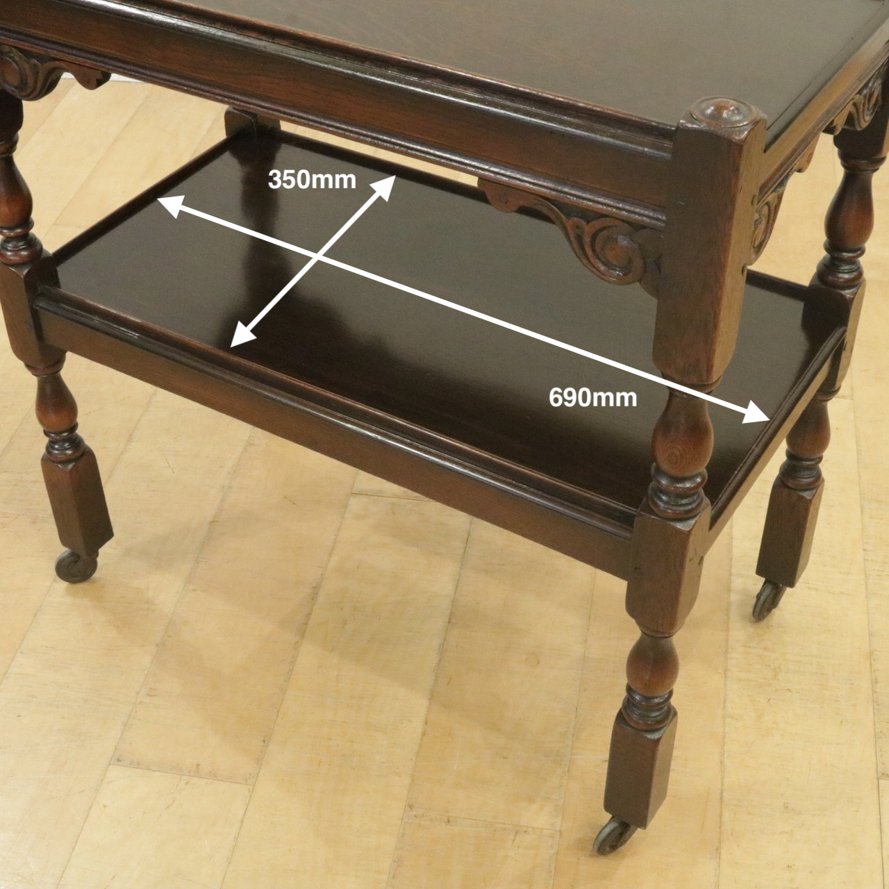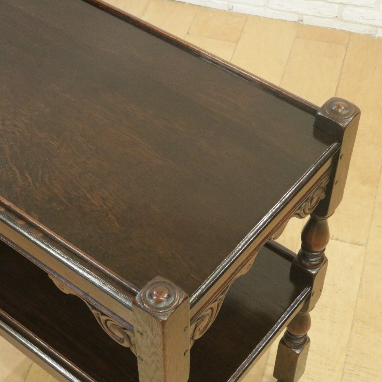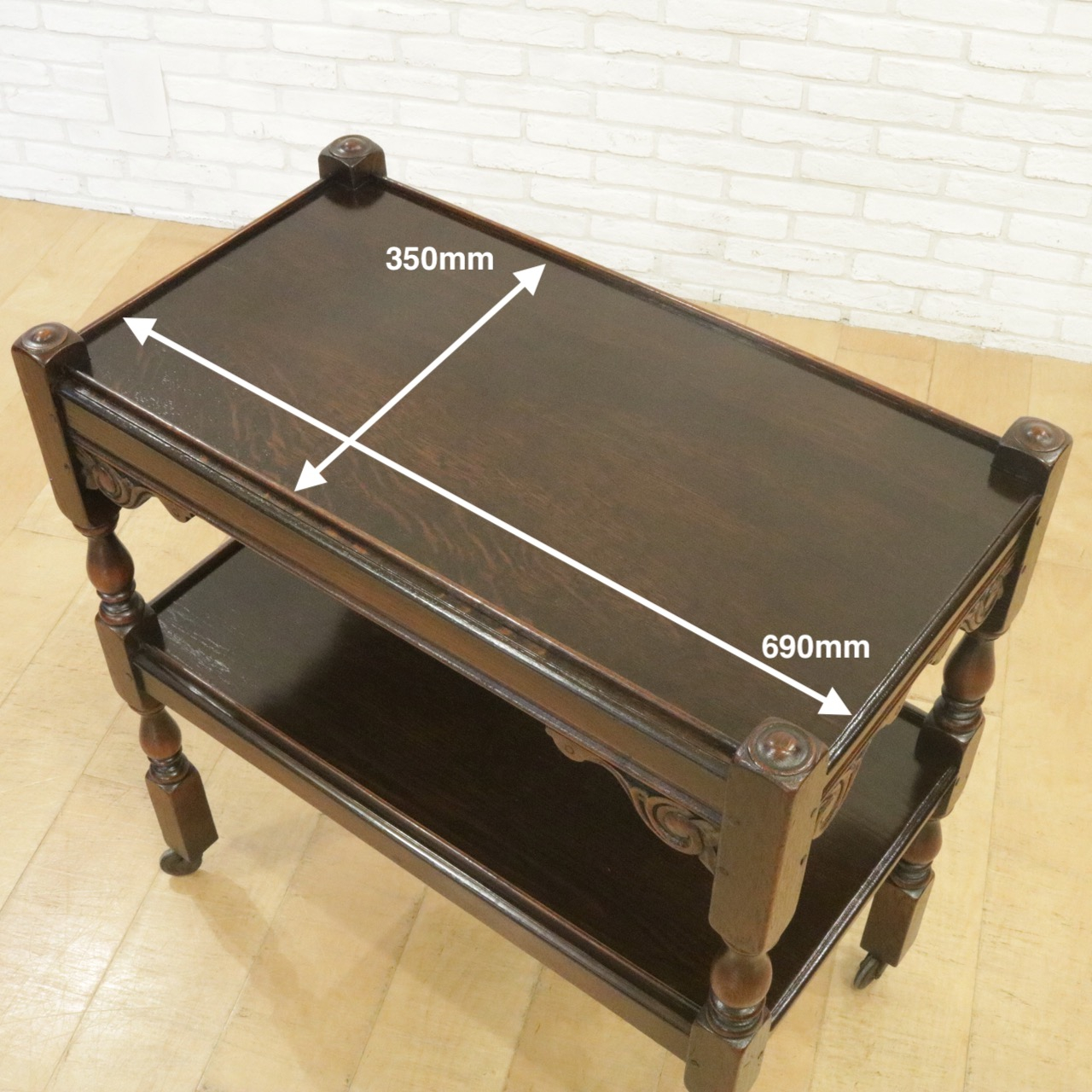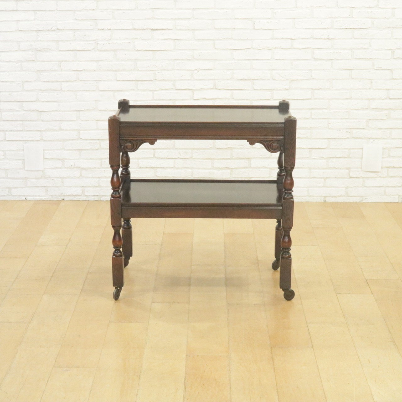 配送料の目安 ▶︎1930年代、オーク材のトローリー 。コーナーにはスクロールの彫刻が施されアクセントに。食器運びから小物を置いたり飾ったり、活躍度の高いアイテムです。