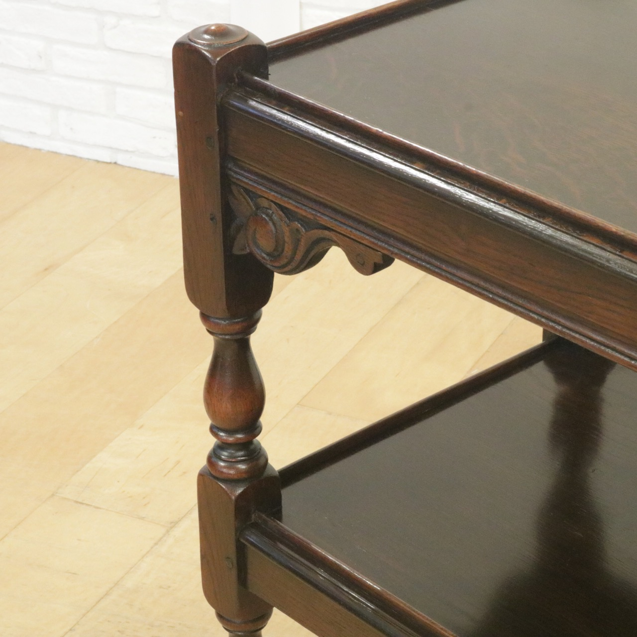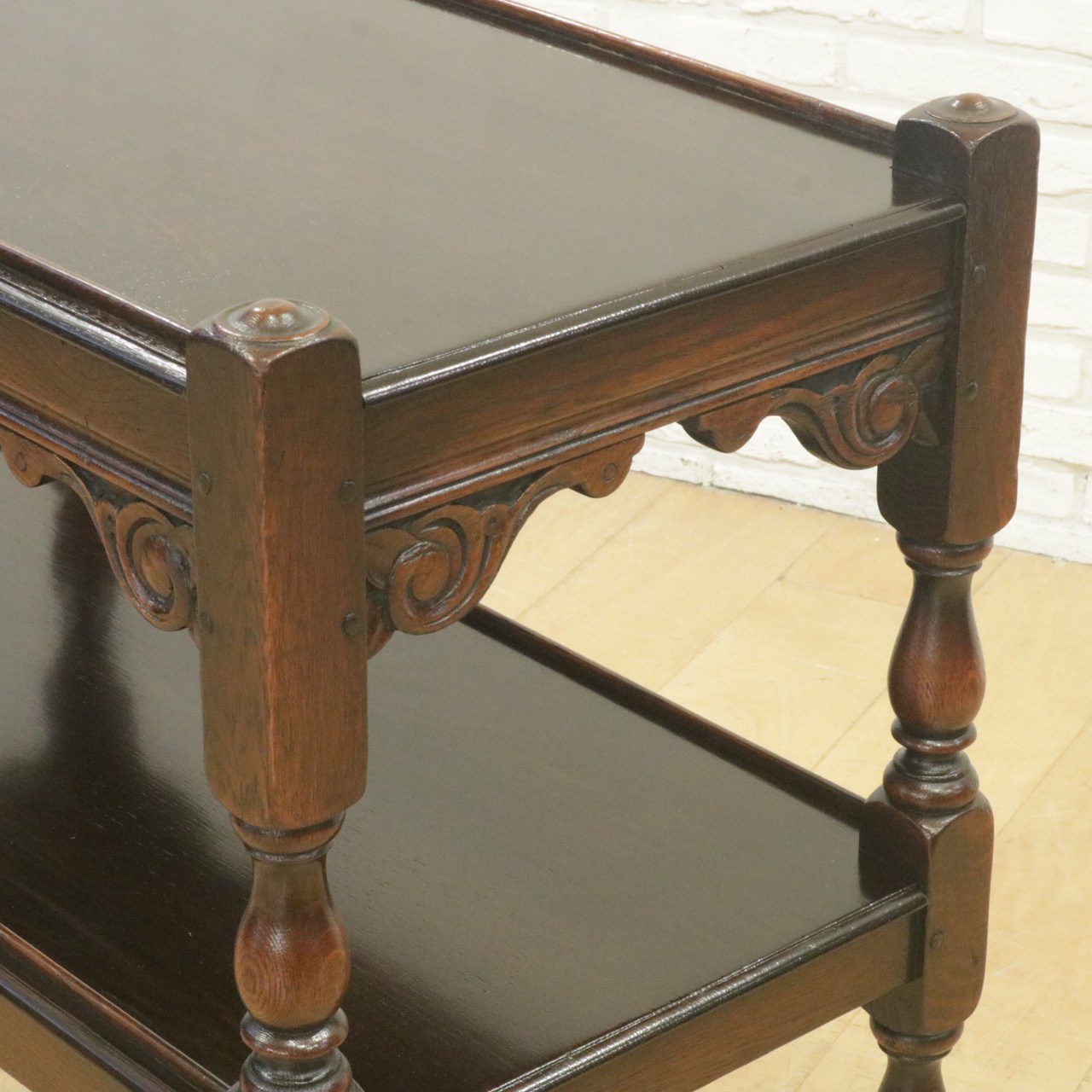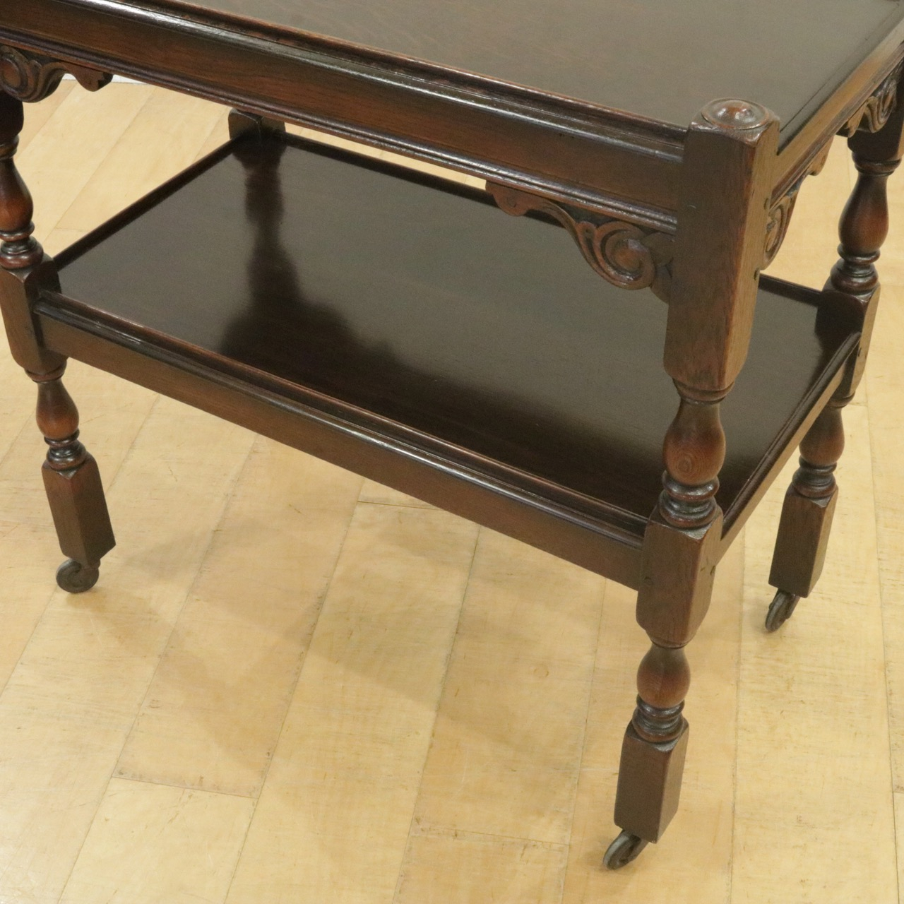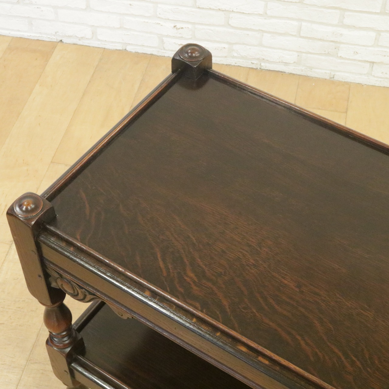 配送料の目安 ▶︎1930年代、オーク材のトローリー 。コーナーにはスクロールの彫刻が施されアクセントに。食器運びから小物を置いたり飾ったり、活躍度の高いアイテムです。