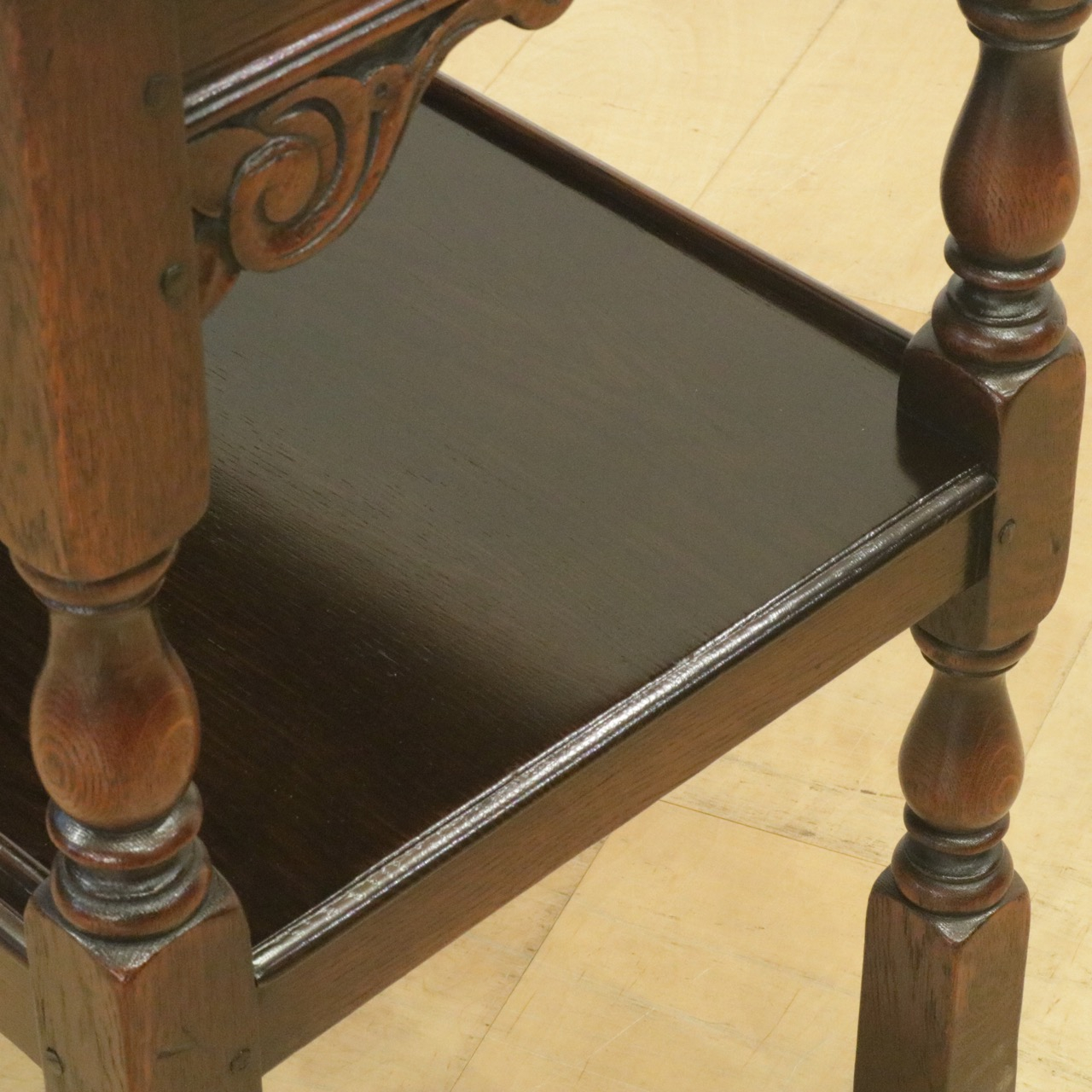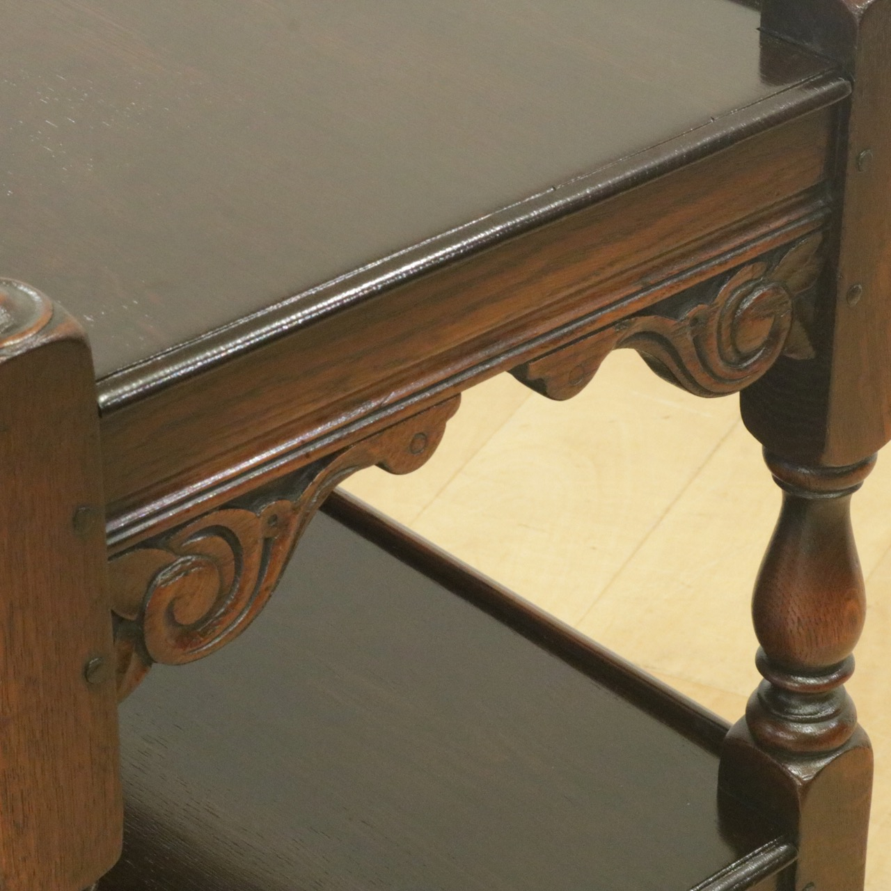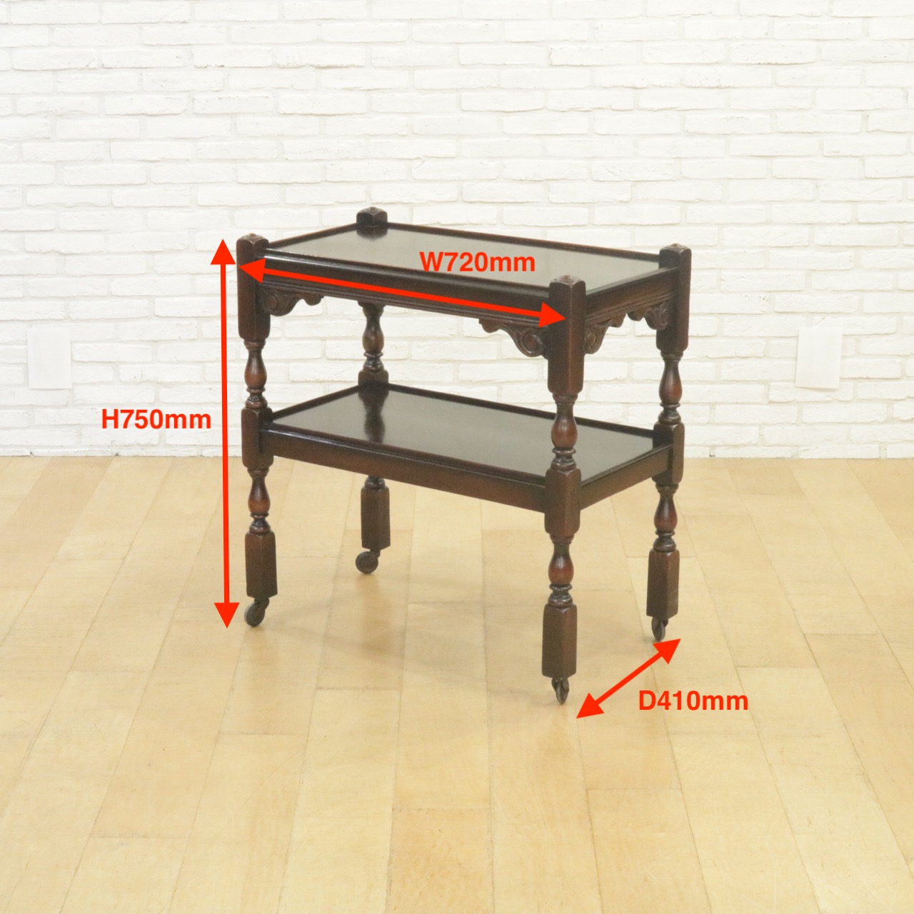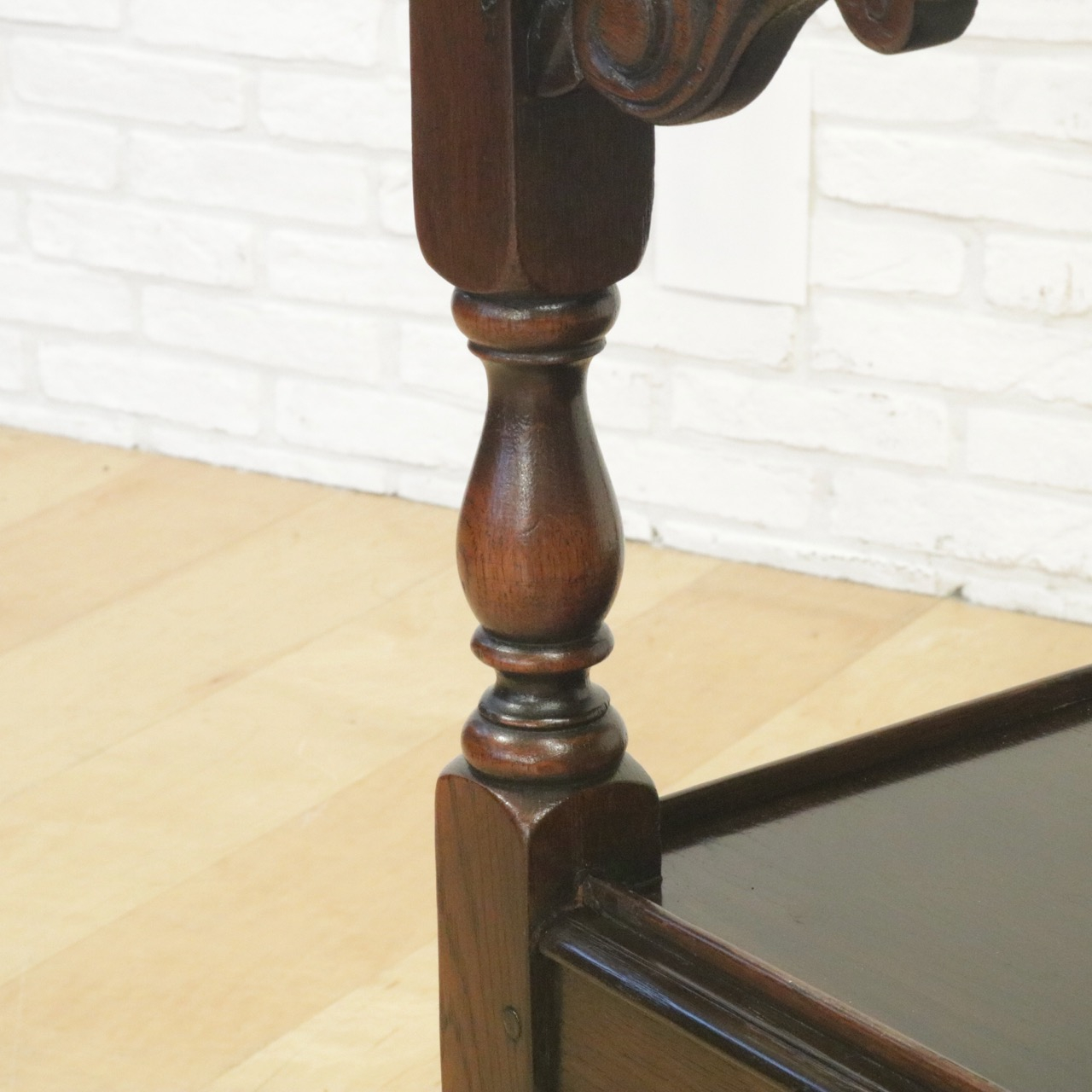 配送料の目安 ▶︎1930年代、オーク材のトローリー 。コーナーにはスクロールの彫刻が施されアクセントに。食器運びから小物を置いたり飾ったり、活躍度の高いアイテムです。