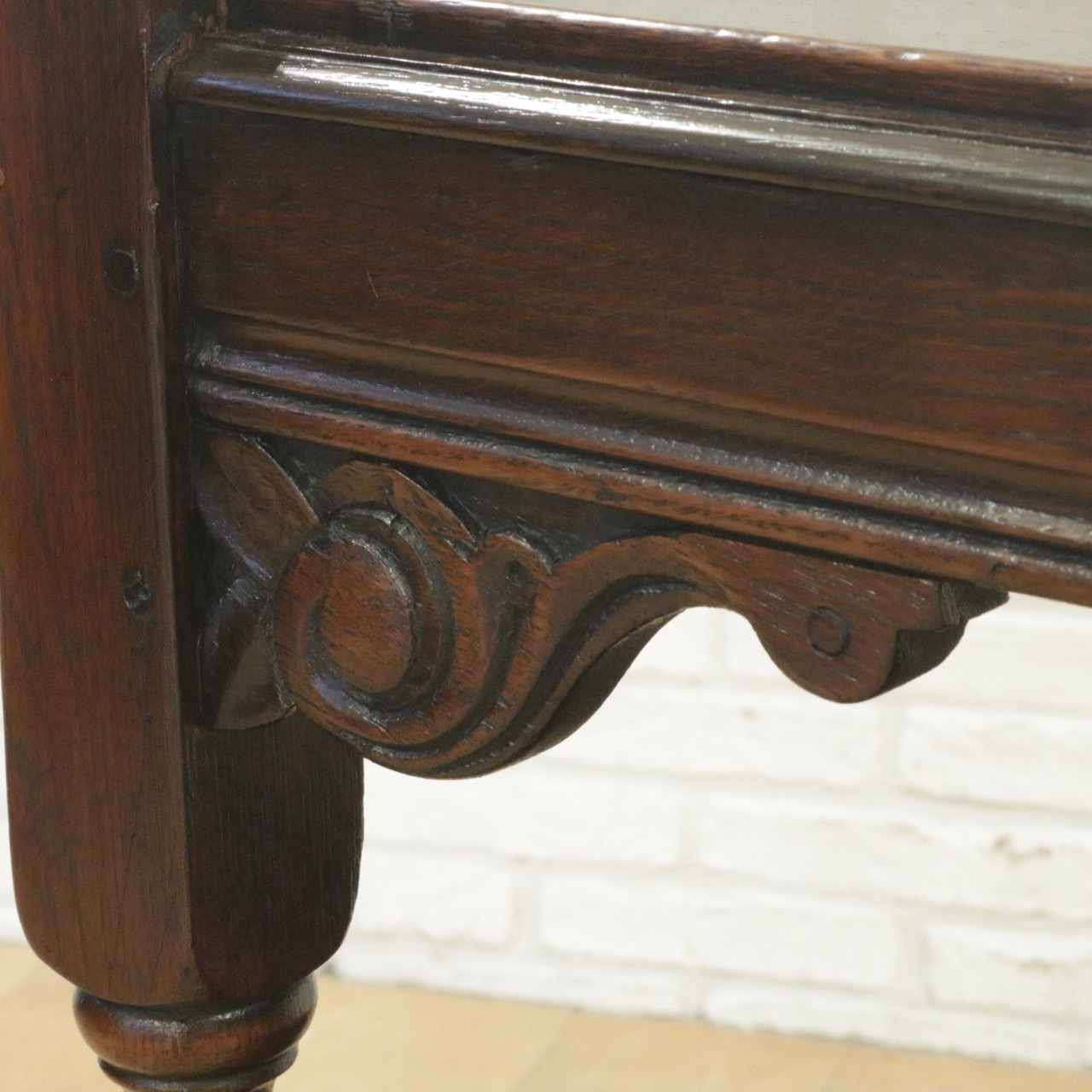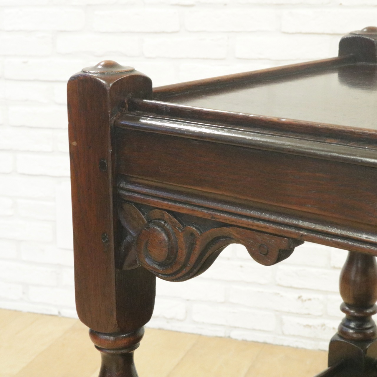 天板を支えるコーナーのパーツにはエレガントなスクロール彫刻。
