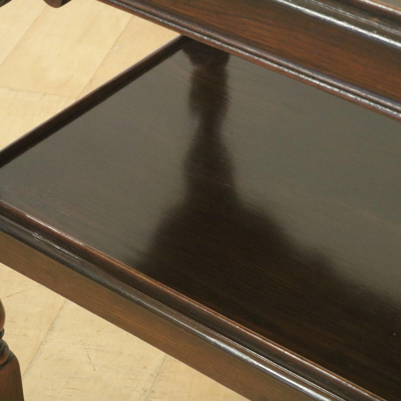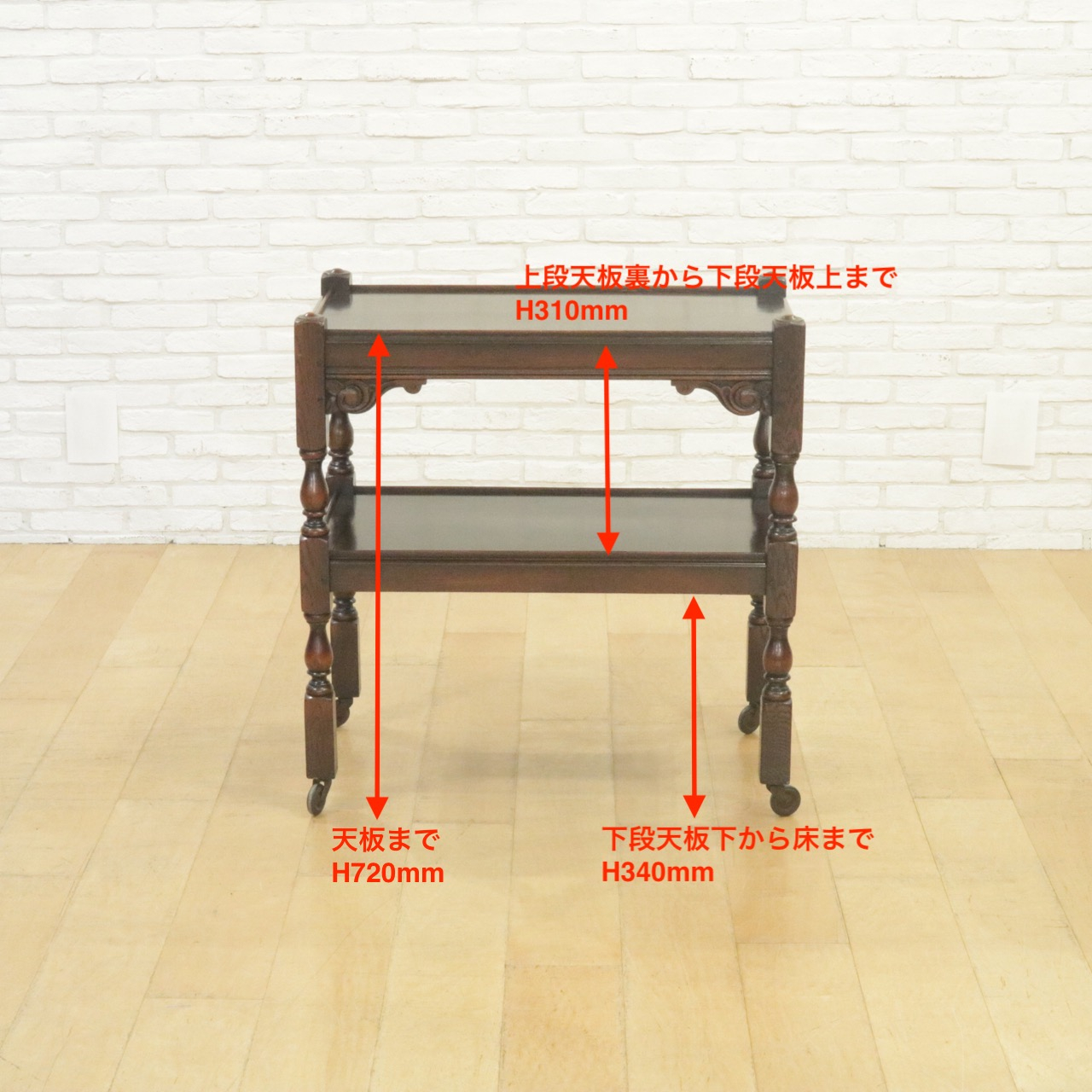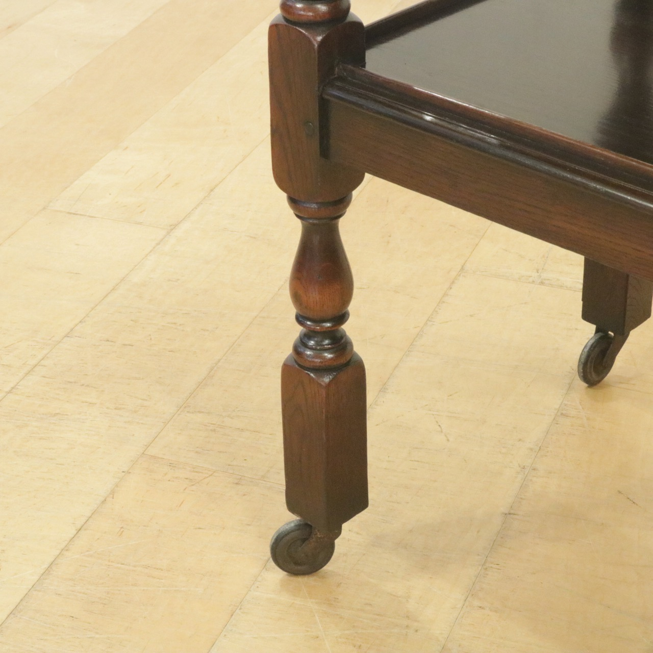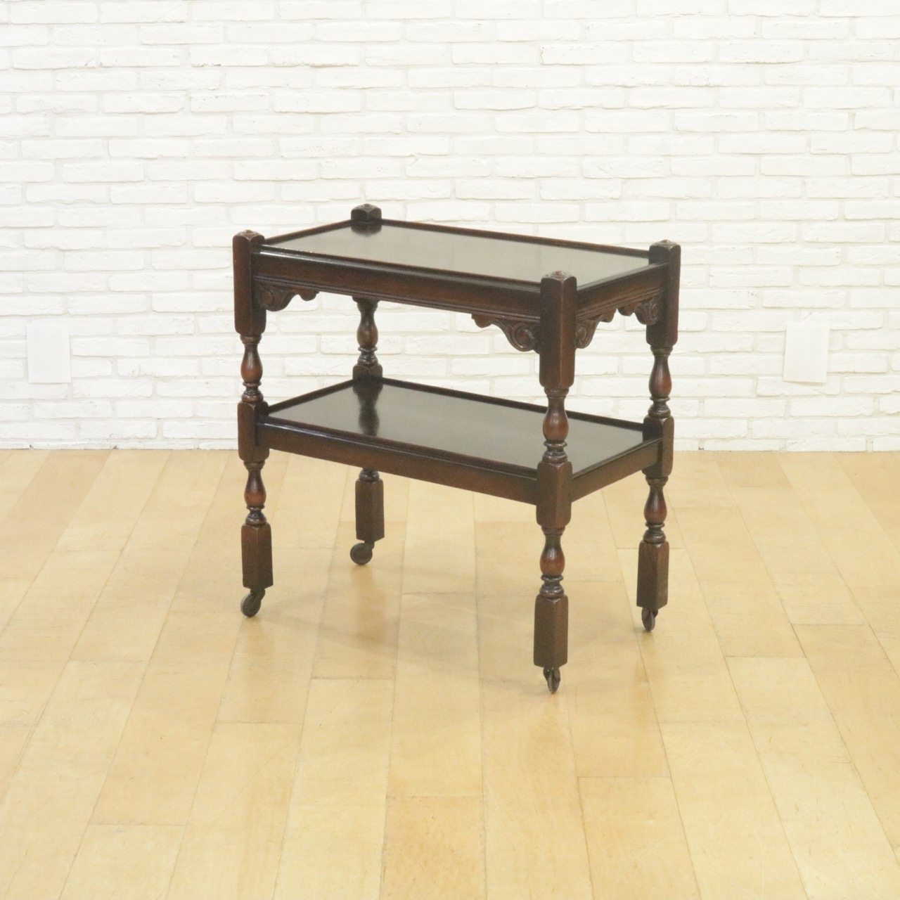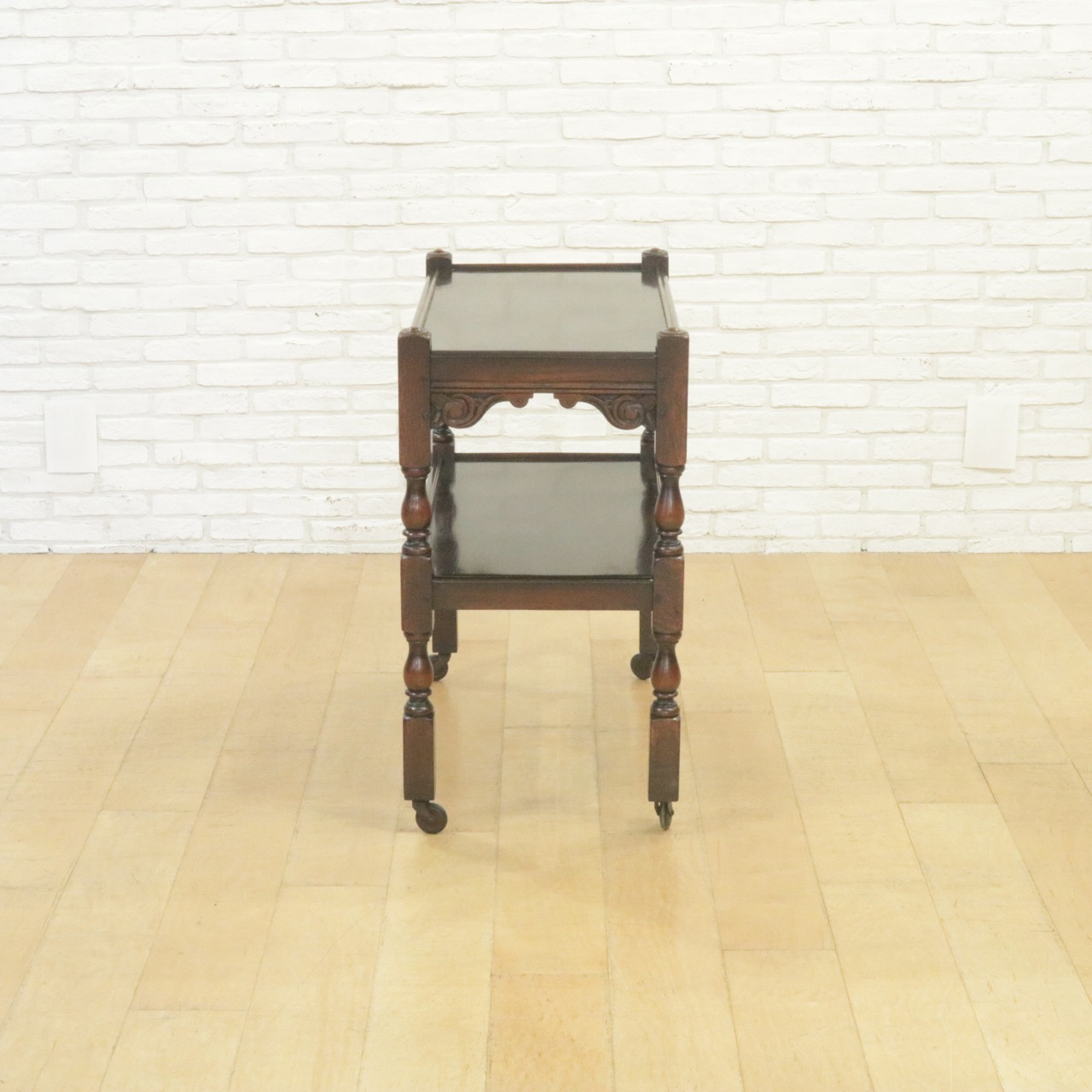 上下段の天板、またキャスターをつなぐ脚は小さなバラスター型。