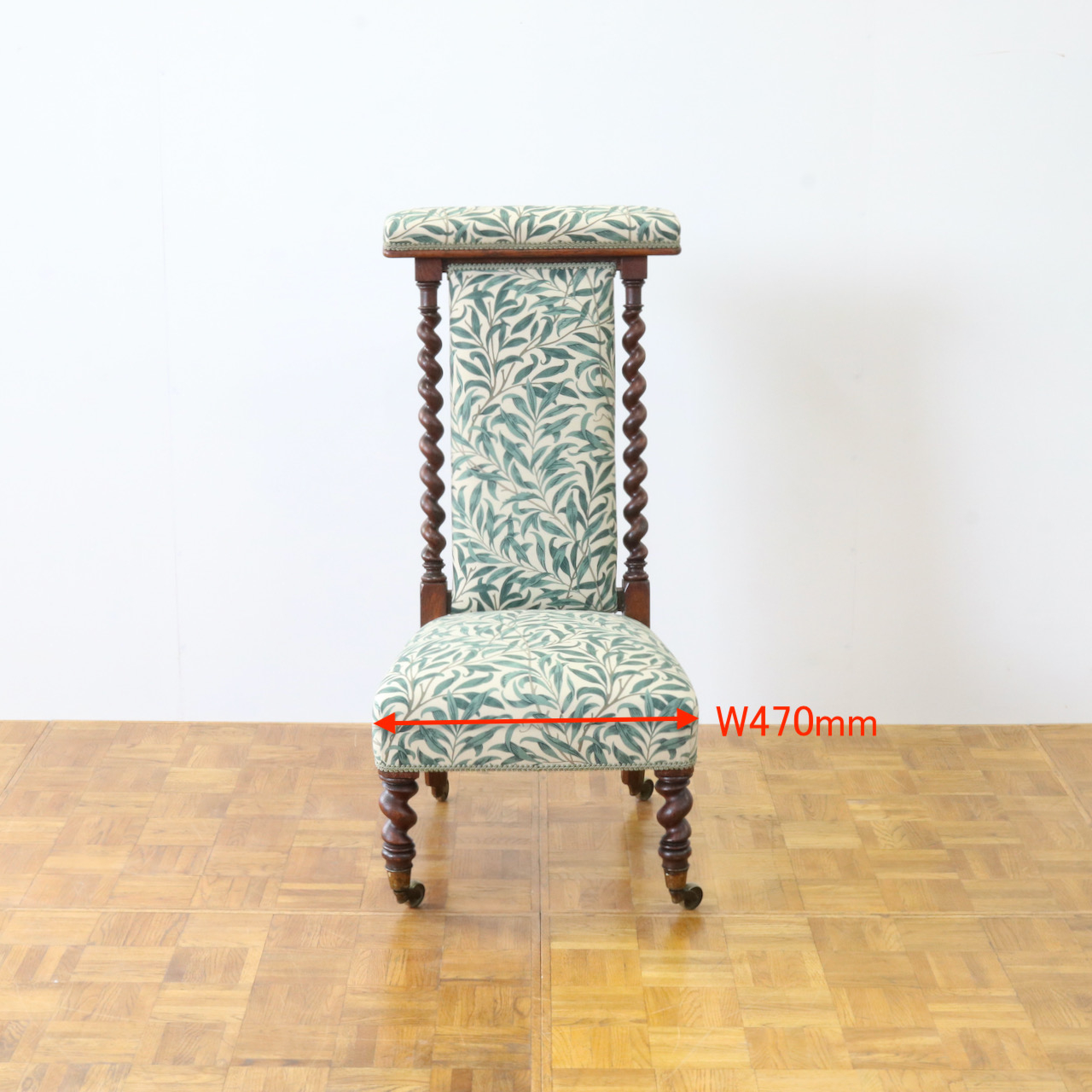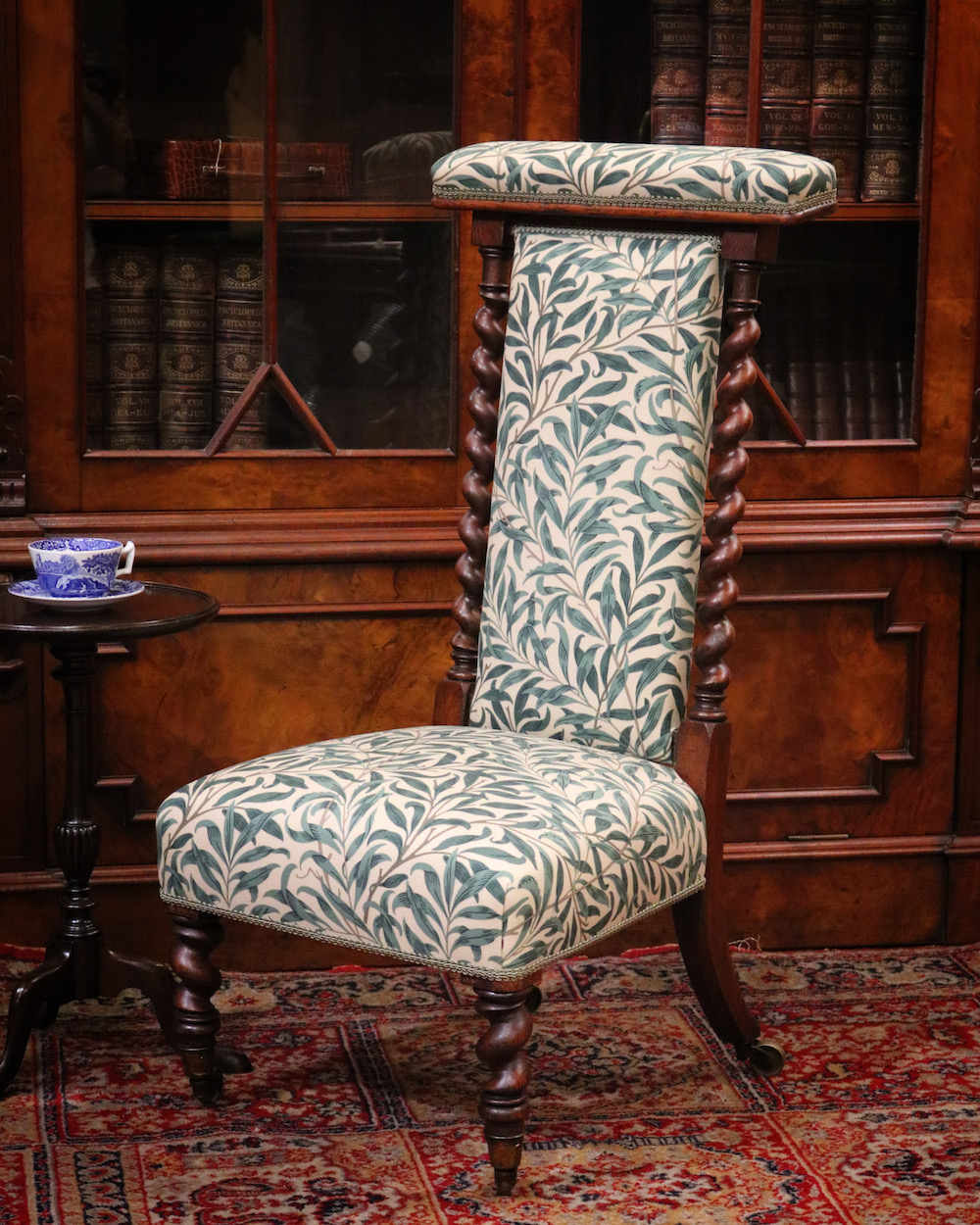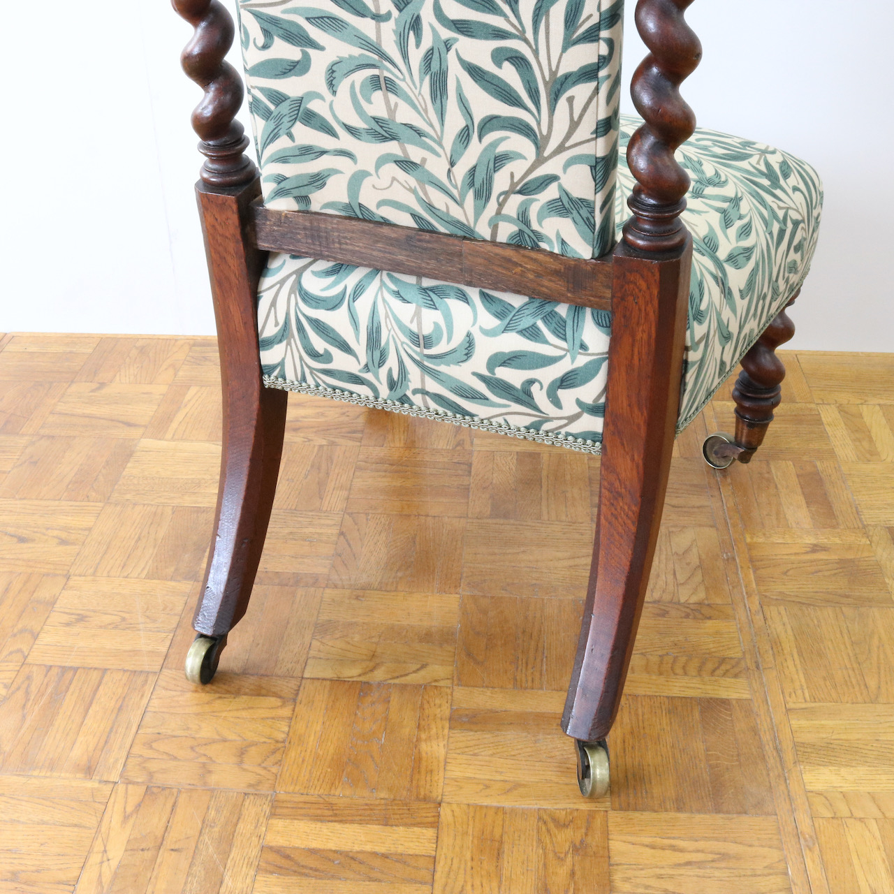 背や座面は1887年に壁紙として、後にプリント生地としても制作されたモリスの最高傑作ともいえるデザイン、「ウィローボウ」で張り替えました。モリスお気に入りのテムズ川岸の柳を、自然主義的アプローチから見事な模様に高められたデザインは、今日でも愛され続けています。