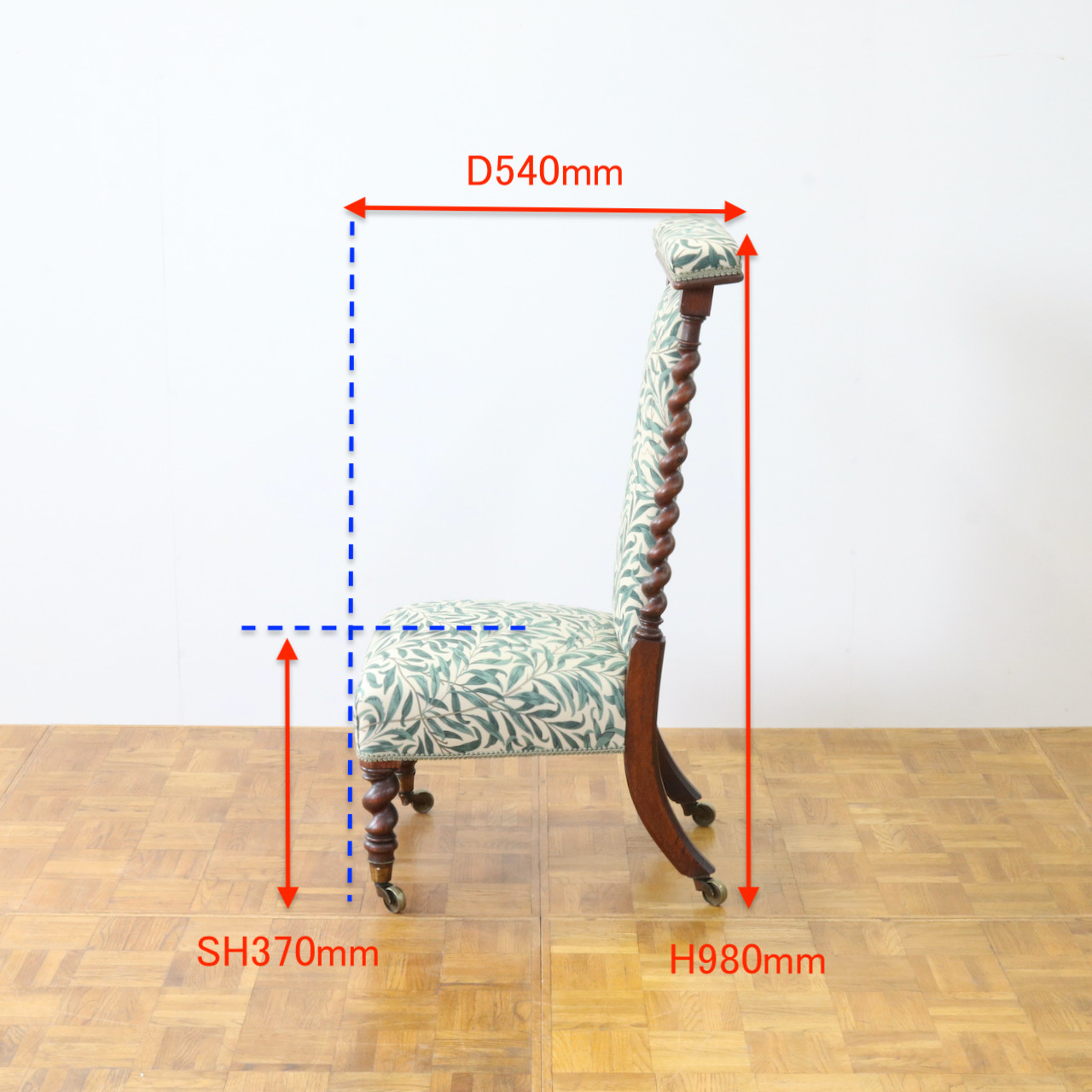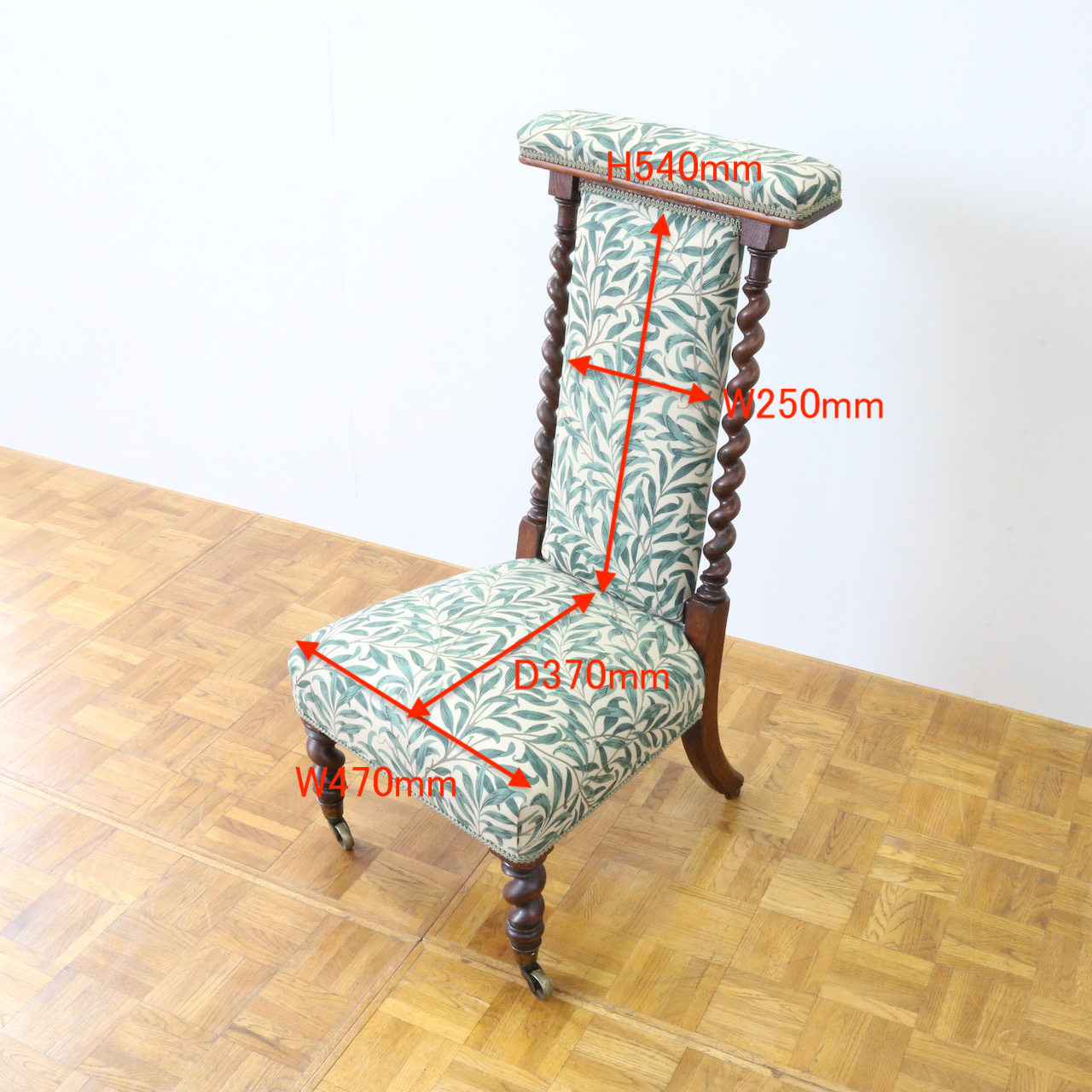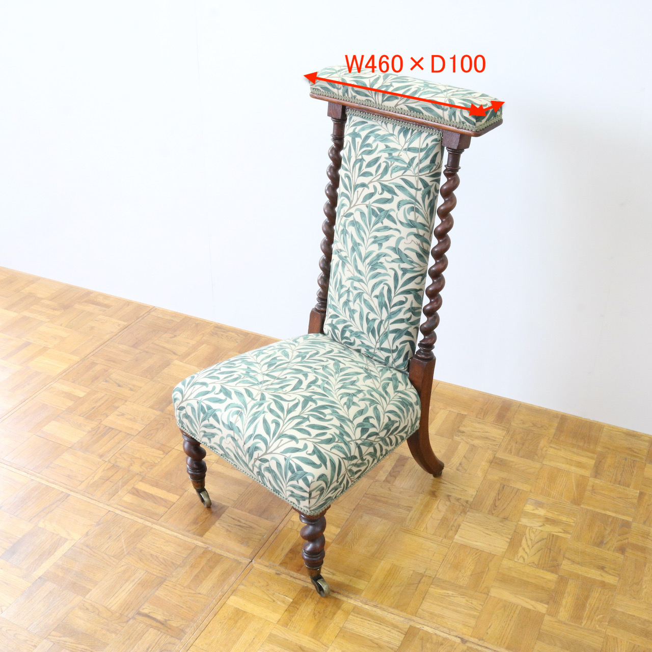 背や座面は1887年に壁紙として、後にプリント生地としても制作されたモリスの最高傑作ともいえるデザイン、「ウィローボウ」で張り替えました。モリスお気に入りのテムズ川岸の柳を、自然主義的アプローチから見事な模様に高められたデザインは、今日でも愛され続けています。