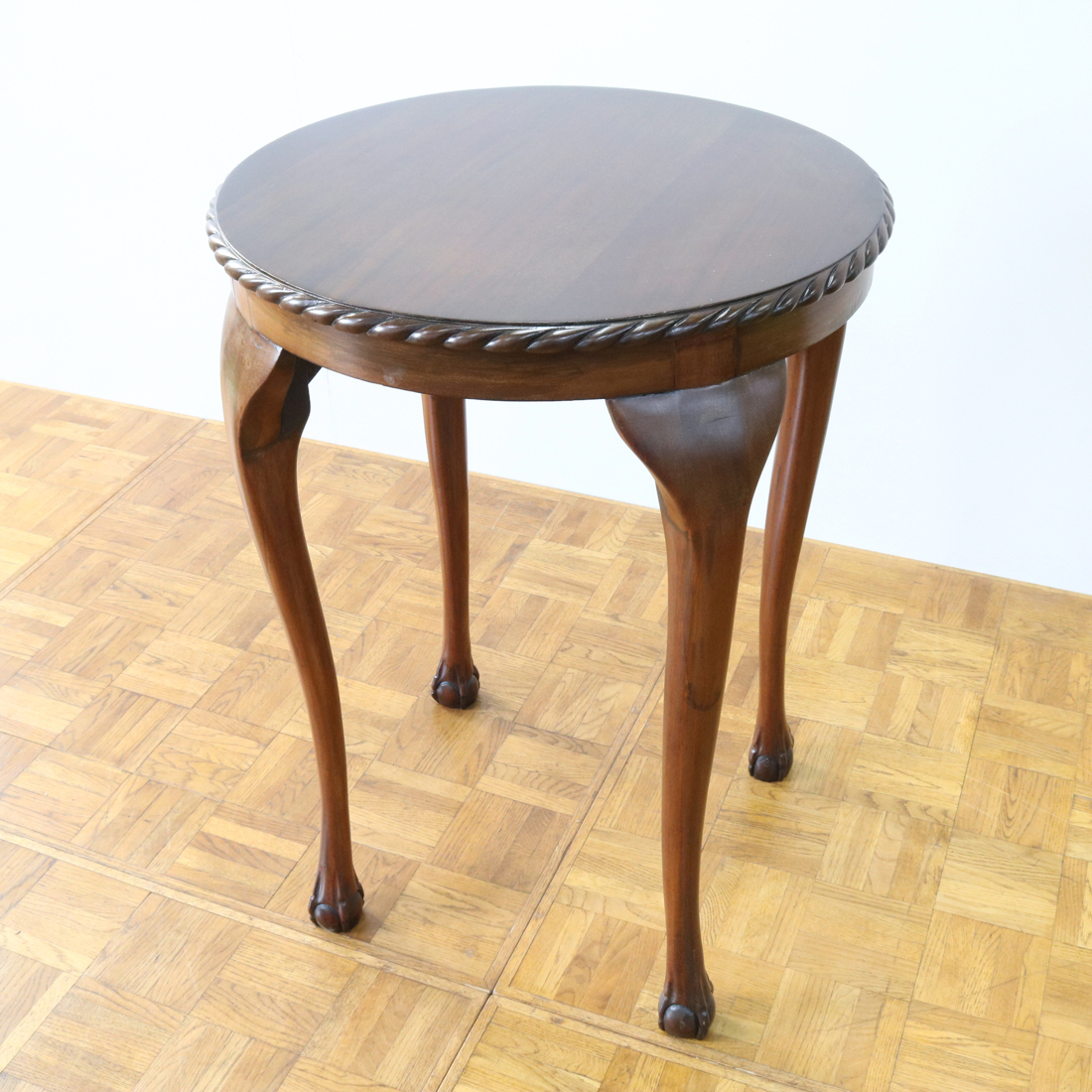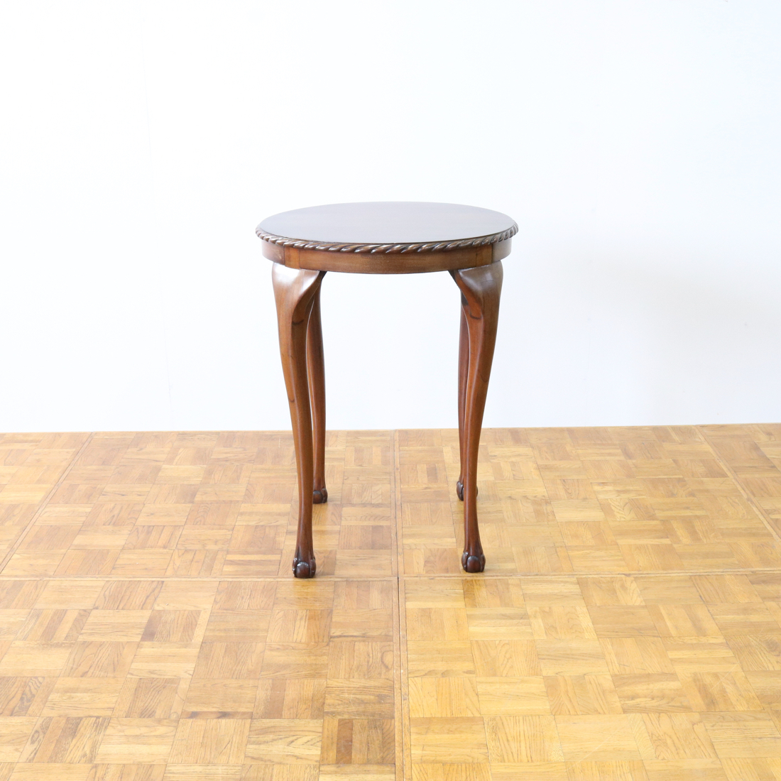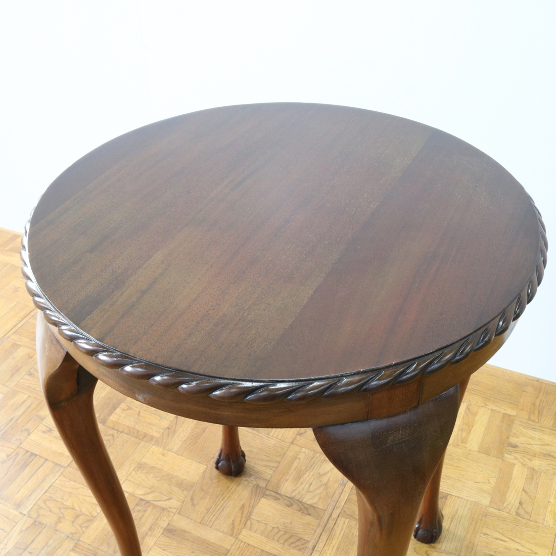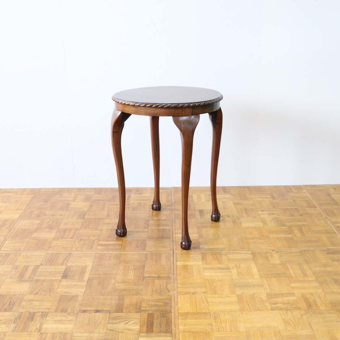 天板の縁はガドルーニングと呼ばれる彫刻装飾、脚はなめらかなカーブを描き、ボウルアンドクロウのデザインが施されています。小さなサイズで、お玄関やリビングルームの花台、お食事の際のサブテーブルなどとしてもおすすめです。