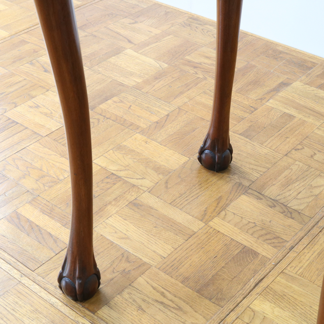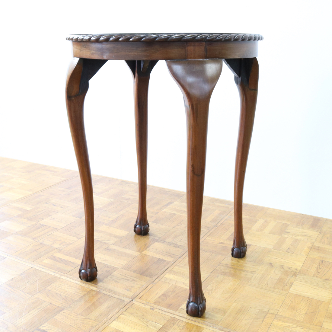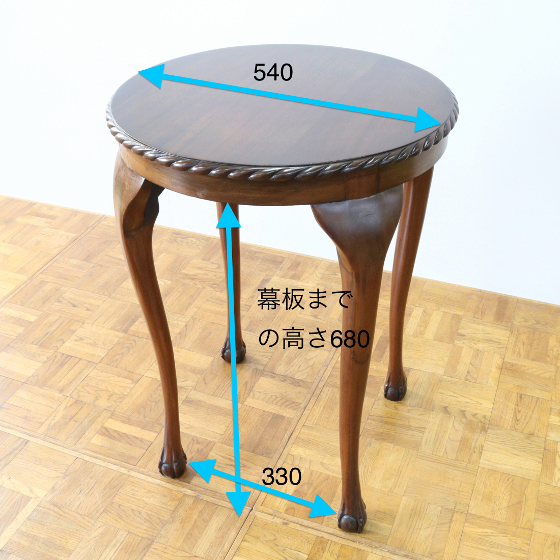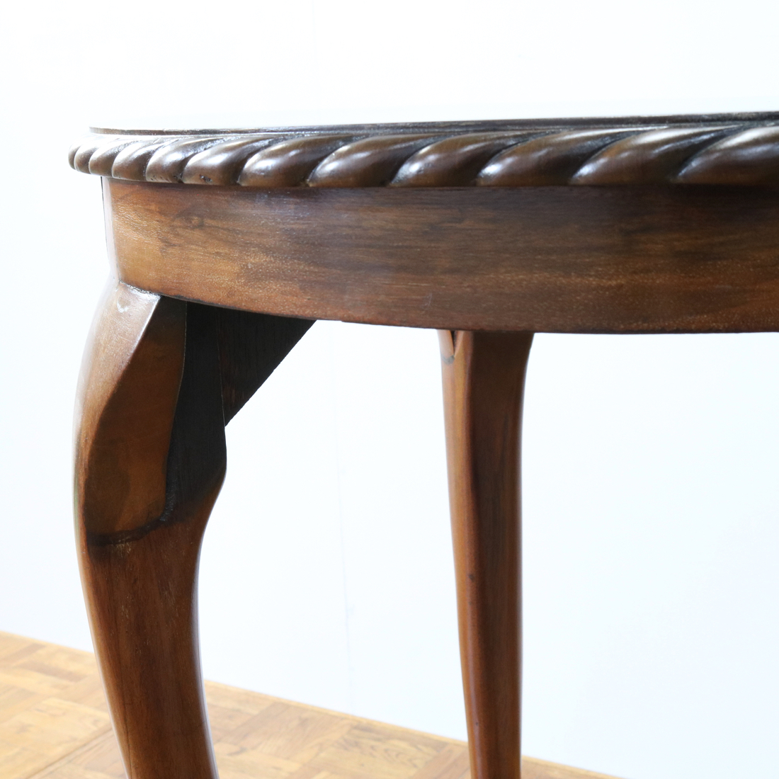 天板の縁はガドルーニングと呼ばれる彫刻装飾、脚はなめらかなカーブを描き、ボウルアンドクロウのデザインが施されています。小さなサイズで、お玄関やリビングルームの花台、お食事の際のサブテーブルなどとしてもおすすめです。