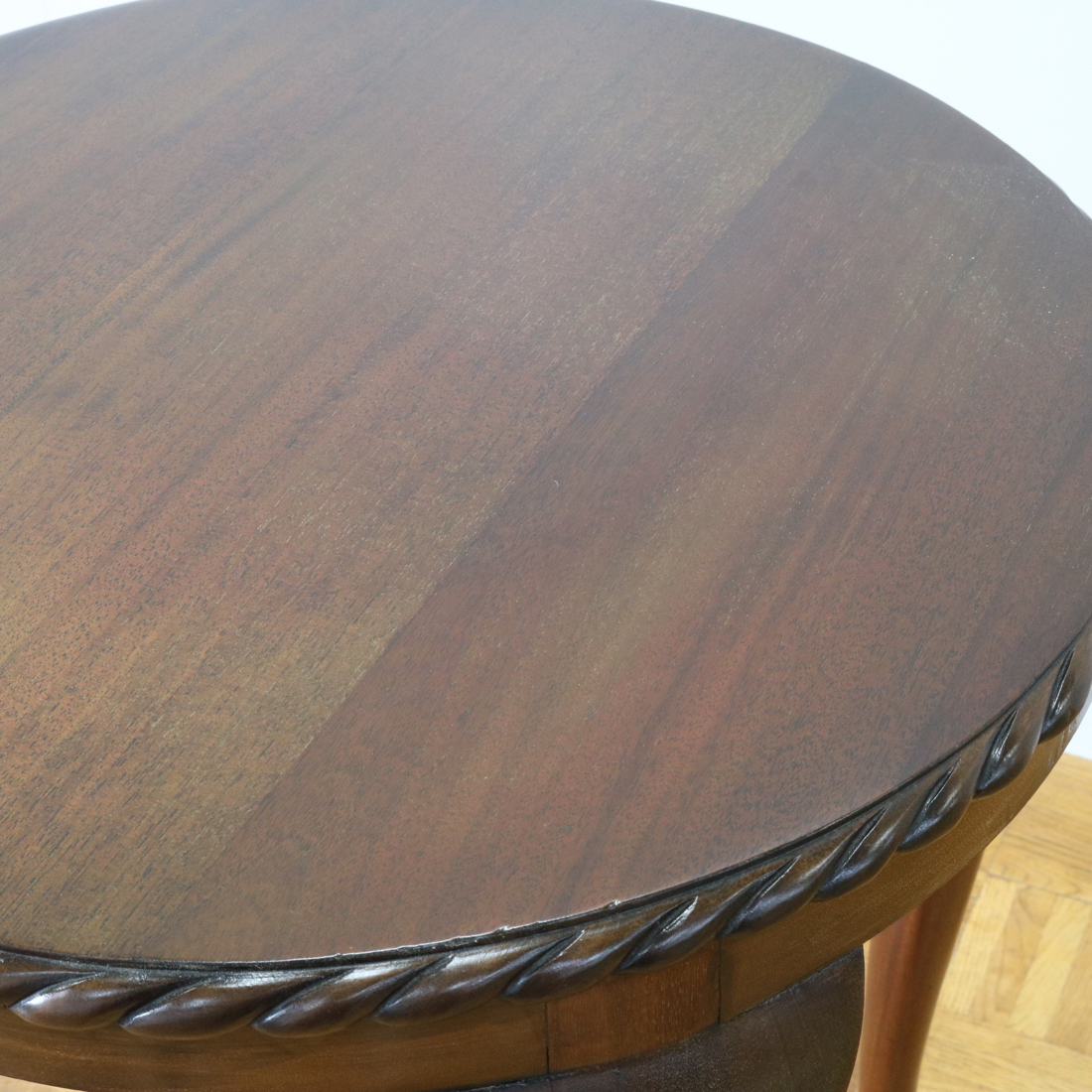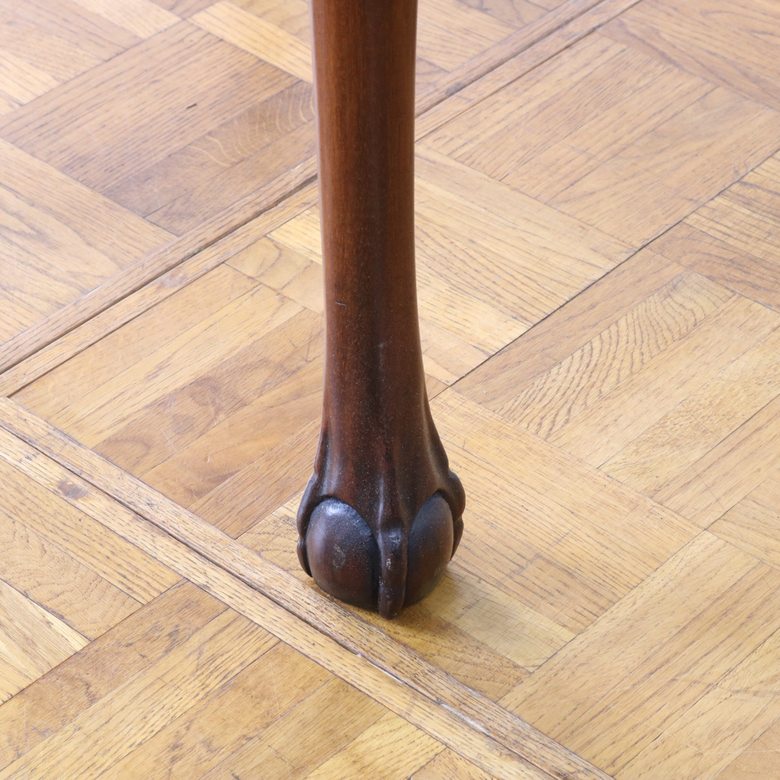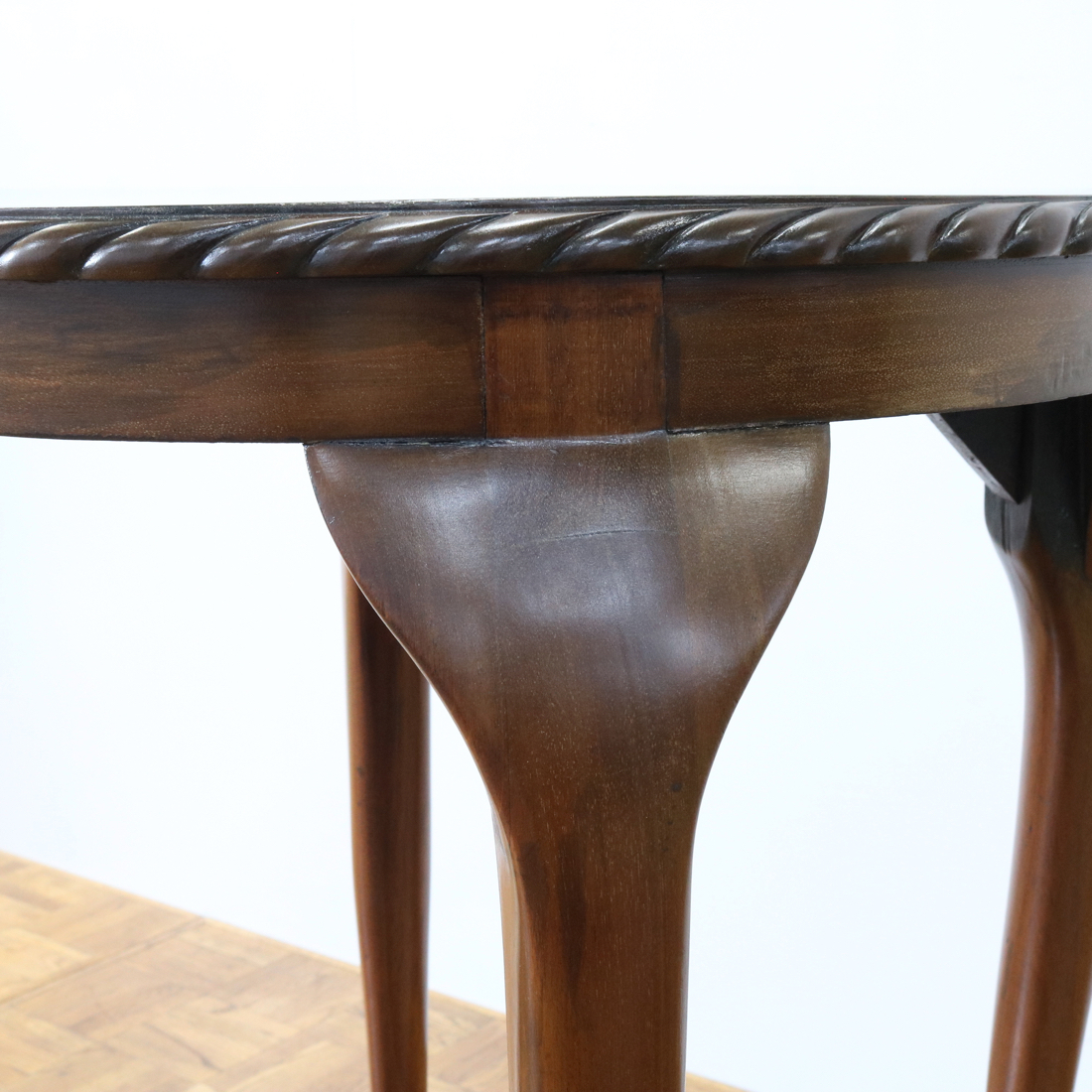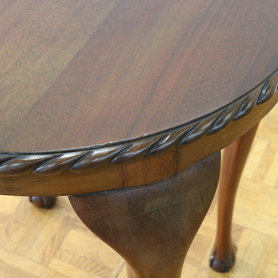 天板の縁はガドルーニングと呼ばれる彫刻装飾、脚はなめらかなカーブを描き、ボウルアンドクロウのデザインが施されています。小さなサイズで、お玄関やリビングルームの花台、お食事の際のサブテーブルなどとしてもおすすめです。