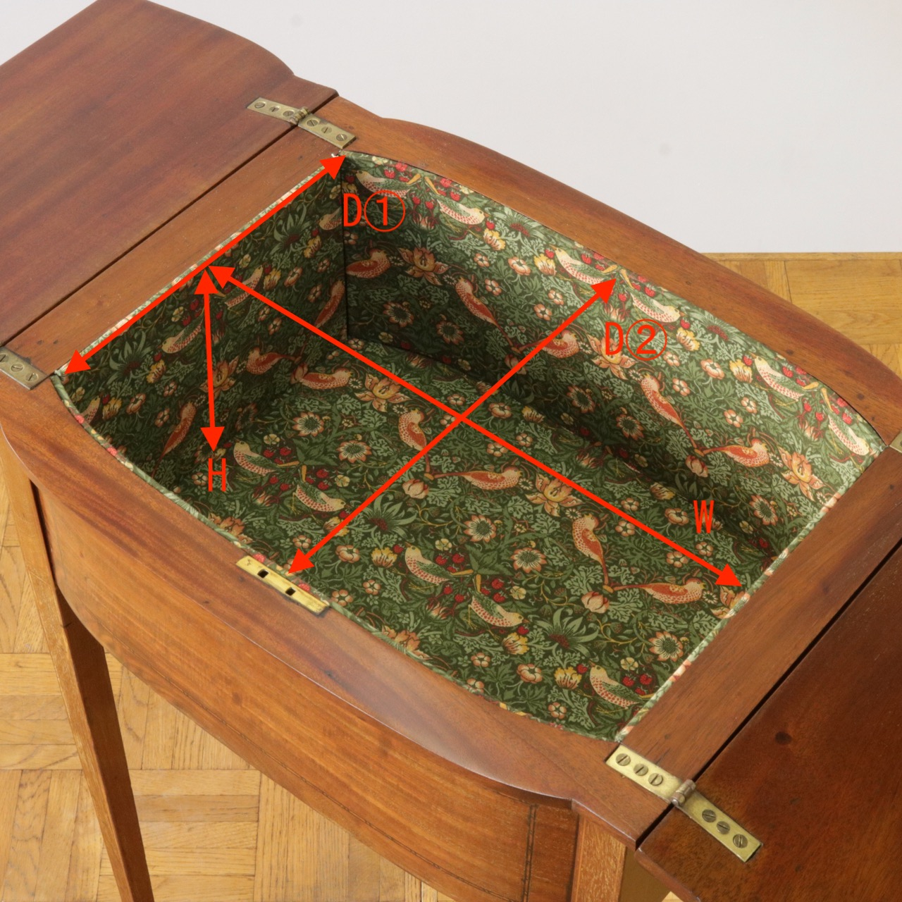 天板を開くとパッと目に入る内部の生地。ウィリアム・モリスの"いちご泥棒"の生地を用いました。
