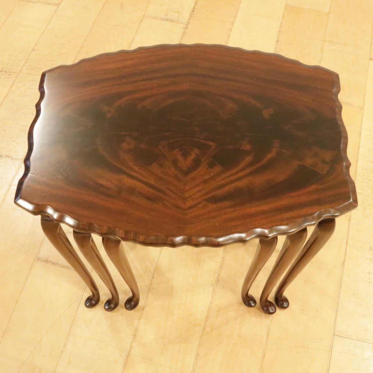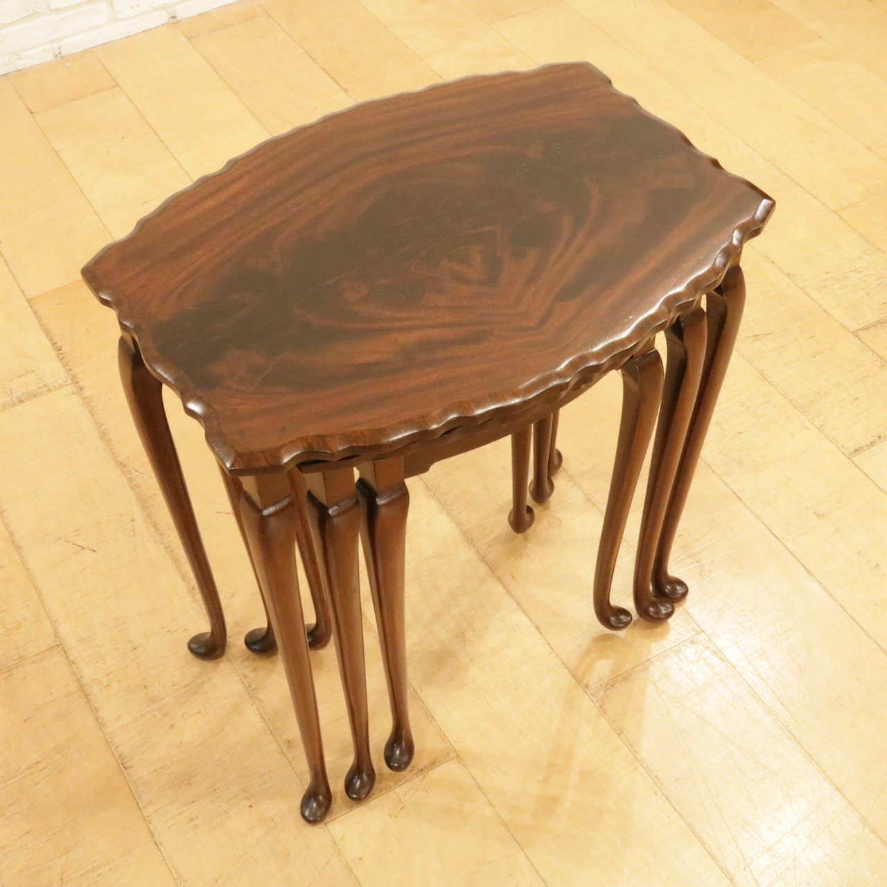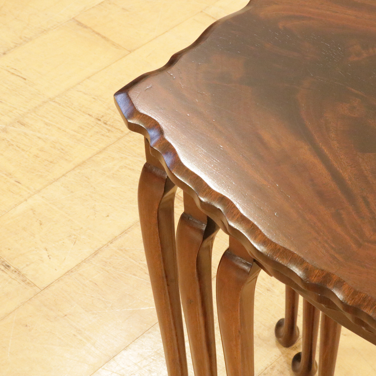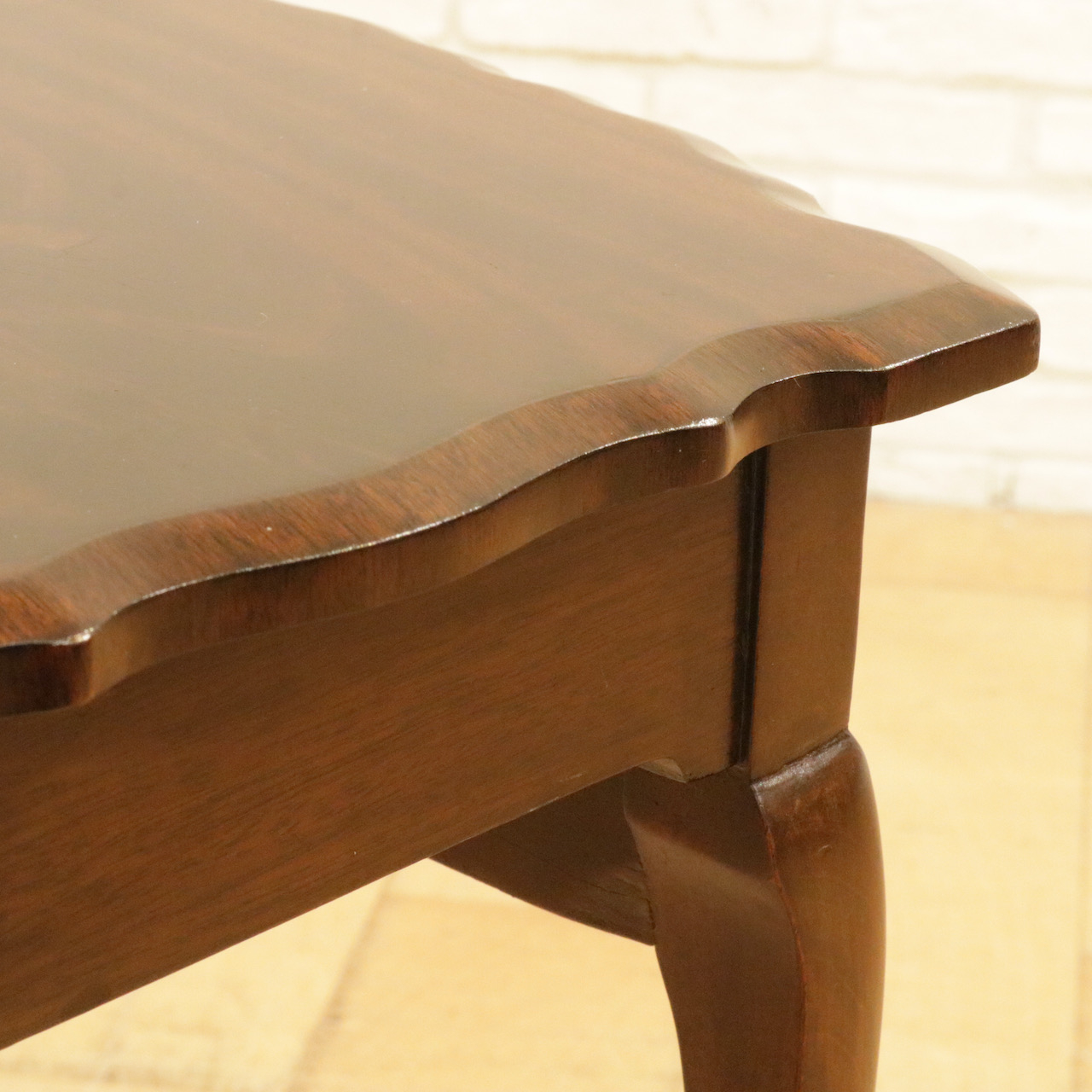 波型の天板にマホガニーの杢目が際立ち、カブリオールレッグの脚元も優雅な佇まい。