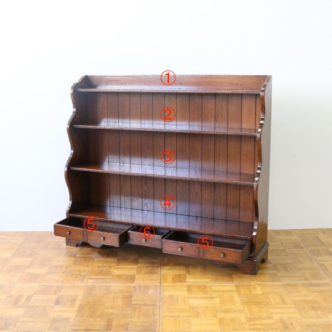波のような側板がかわいらしく、下段にいくにつれ奥行きが深くなっていく設計も使い勝手の良さがあります。