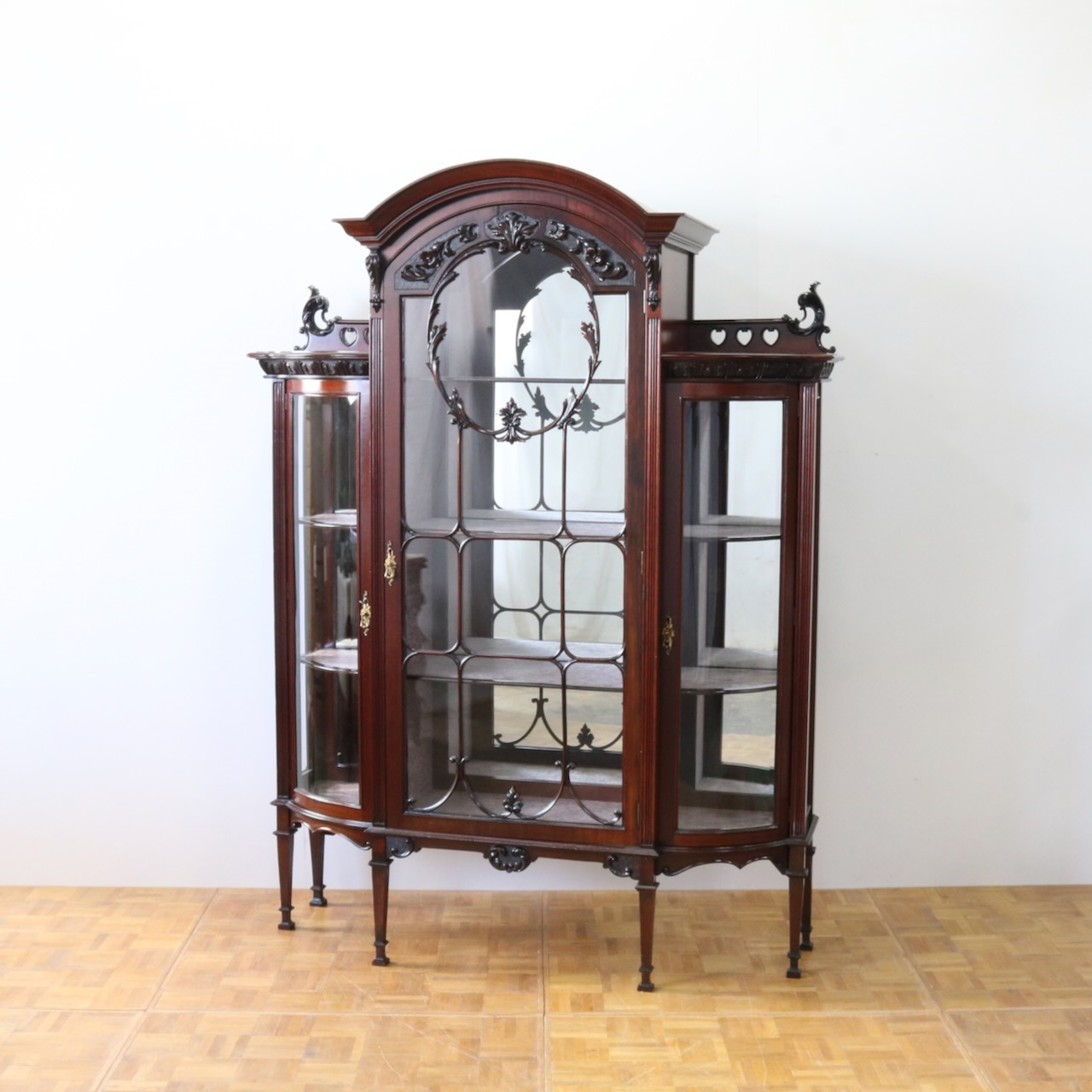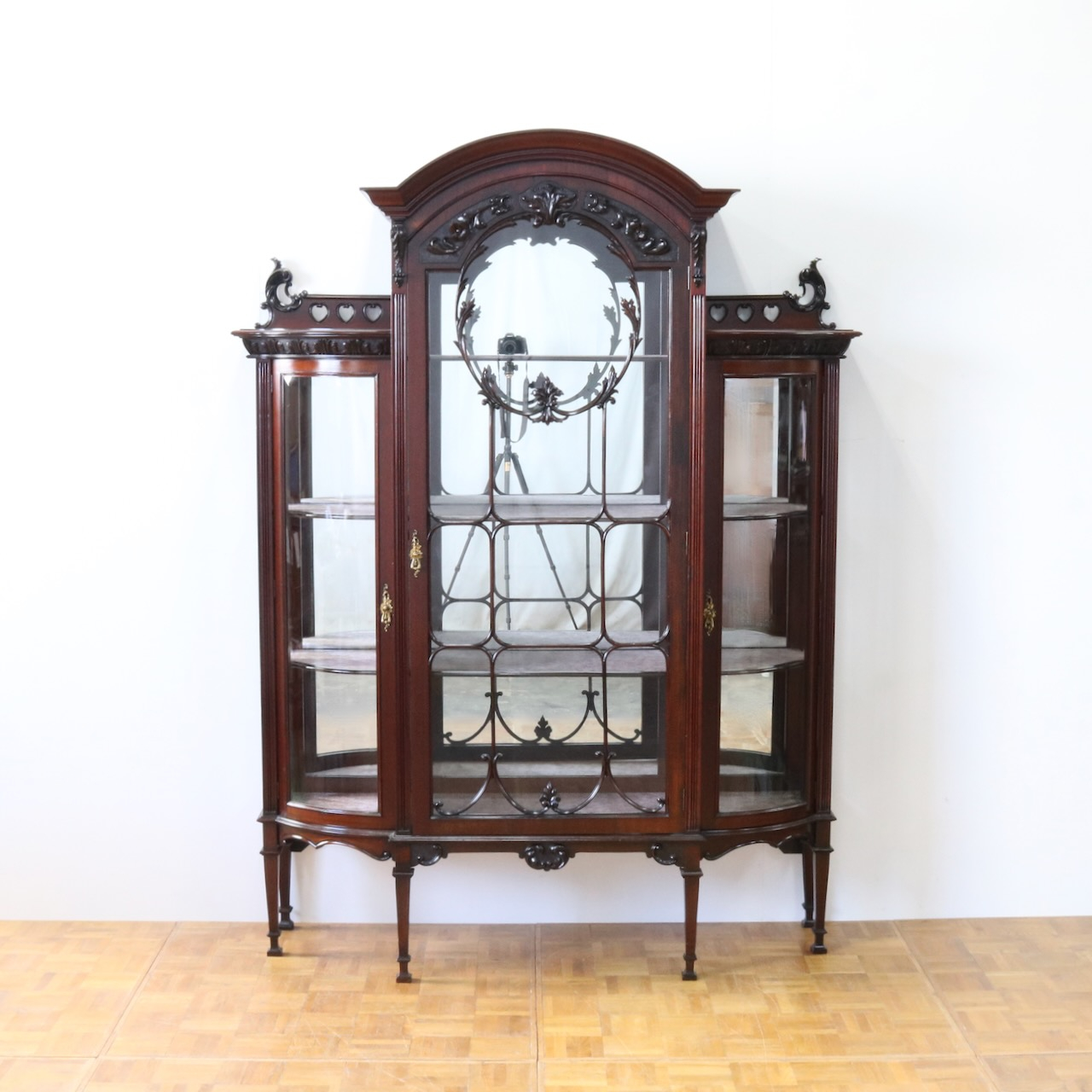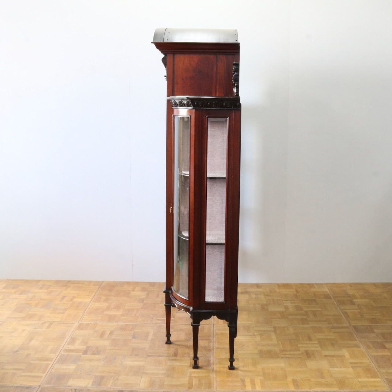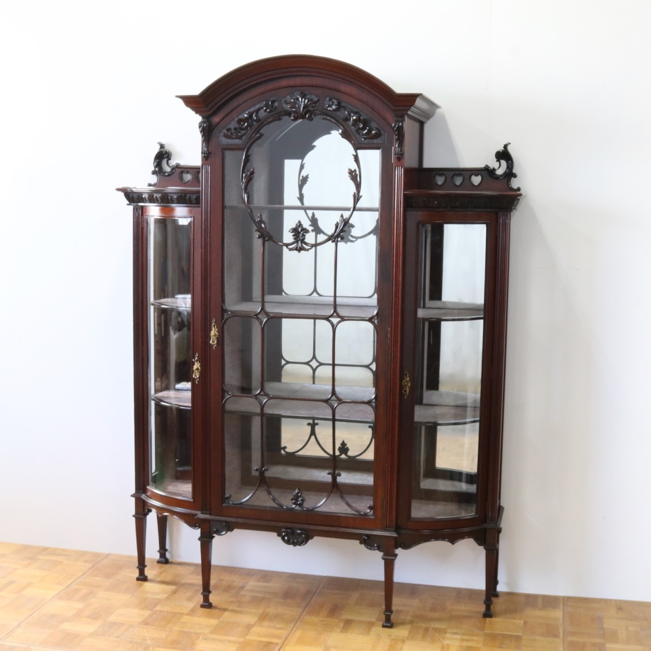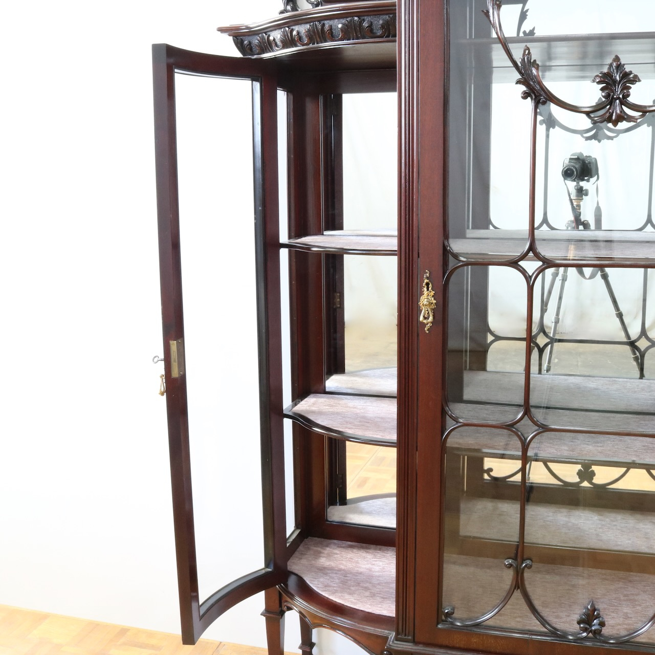 内部はミラー張りで飾るものも引き立てます。上品な佇まい、マホガニーの深く艶のある風合いにも惹かれます。