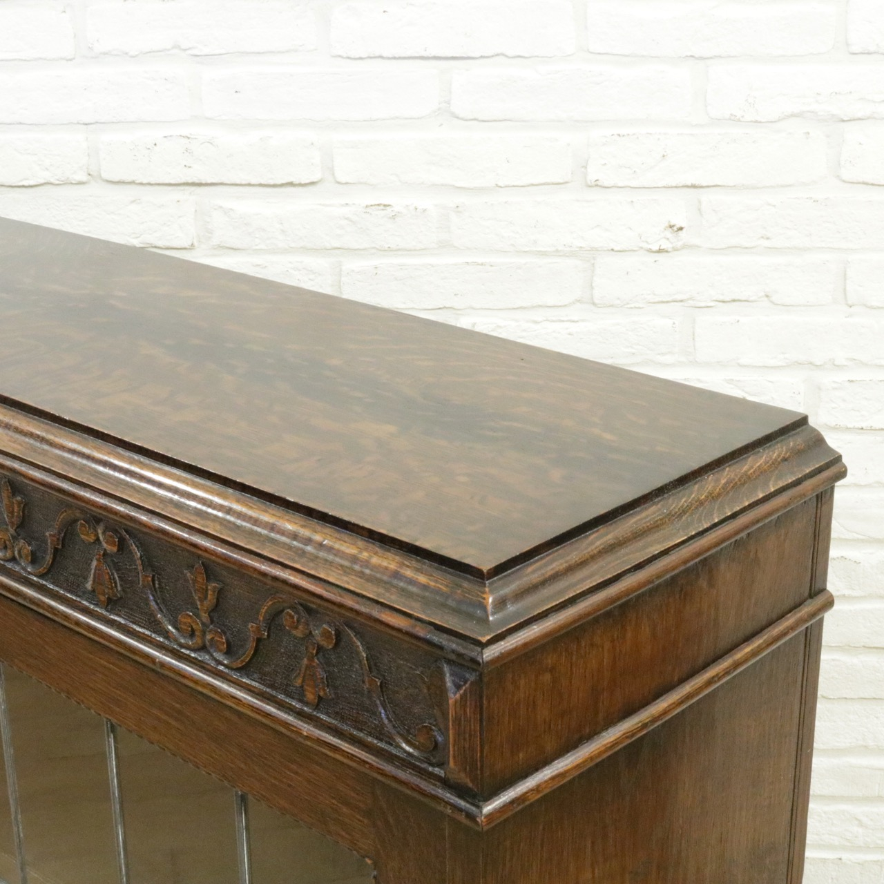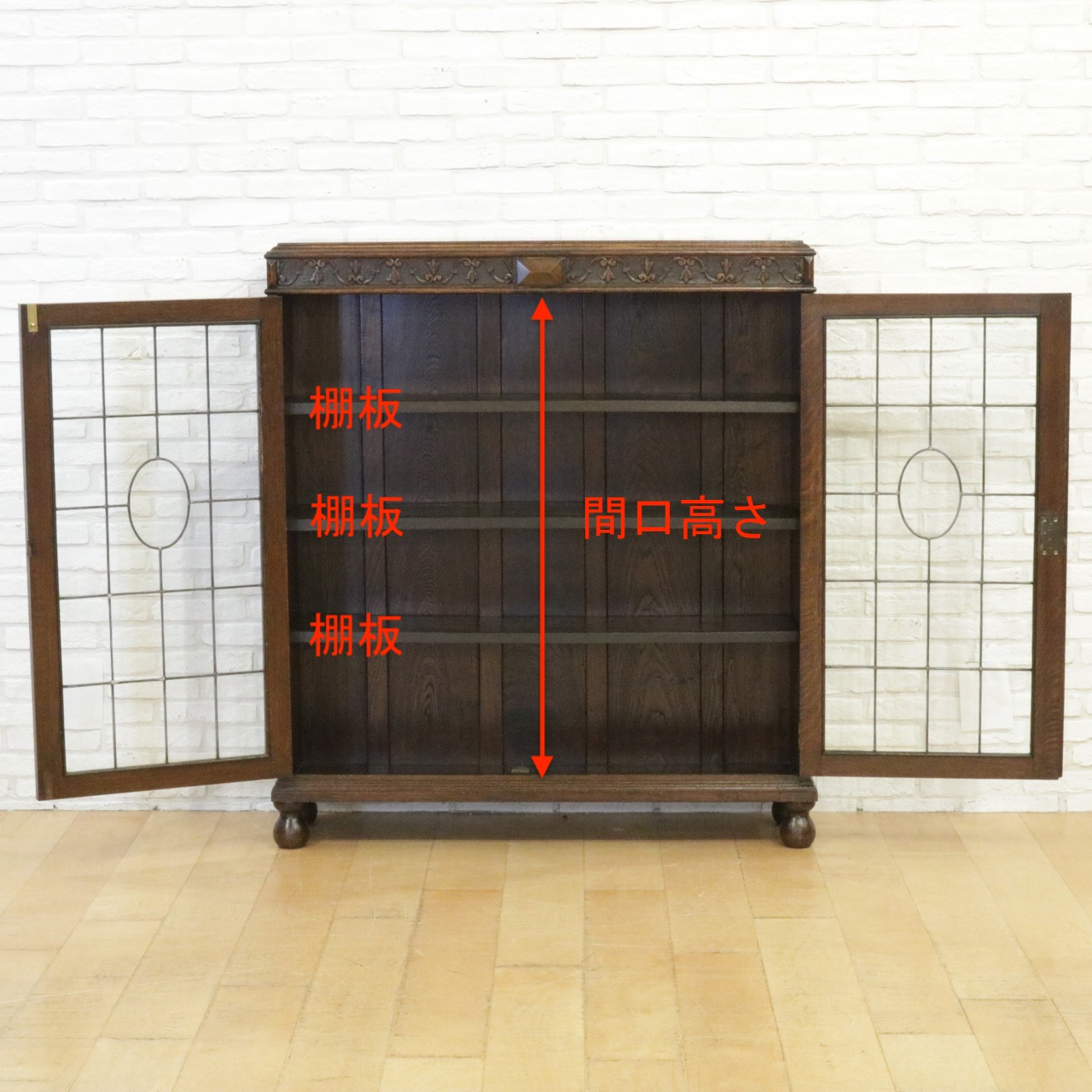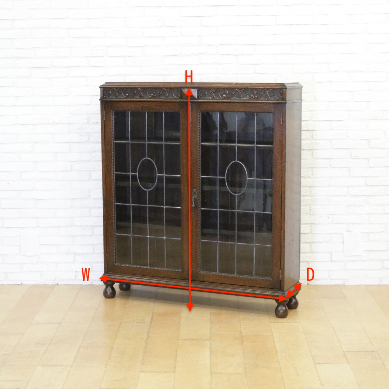 配送料の目安 ▶︎1930年代、オーク材のブックケース 。ステンドグラス の趣のある扉とハスクの彫刻が目を引くデザイン。奥行き浅めのサイズで圧迫感なくセッティングできるのもポイントです。
