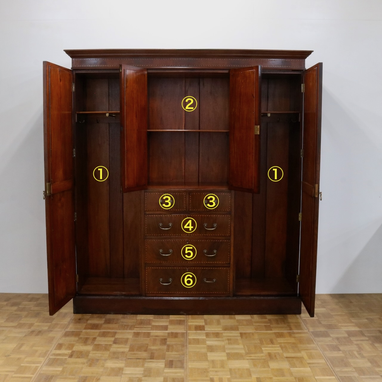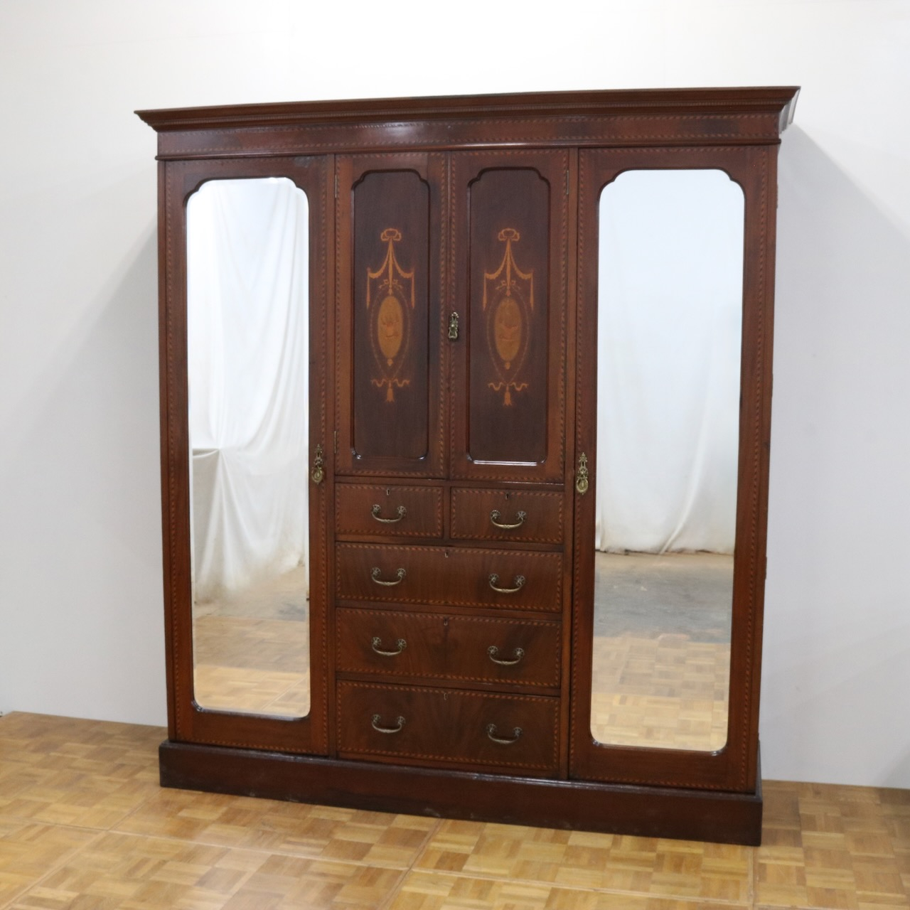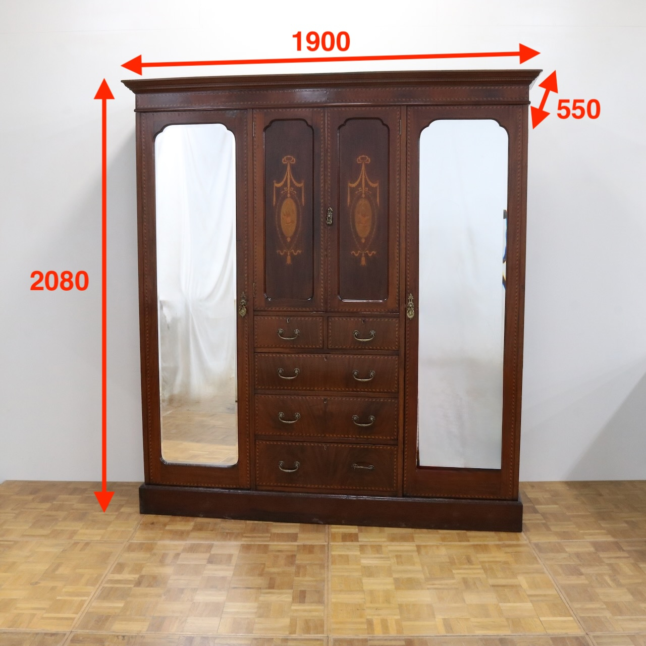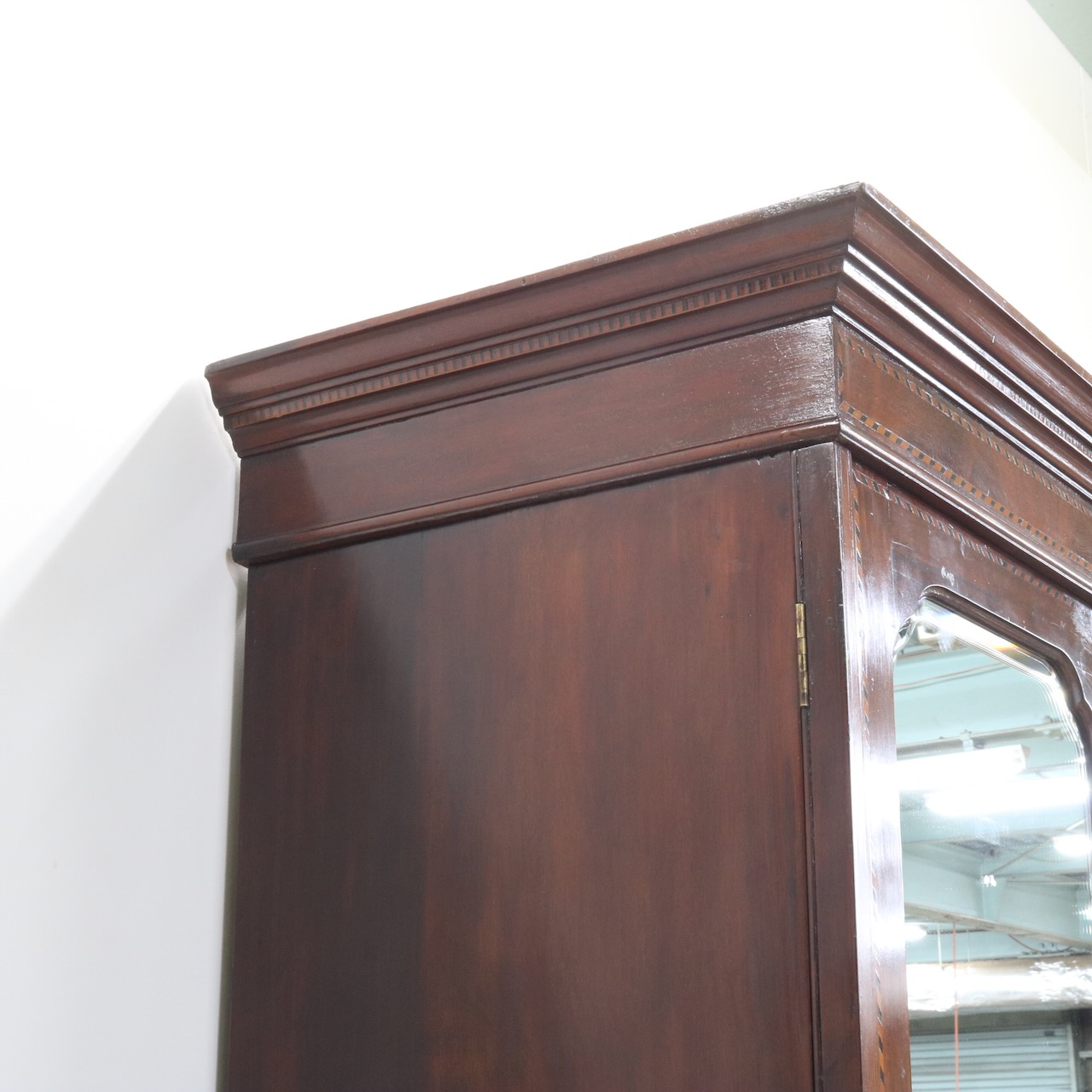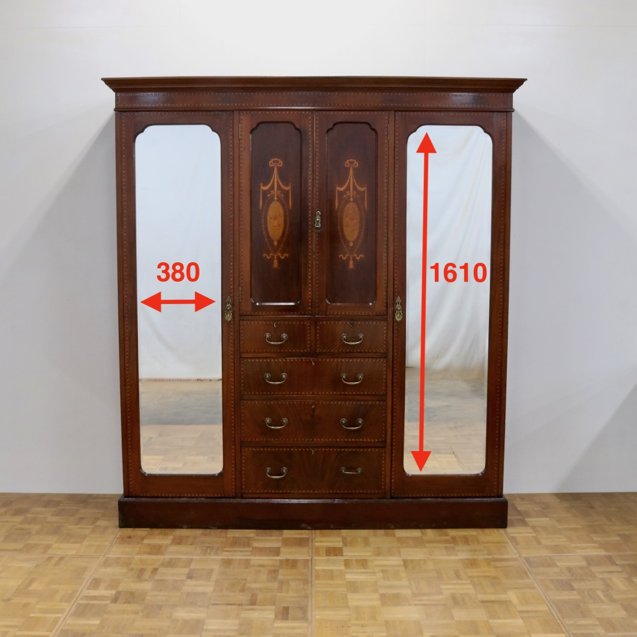 1920年代、マホガニーのワードローブ。花やリボンのインレイが施された優雅なデザイン。たっぷりとした収納力で衣類一式を美しく収納出来ます。ミラー付きなので身支度を整える時にも便利です。