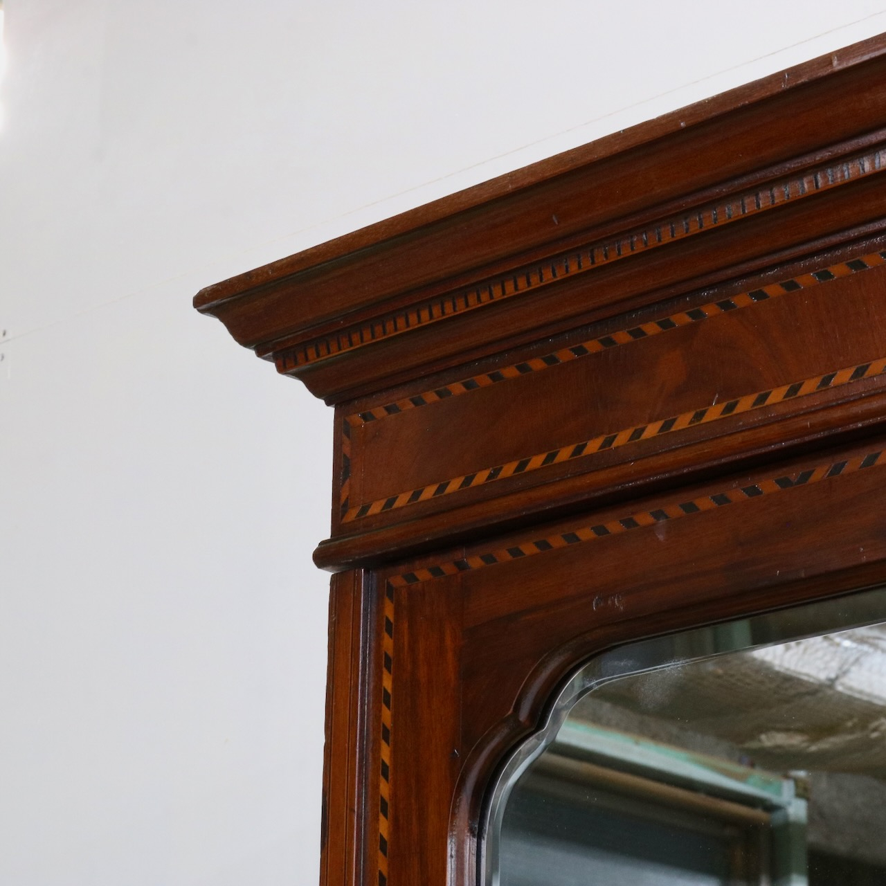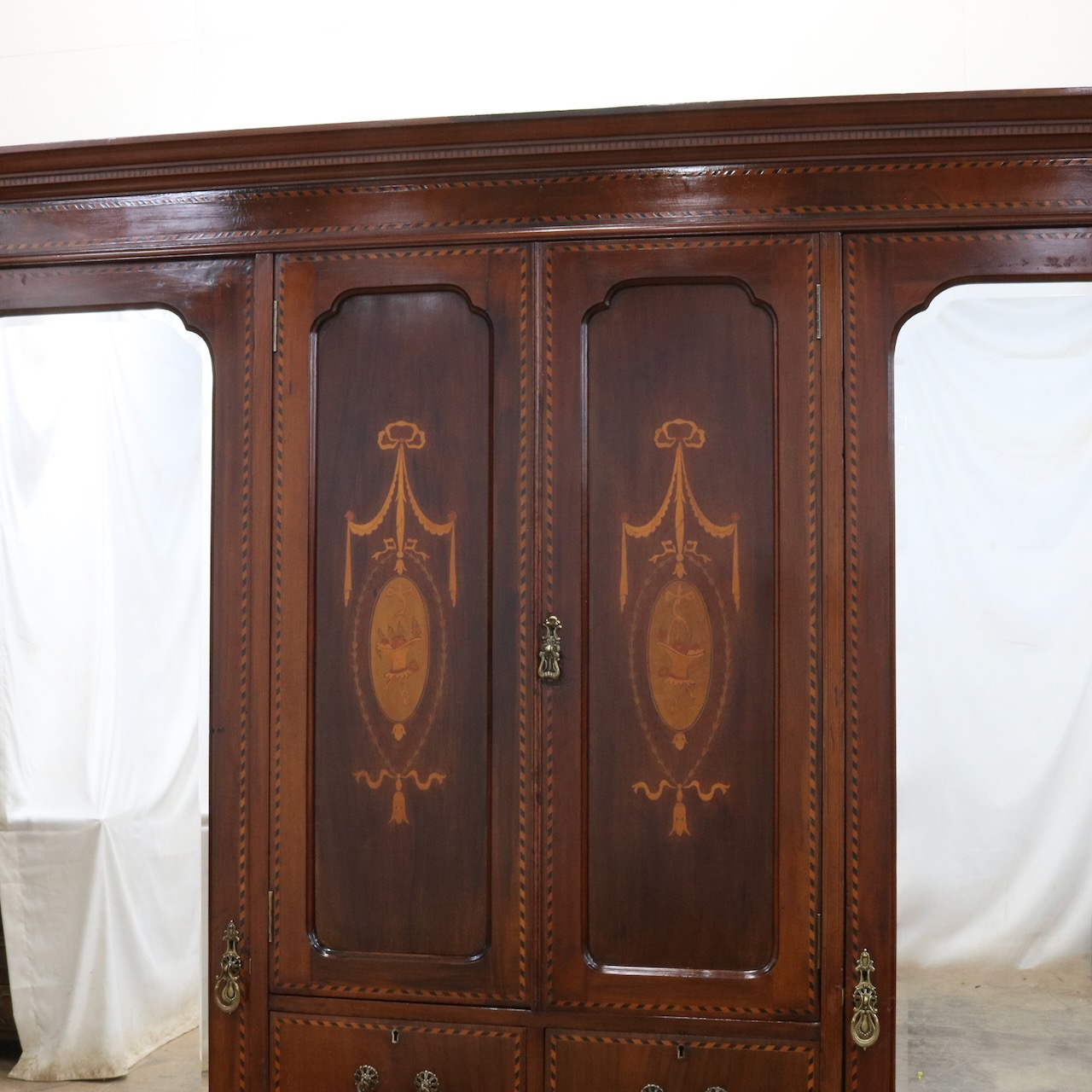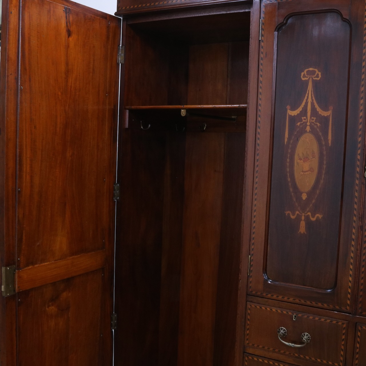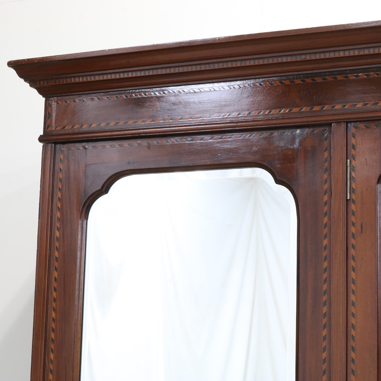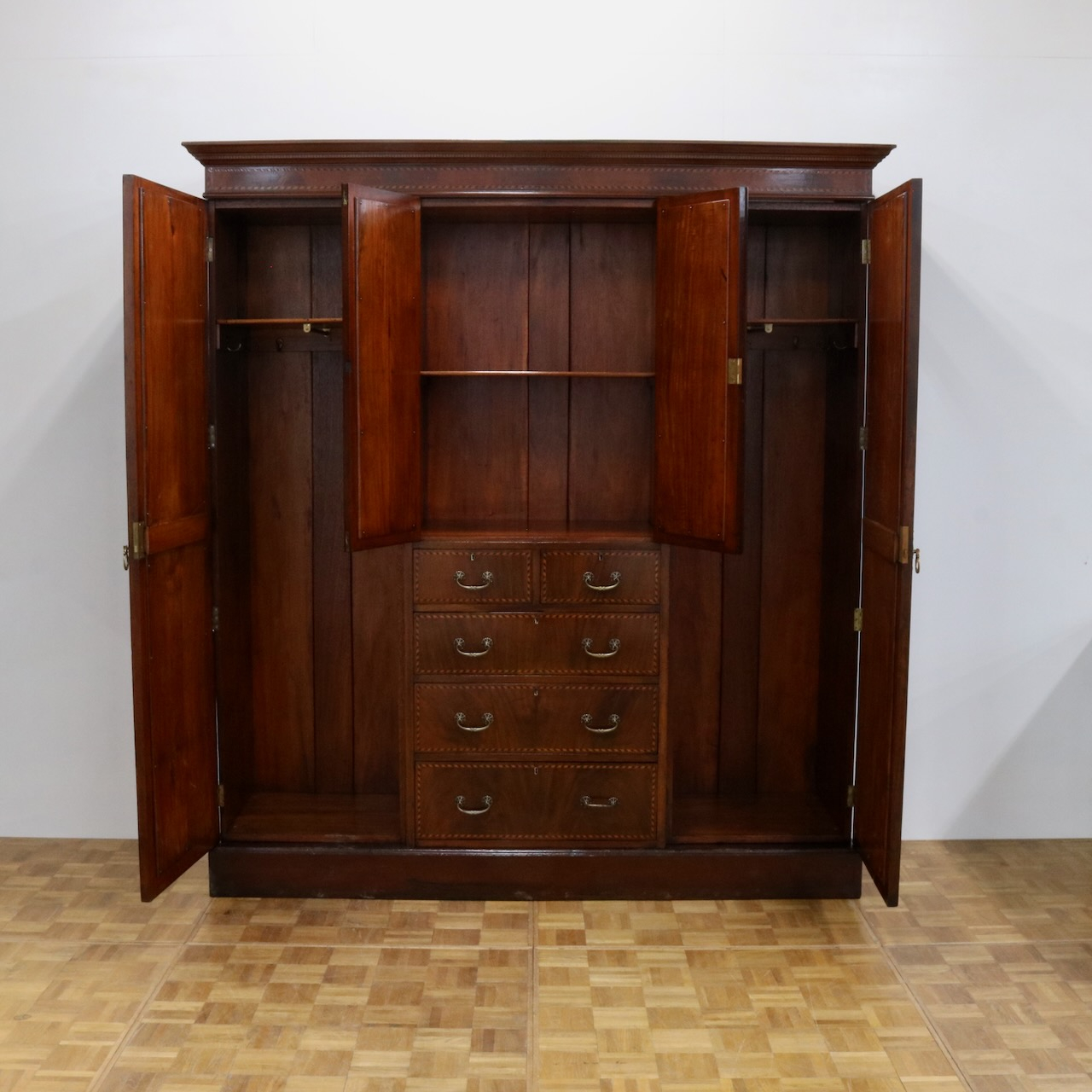 1920年代、マホガニーのワードローブ。花やリボンのインレイが施された優雅なデザイン。たっぷりとした収納力で衣類一式を美しく収納出来ます。ミラー付きなので身支度を整える時にも便利です。