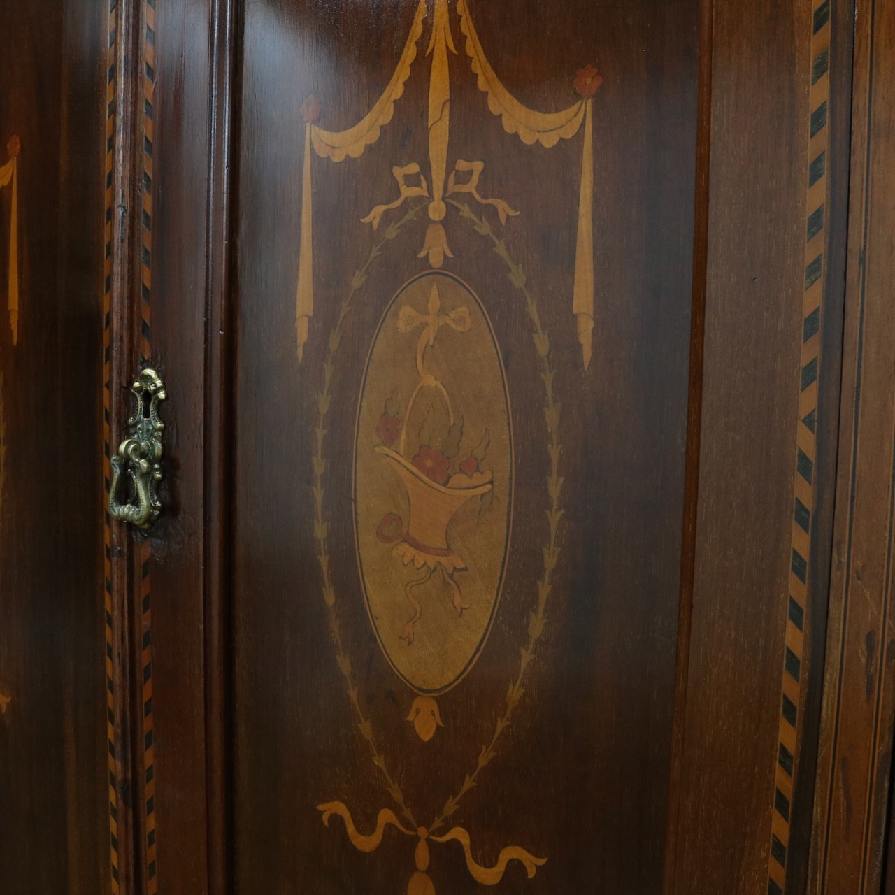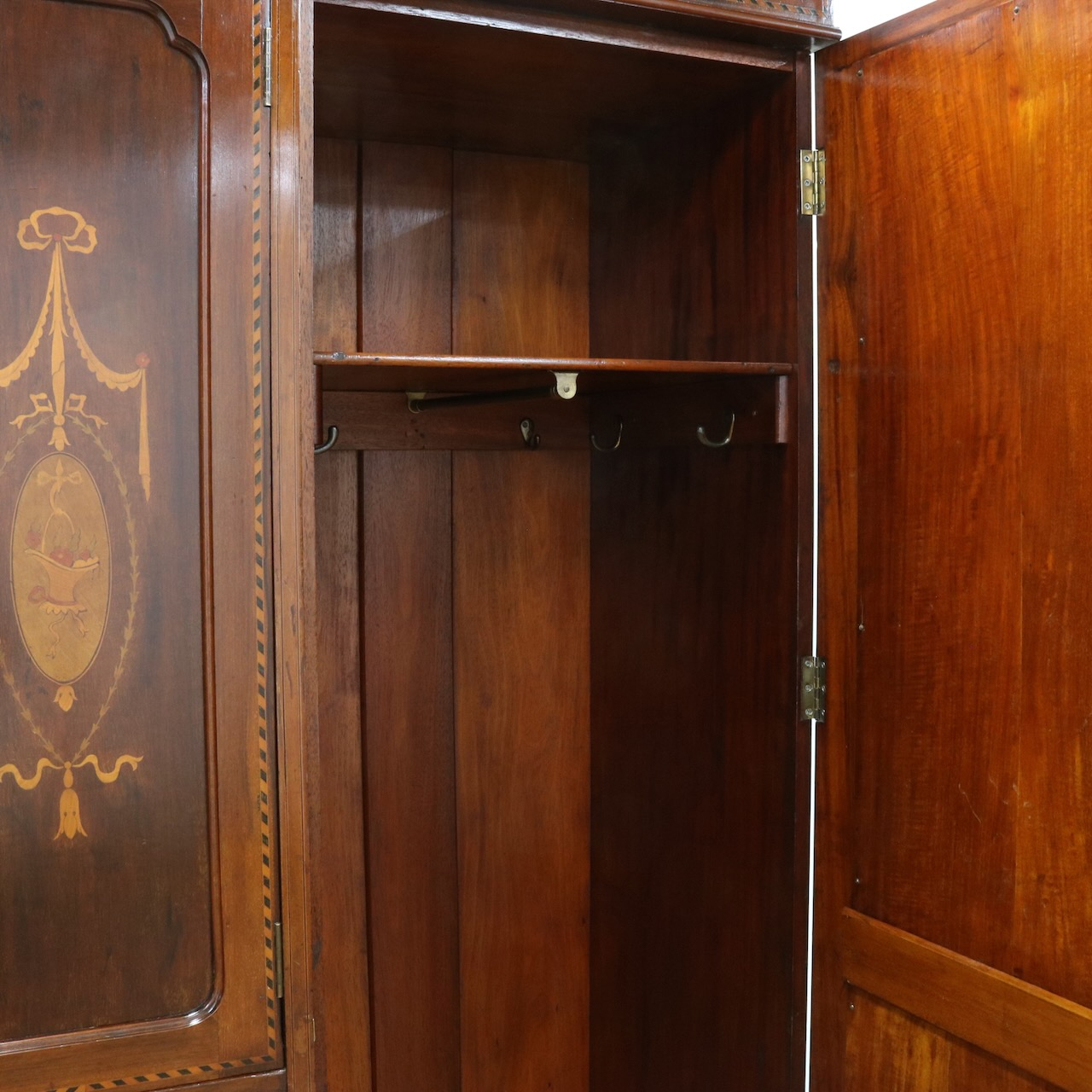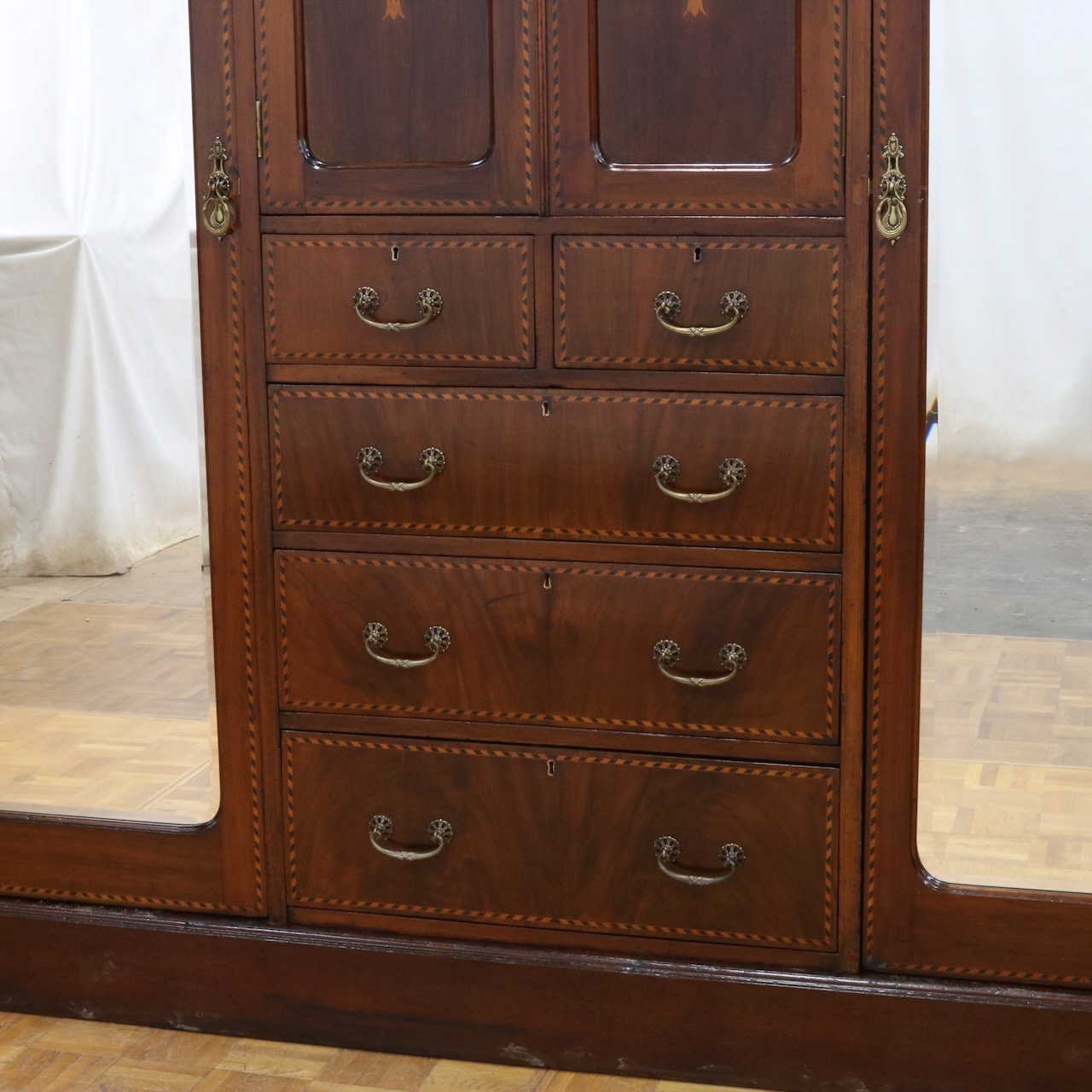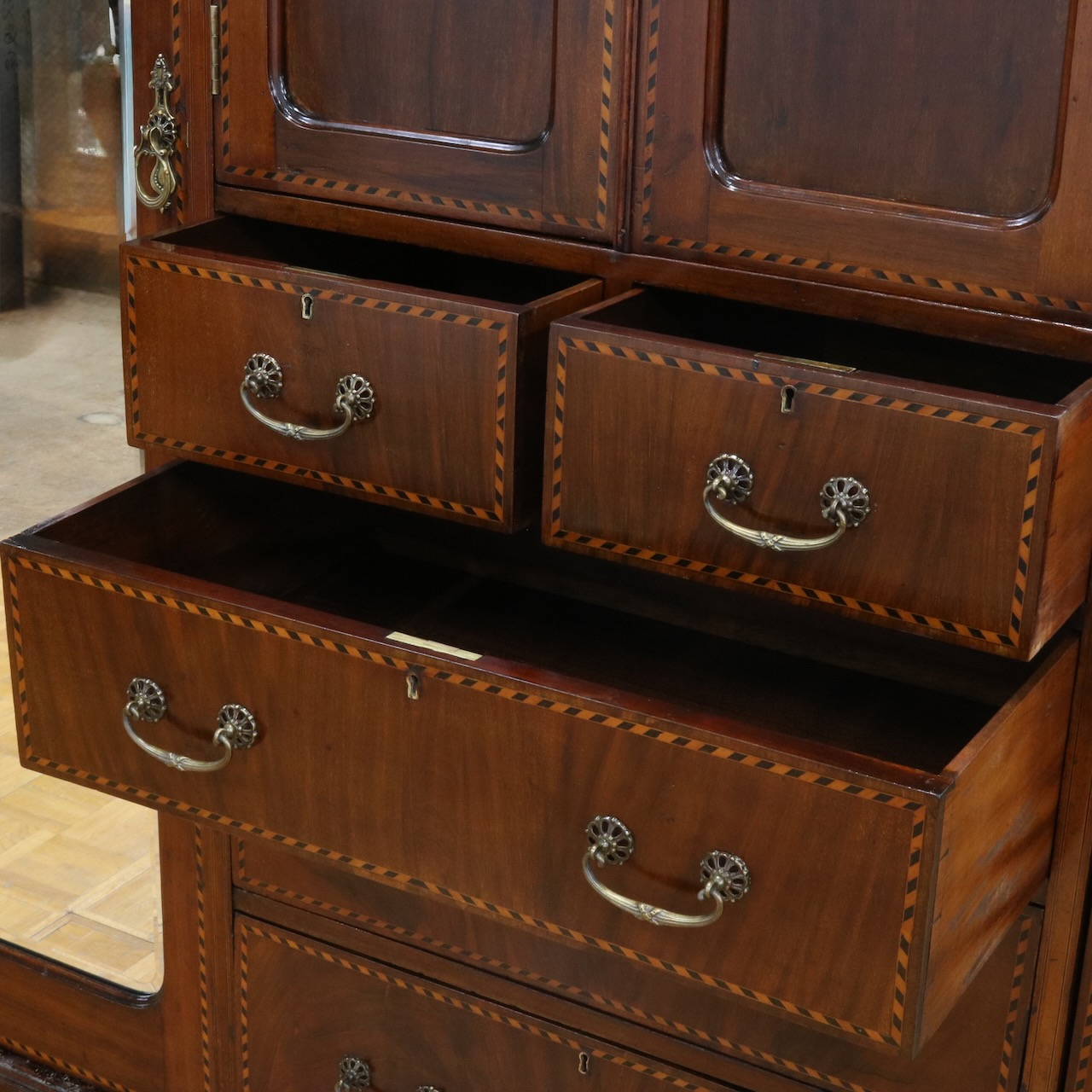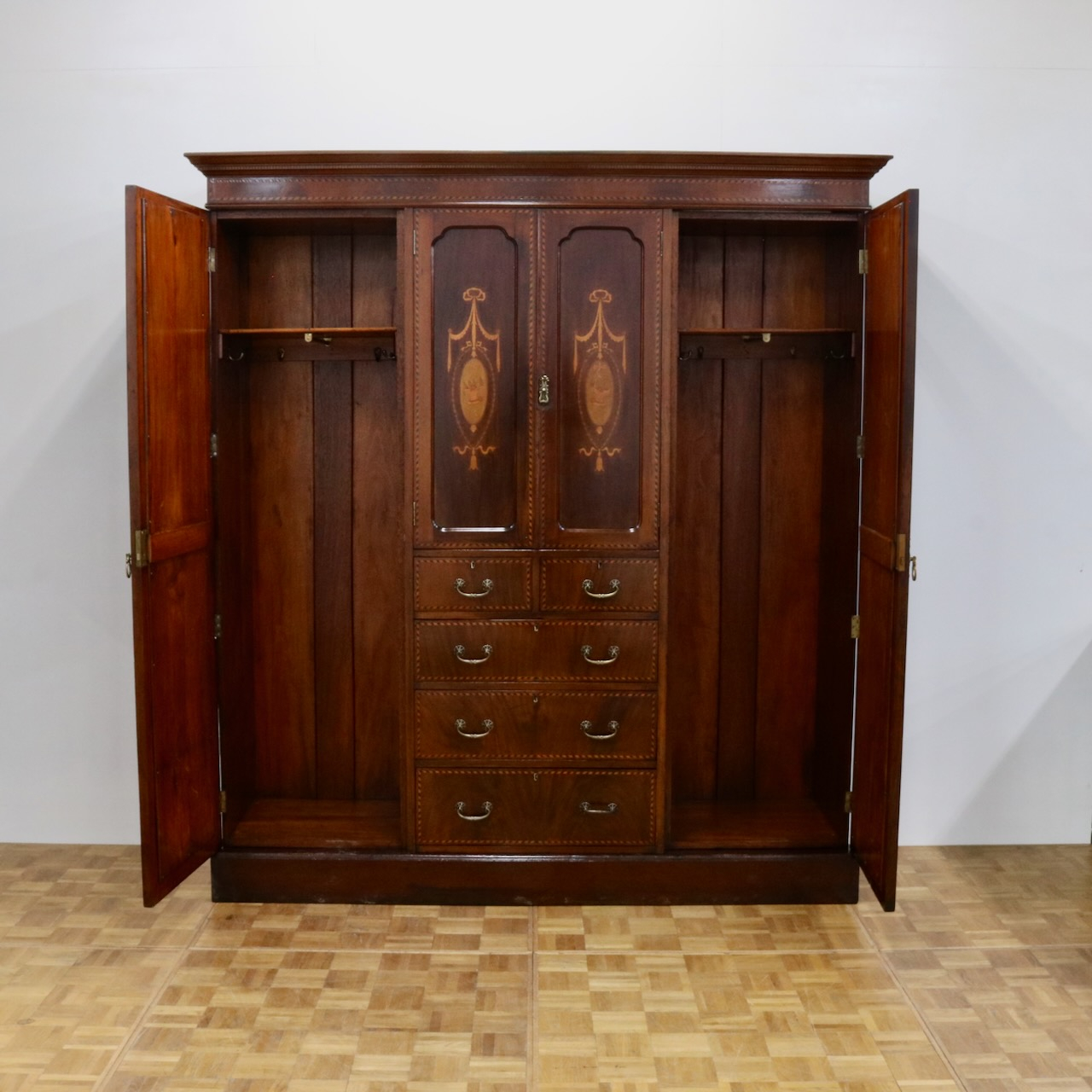 1920年代、マホガニーのワードローブ。花やリボンのインレイが施された優雅なデザイン。たっぷりとした収納力で衣類一式を美しく収納出来ます。ミラー付きなので身支度を整える時にも便利です。