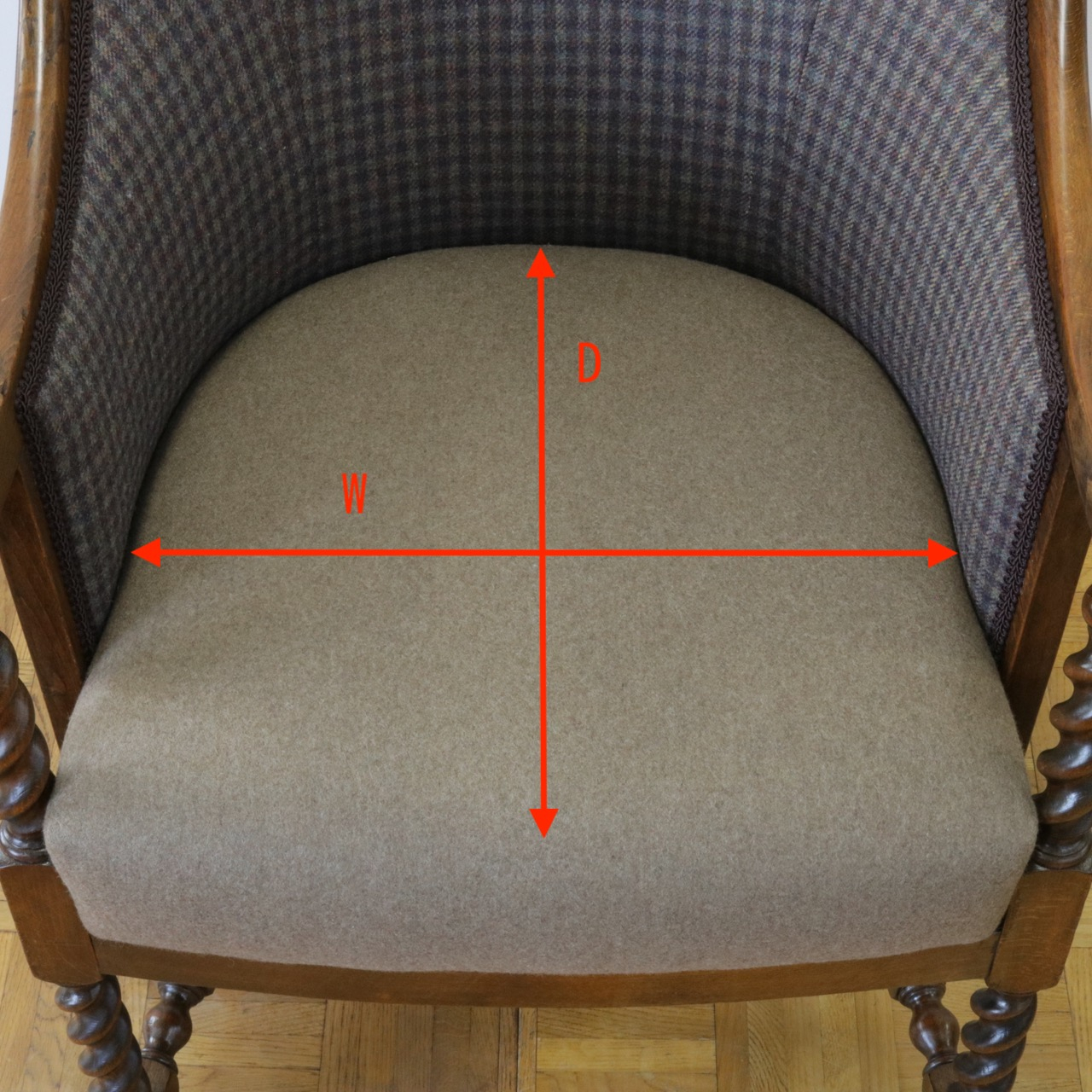 背もたれの生地はスコットランドの伝統ある生地ブランド、LOVAT社のHEATHERを用いました。紫ベースの落ち着いた色味が重なりあった美しいチェック。一方、座面はベージュブラウンの単色で張ることで柄がより引き立ちます。色合いのコントラストをお楽しみください。