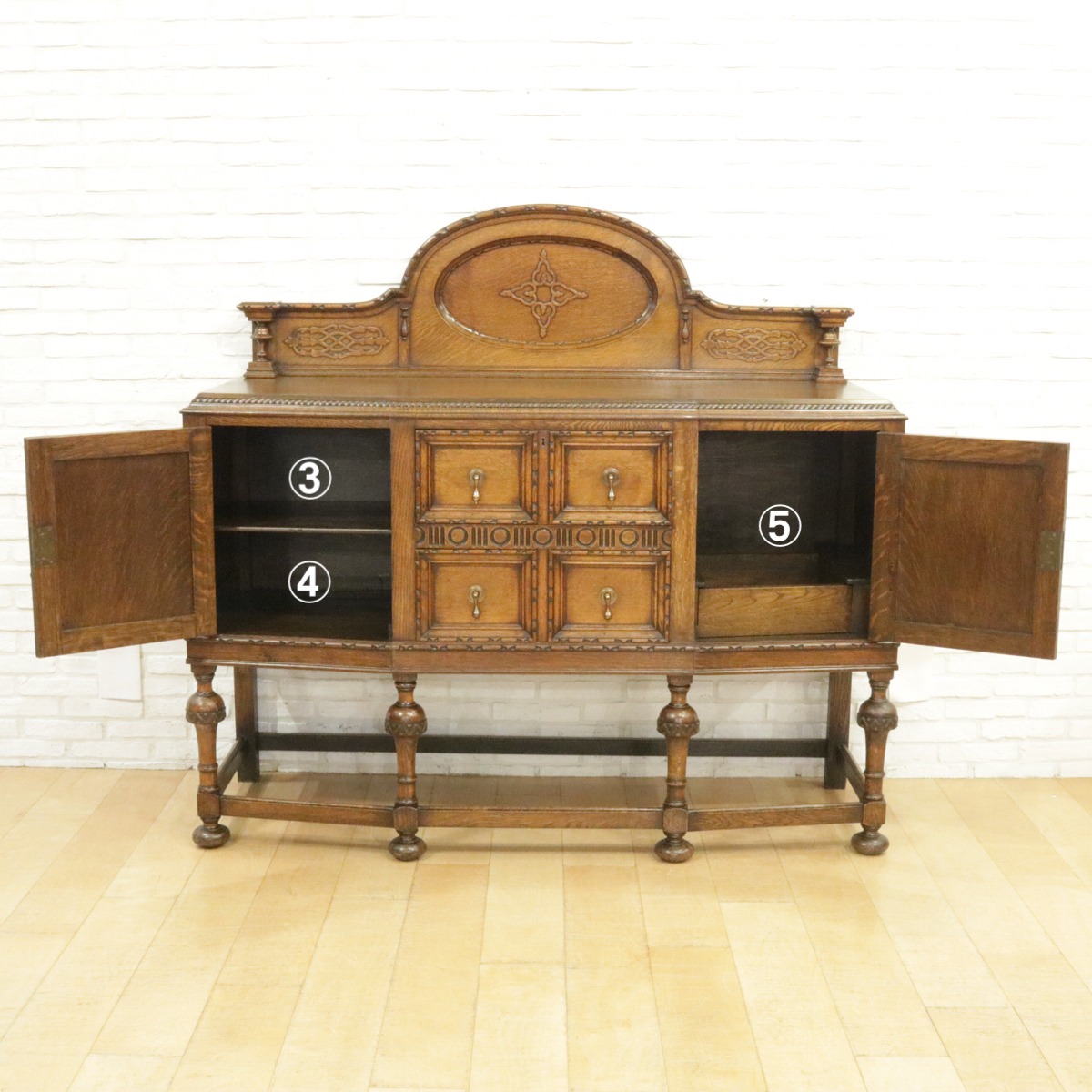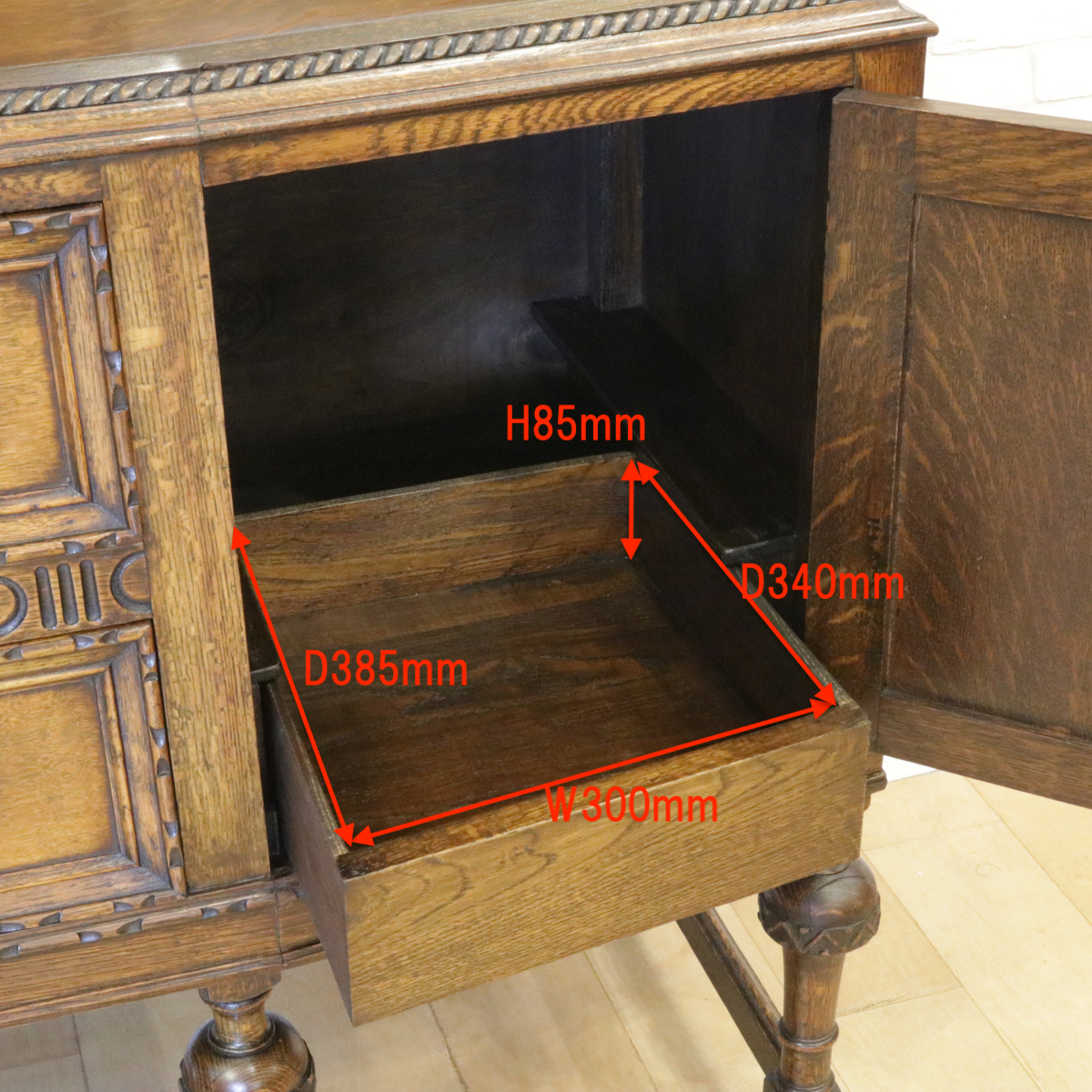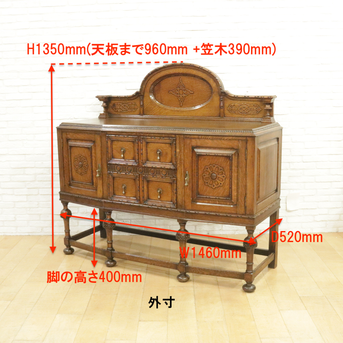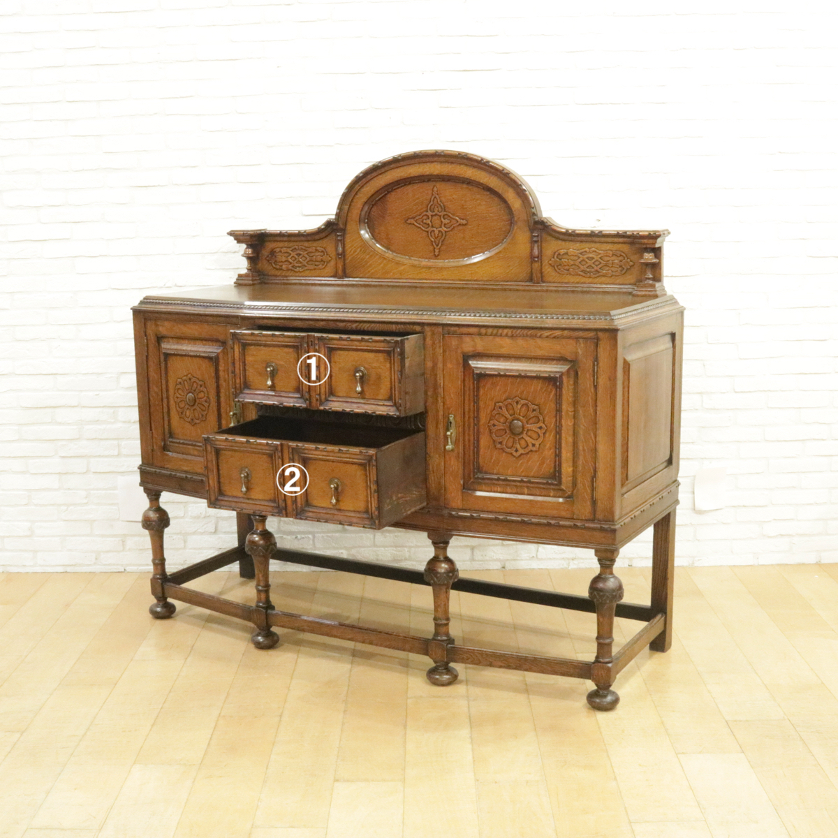 全体を縁取る彫刻や、笠木に施された細やかな装飾等、細部まで丁寧に仕上げられたサイドボードです。