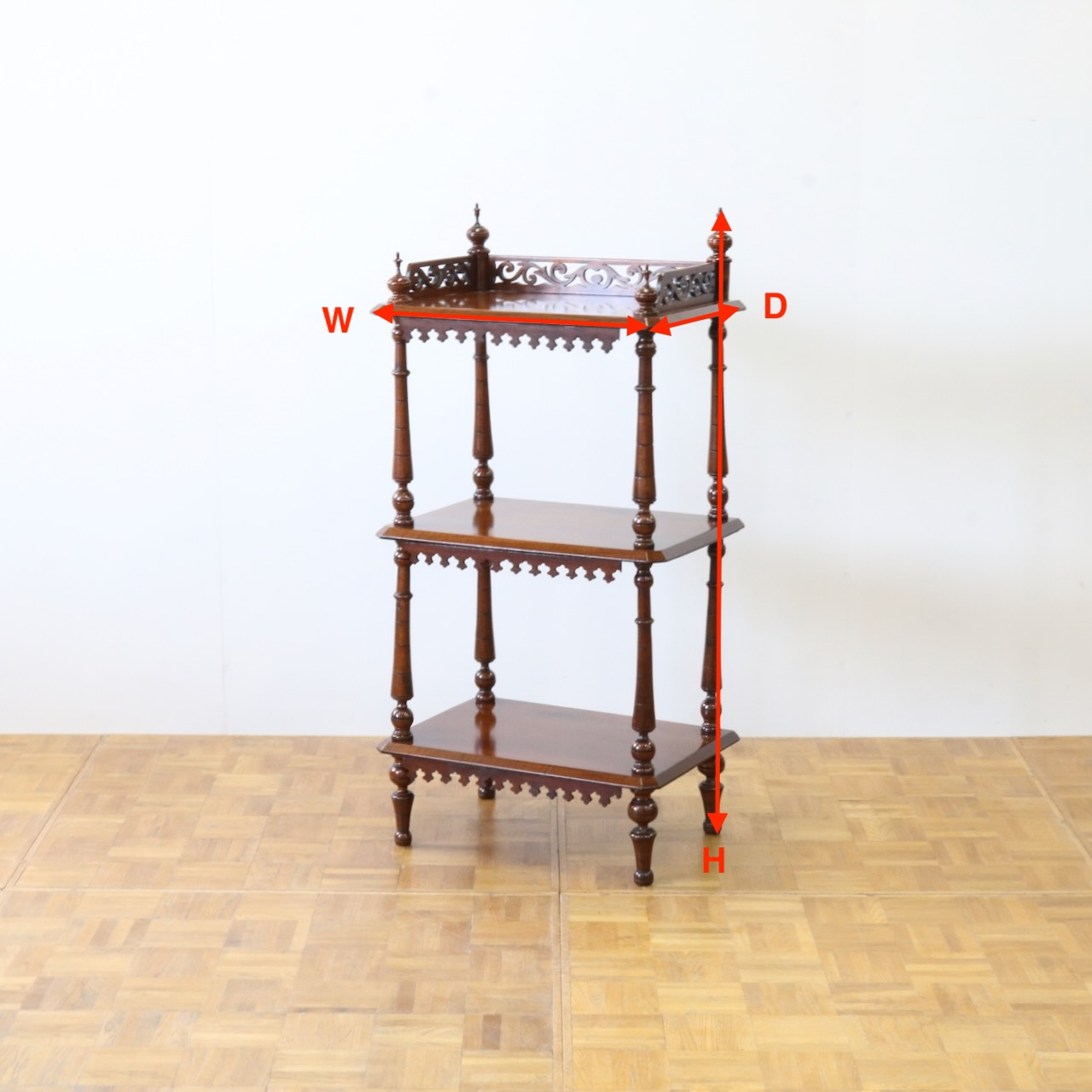 配送料の目安 ▶︎1880年代、ヴィクトリアンのワットノット。多様性のある棚としてお使い頂けます。ウォールナットの木目と透かし模様がポイントのスタンドファニチャーです。