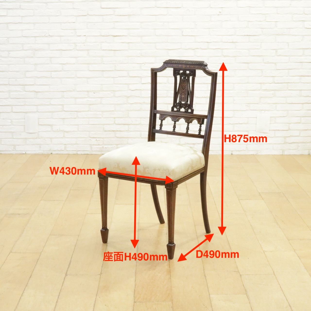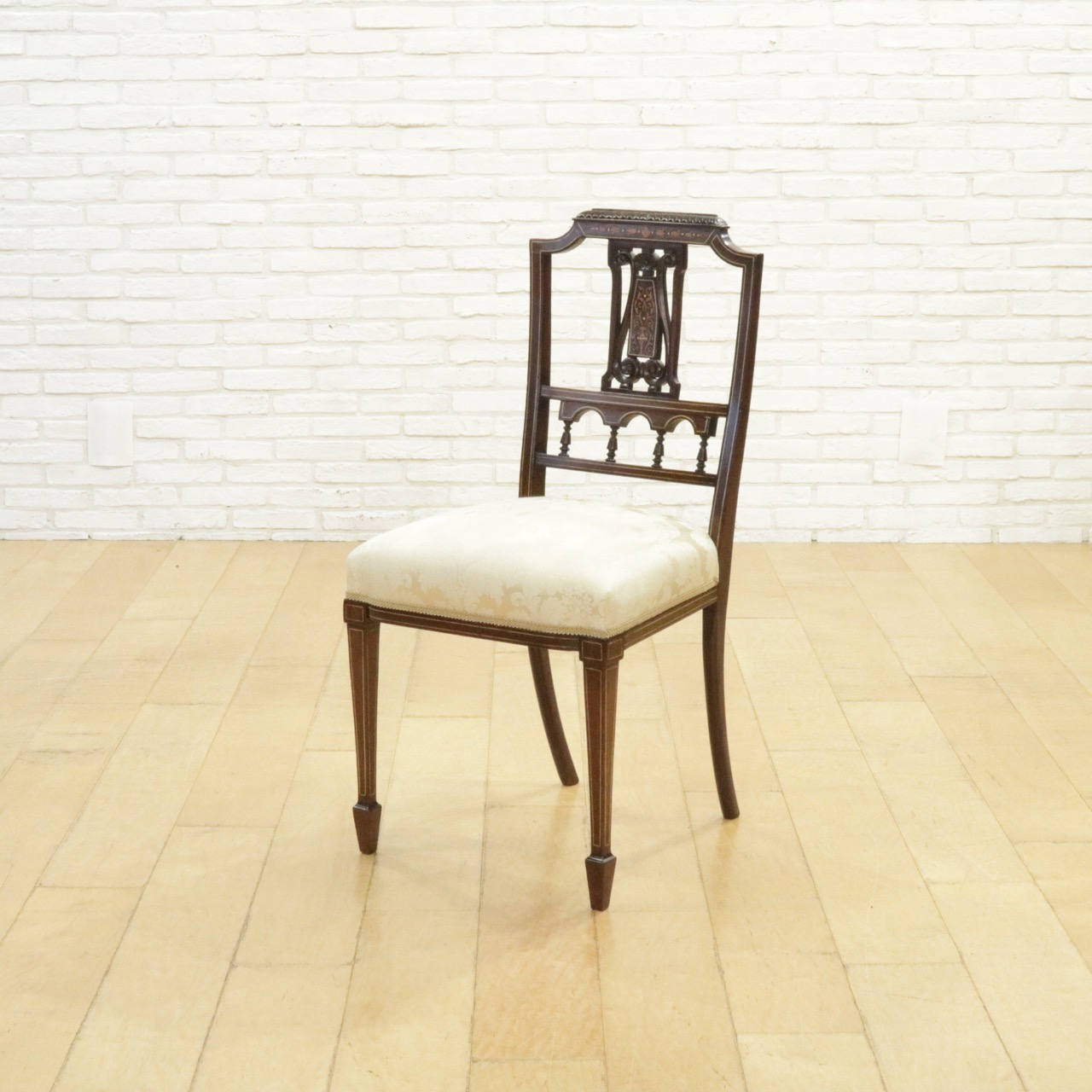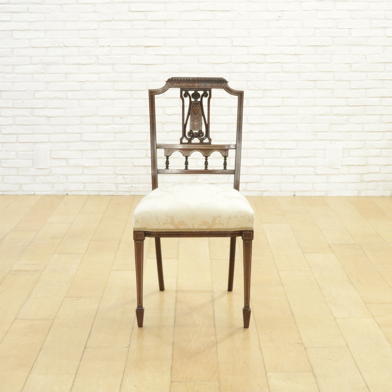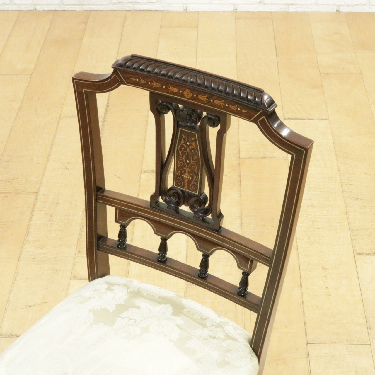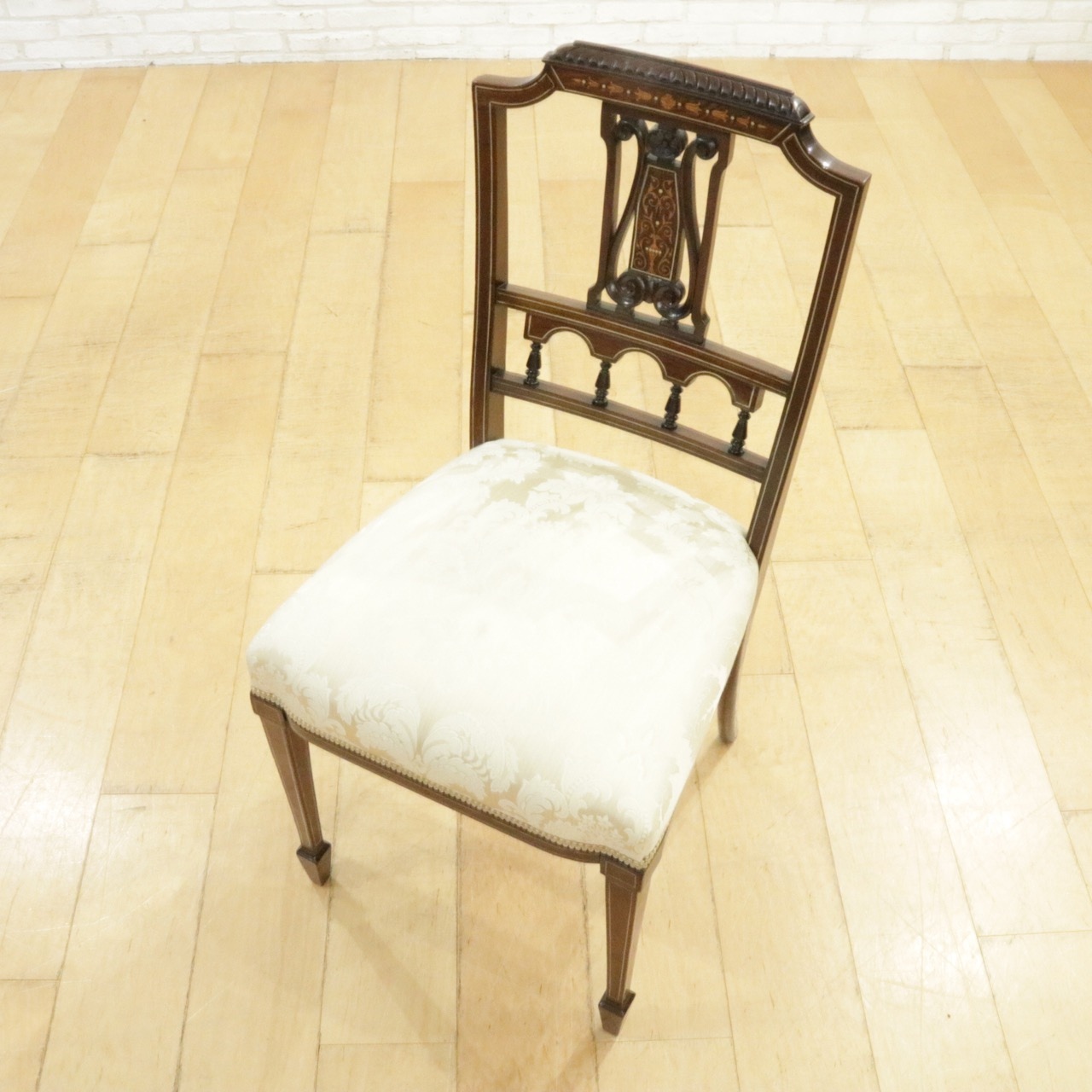 配送料の目安 ▶︎1920年代、マホガニーのサイドチェアー。トップから脚部に至るまで施されたインレイ細工の美しさが目を引きます。
