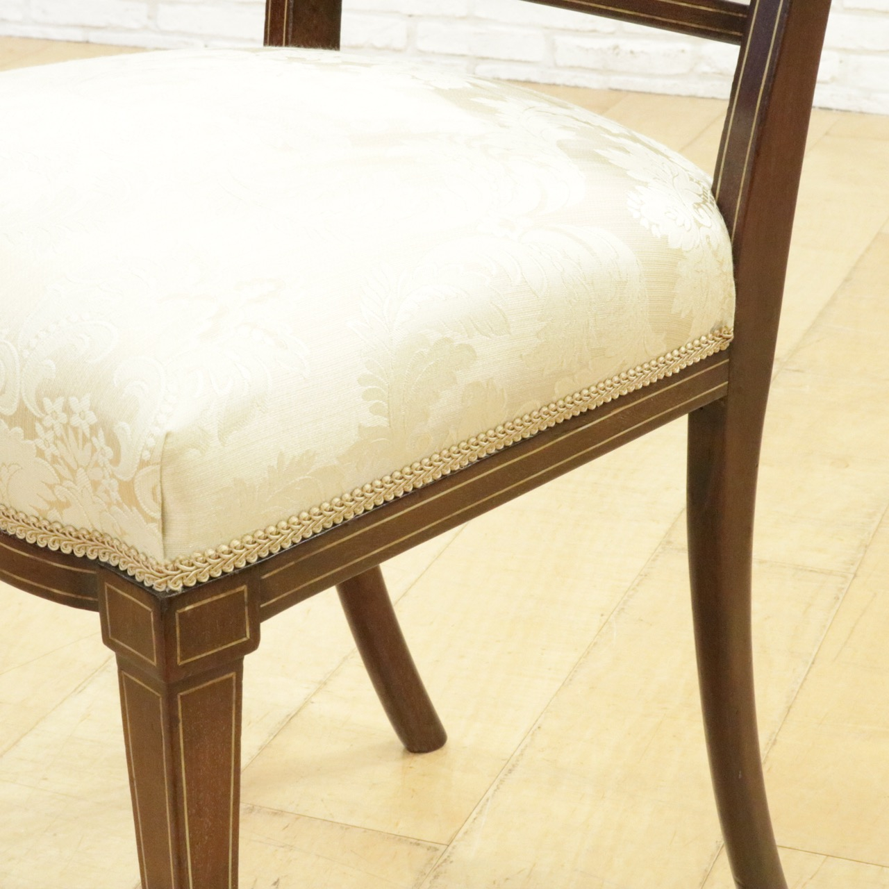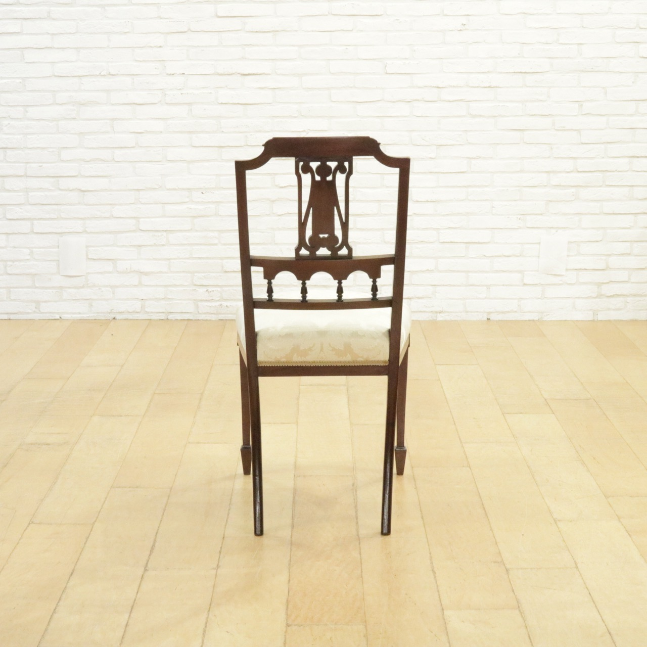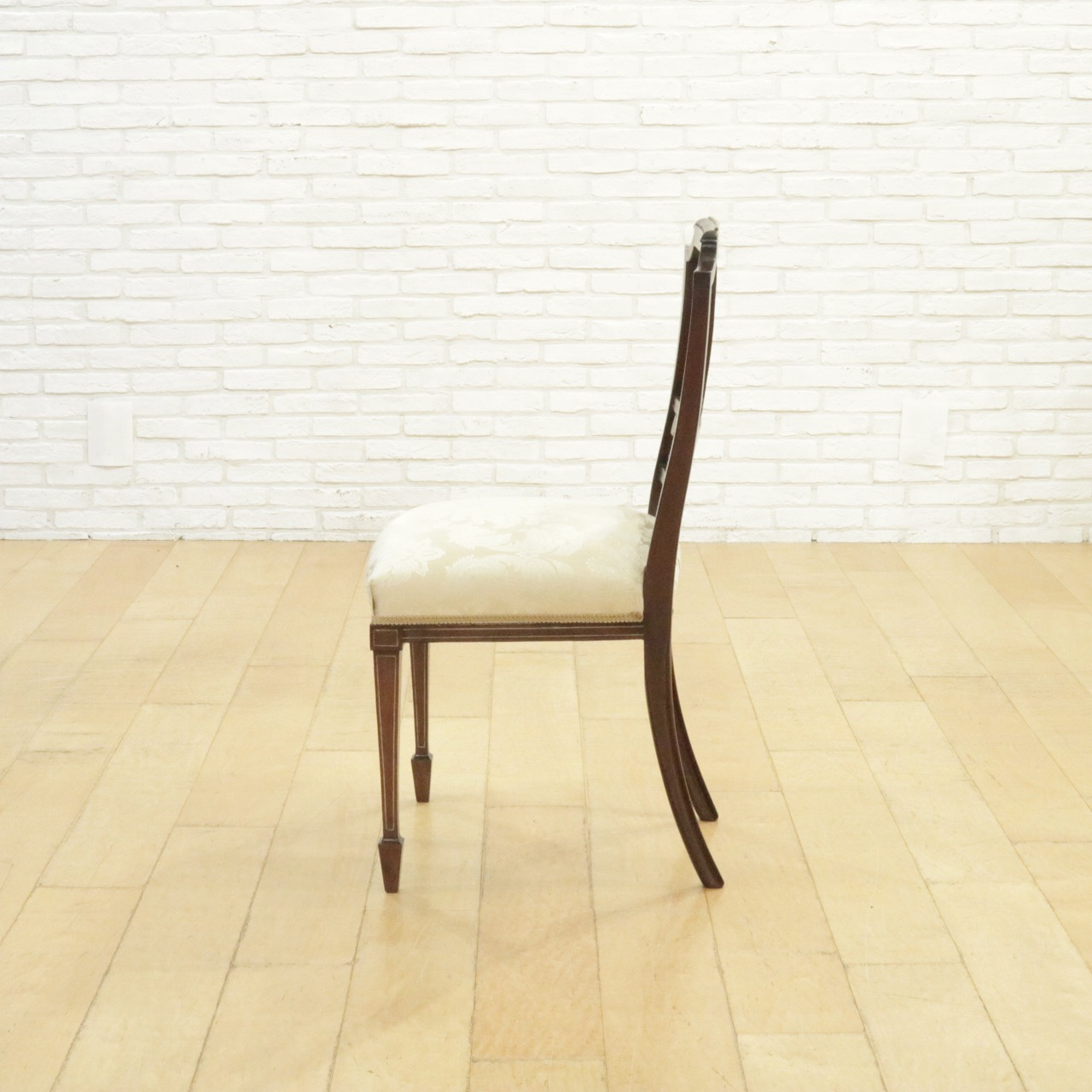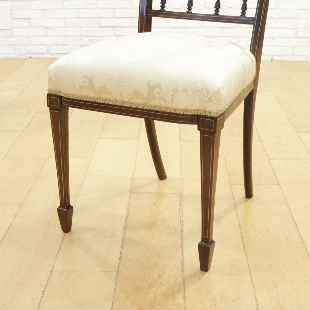 配送料の目安 ▶︎1920年代、マホガニーのサイドチェアー。トップから脚部に至るまで施されたインレイ細工の美しさが目を引きます。