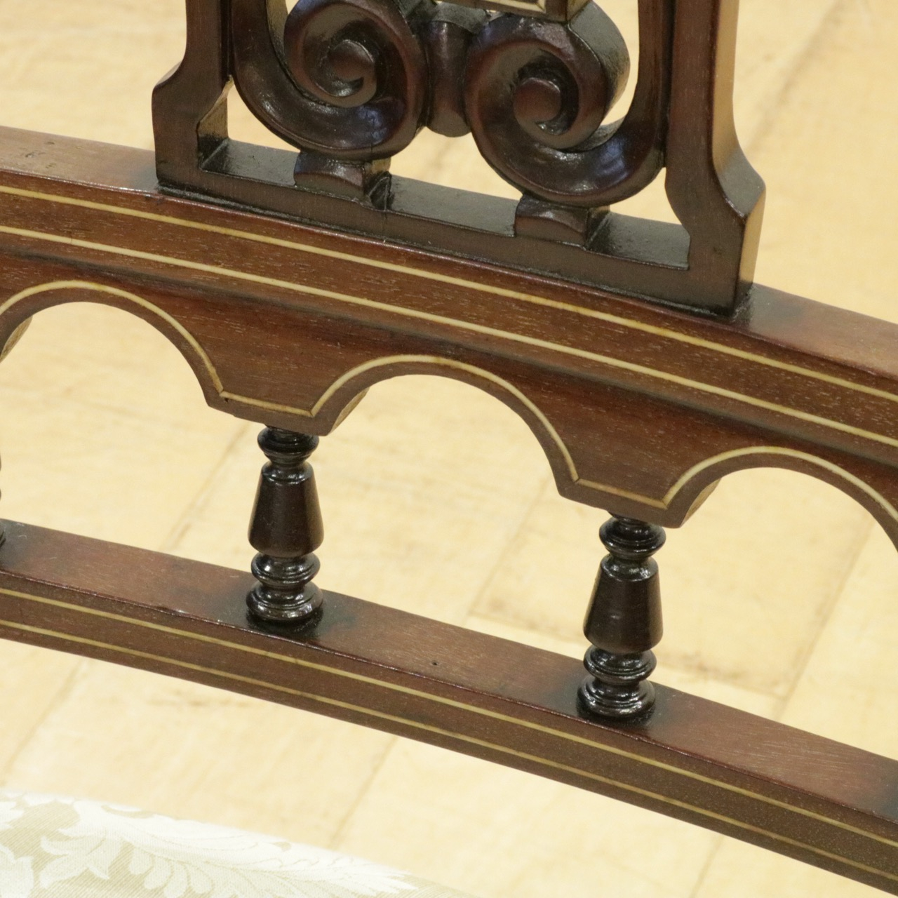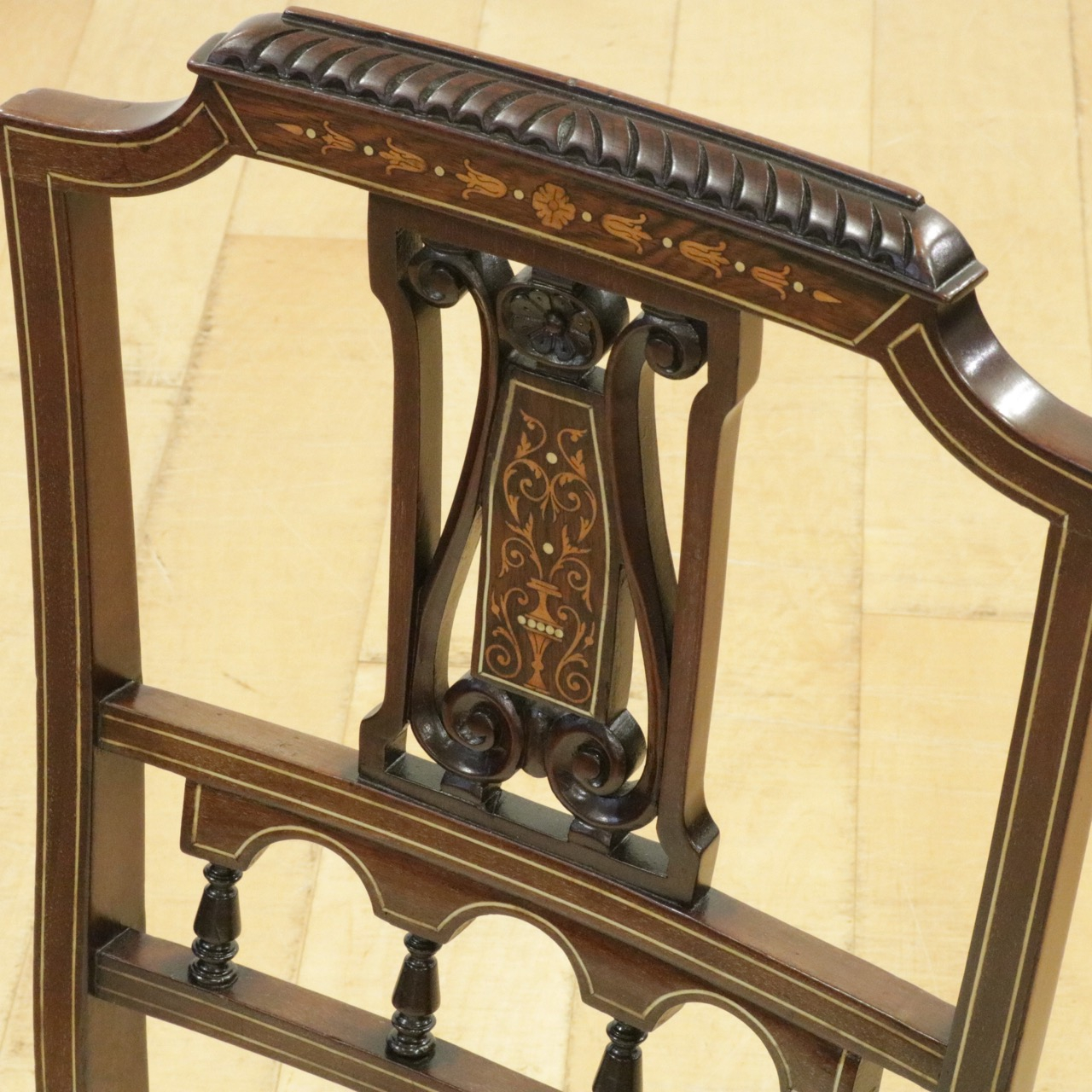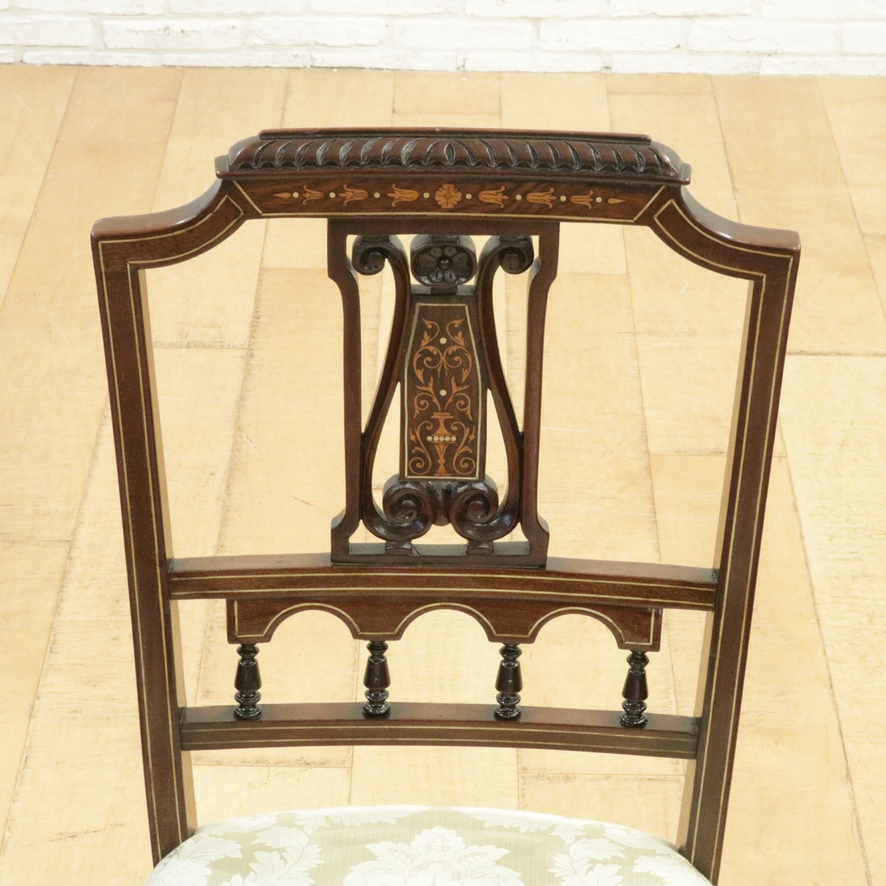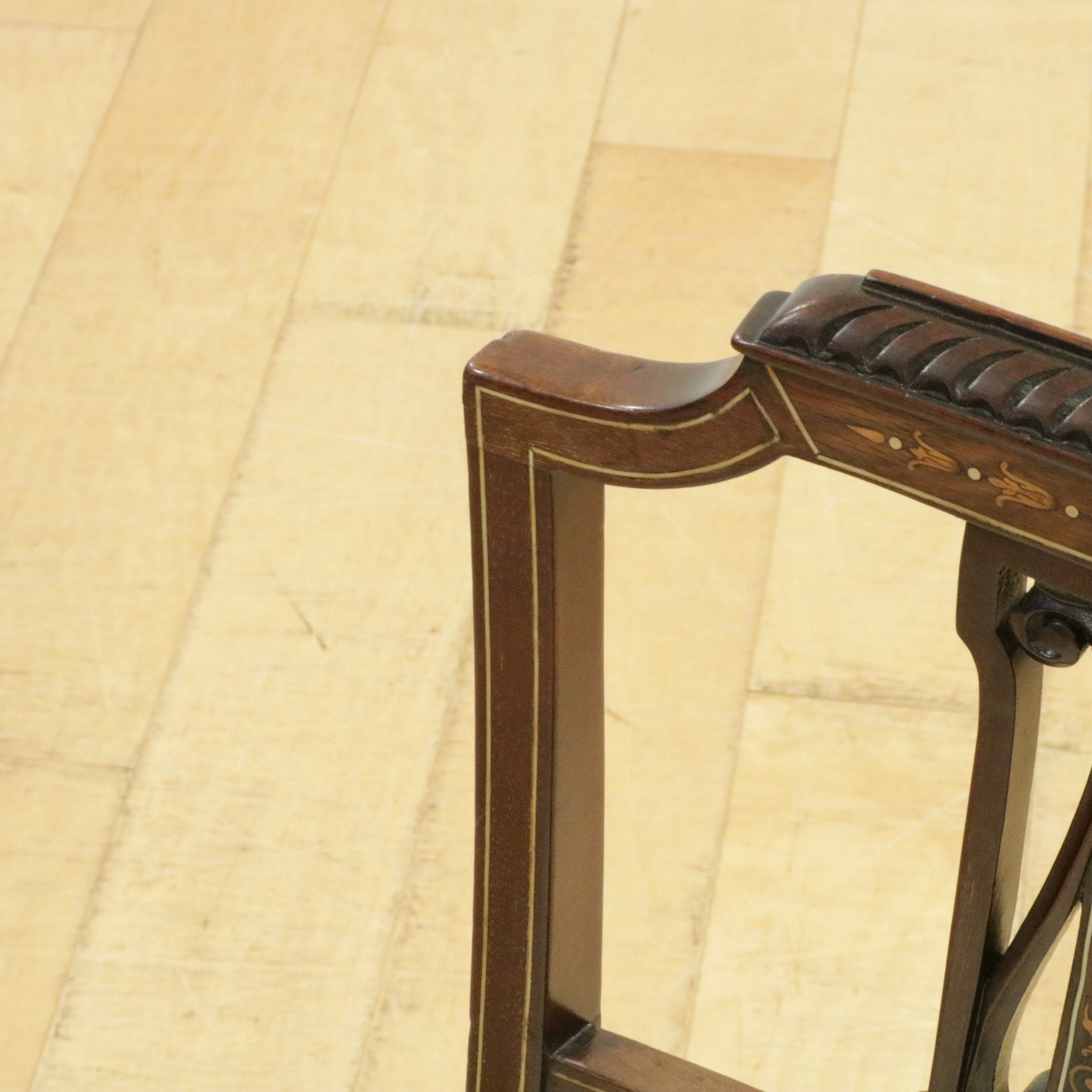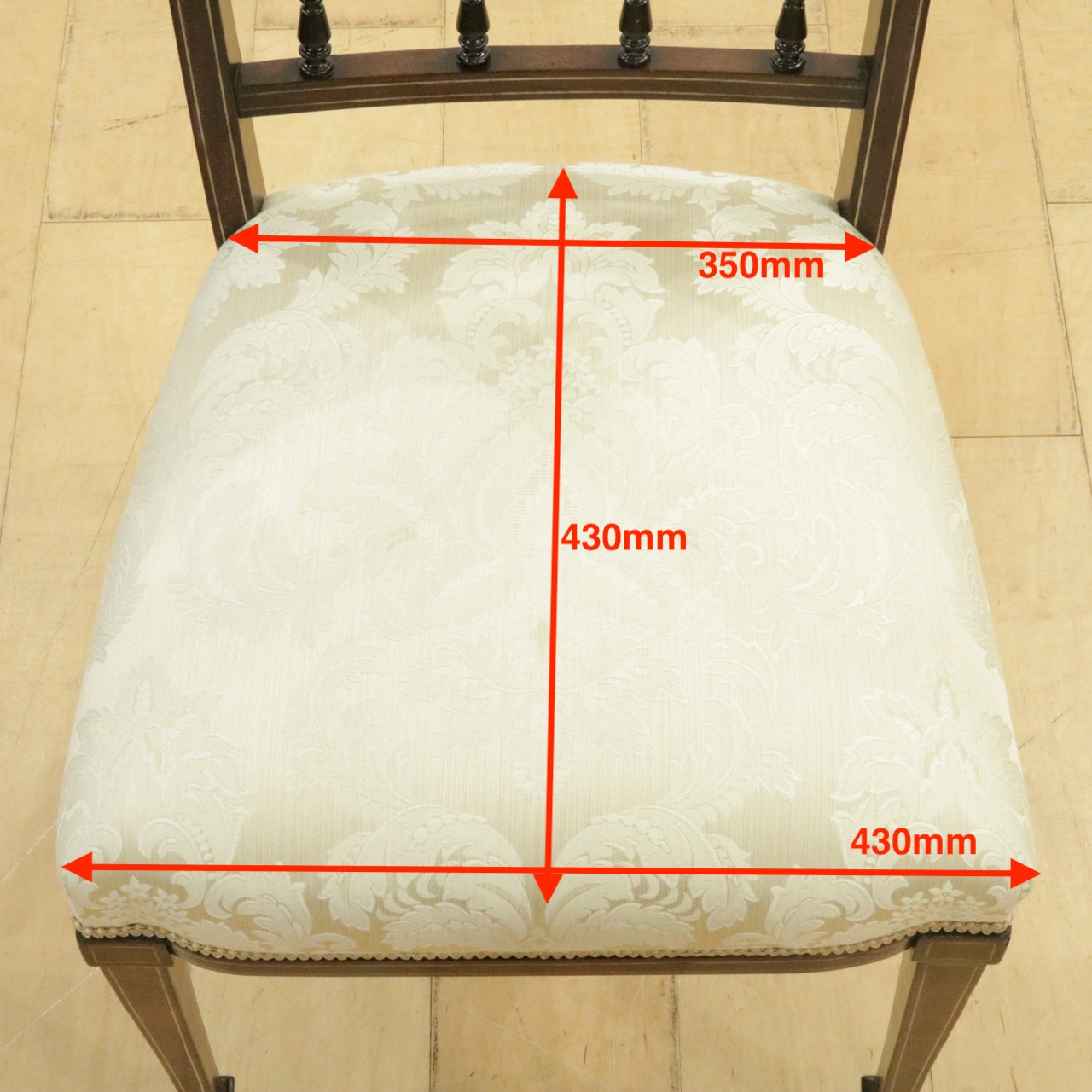 配送料の目安 ▶︎1920年代、マホガニーのサイドチェアー。トップから脚部に至るまで施されたインレイ細工の美しさが目を引きます。