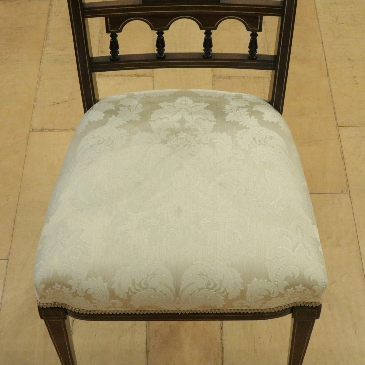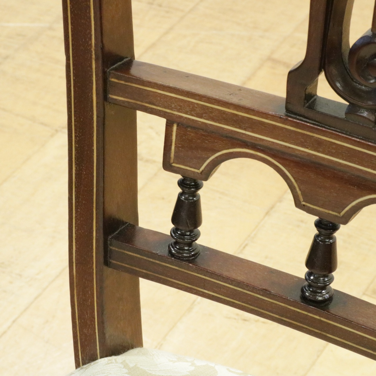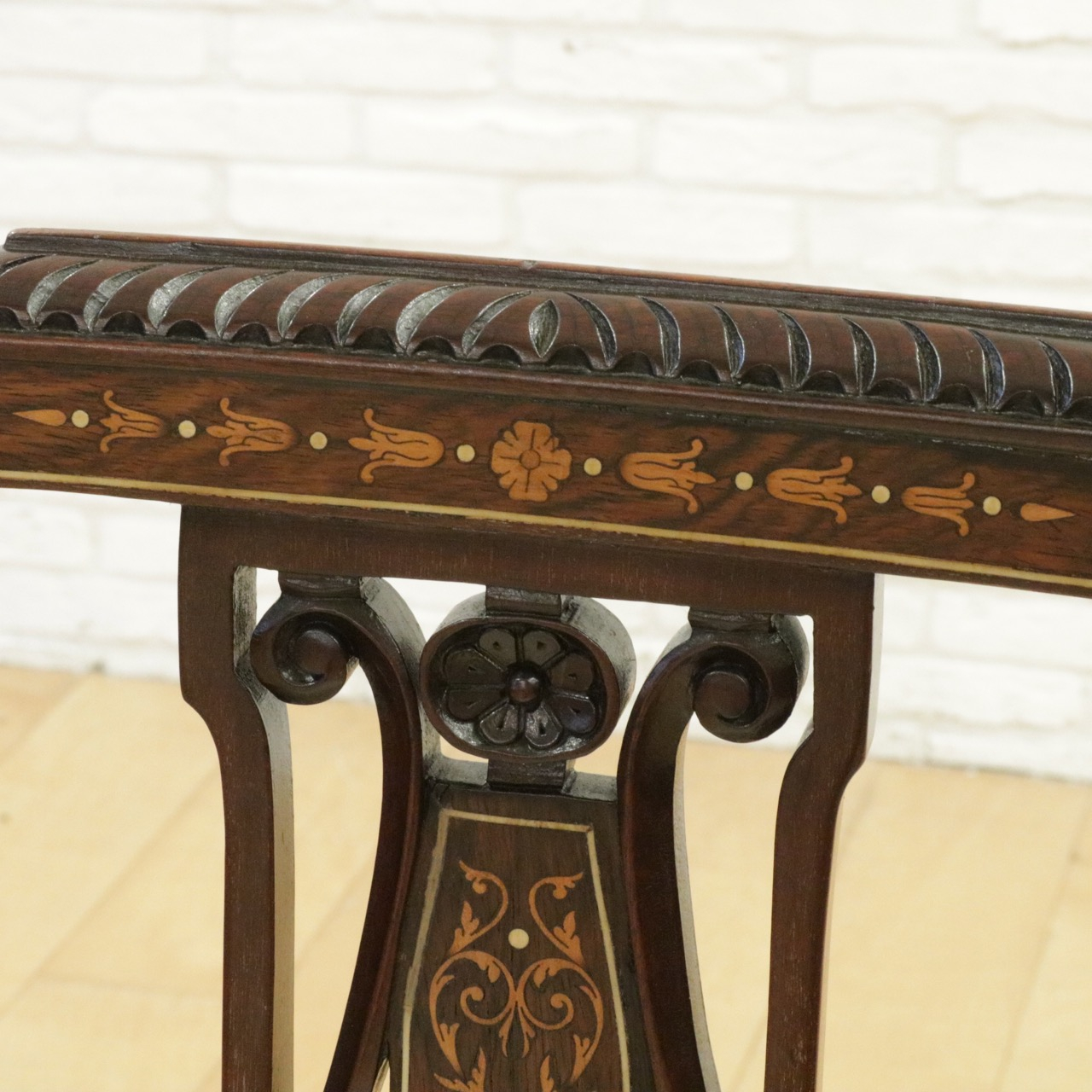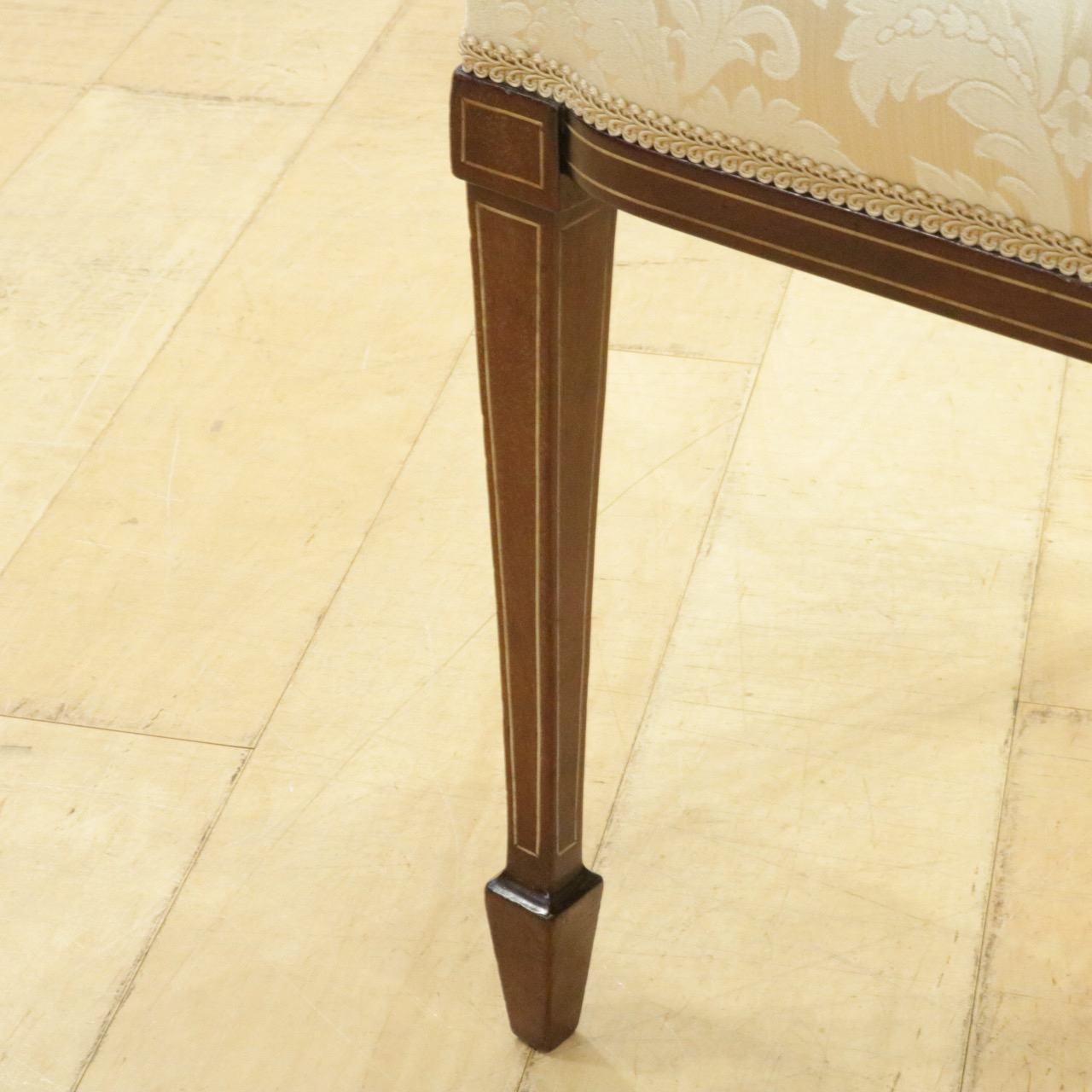 配送料の目安 ▶︎1920年代、マホガニーのサイドチェアー。トップから脚部に至るまで施されたインレイ細工の美しさが目を引きます。