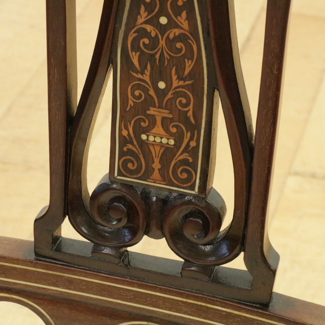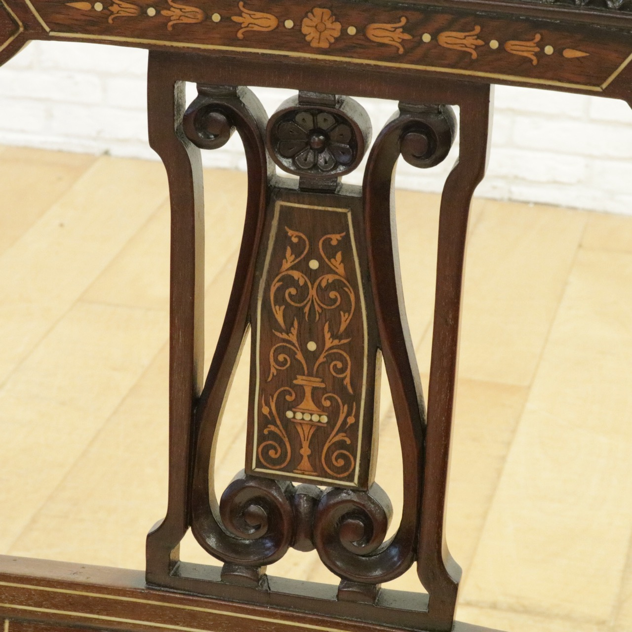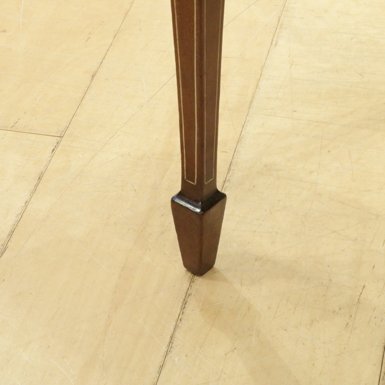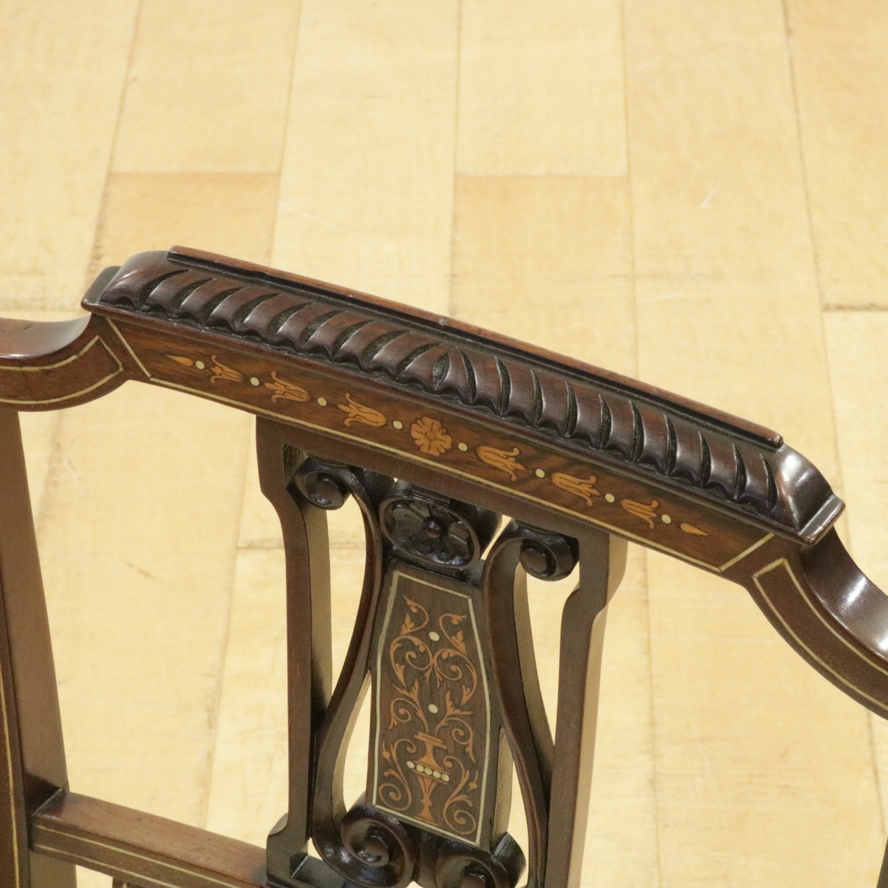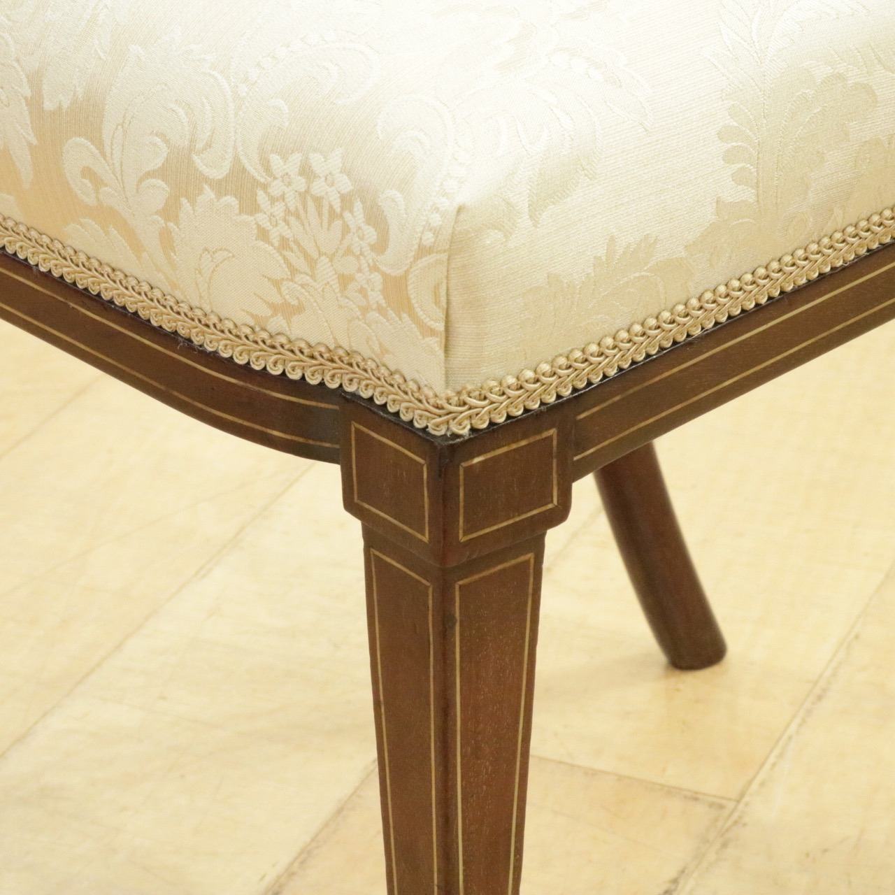 配送料の目安 ▶︎1920年代、マホガニーのサイドチェアー。トップから脚部に至るまで施されたインレイ細工の美しさが目を引きます。