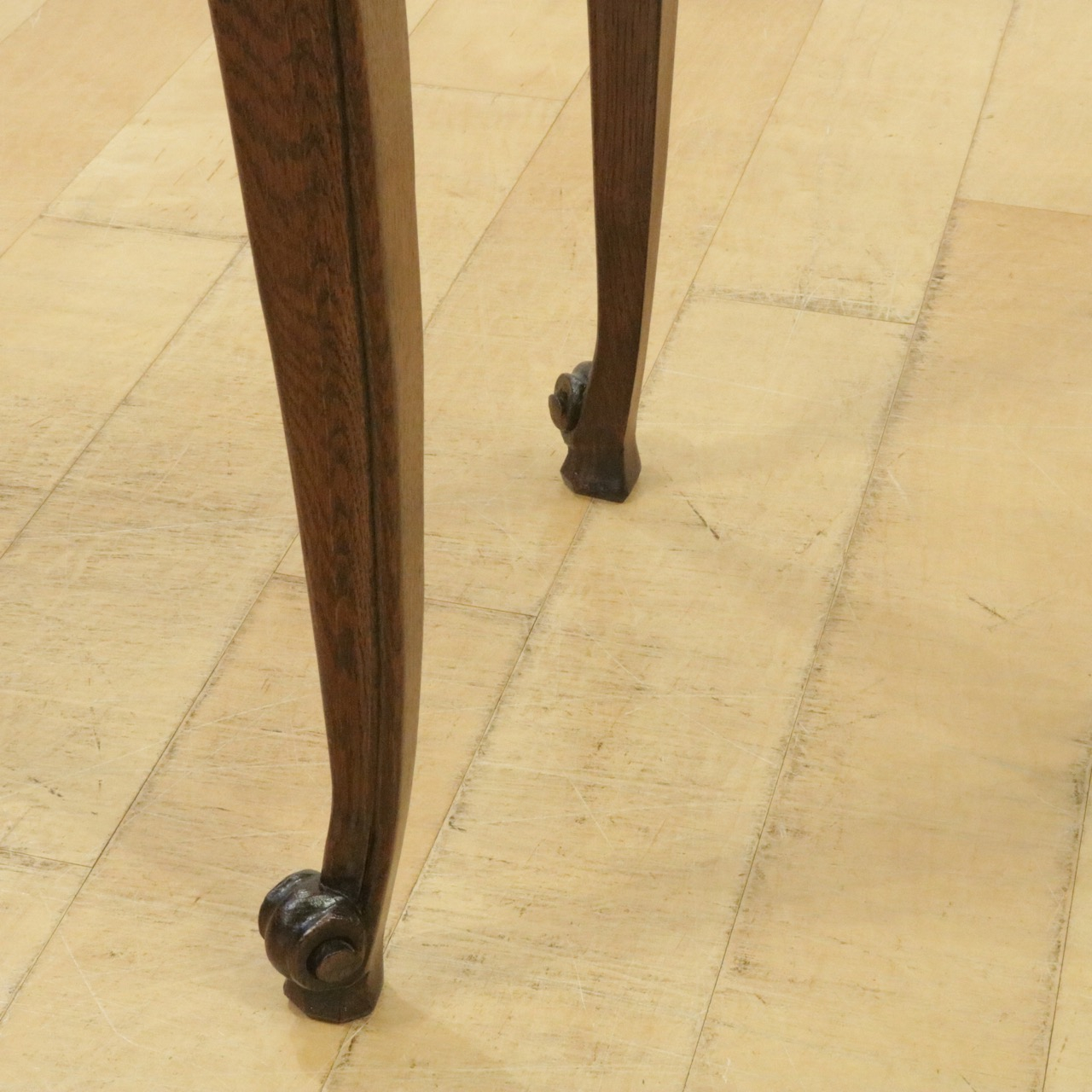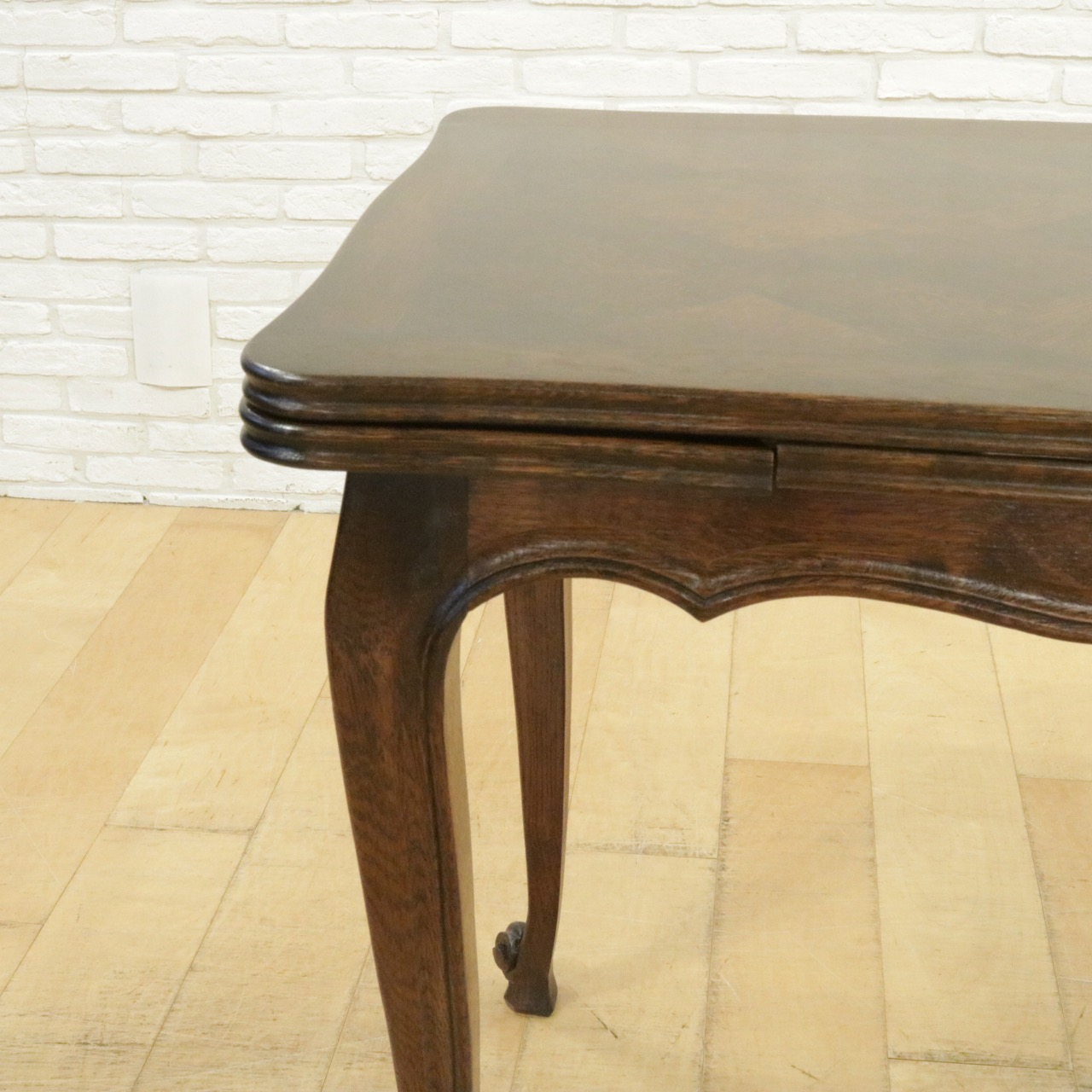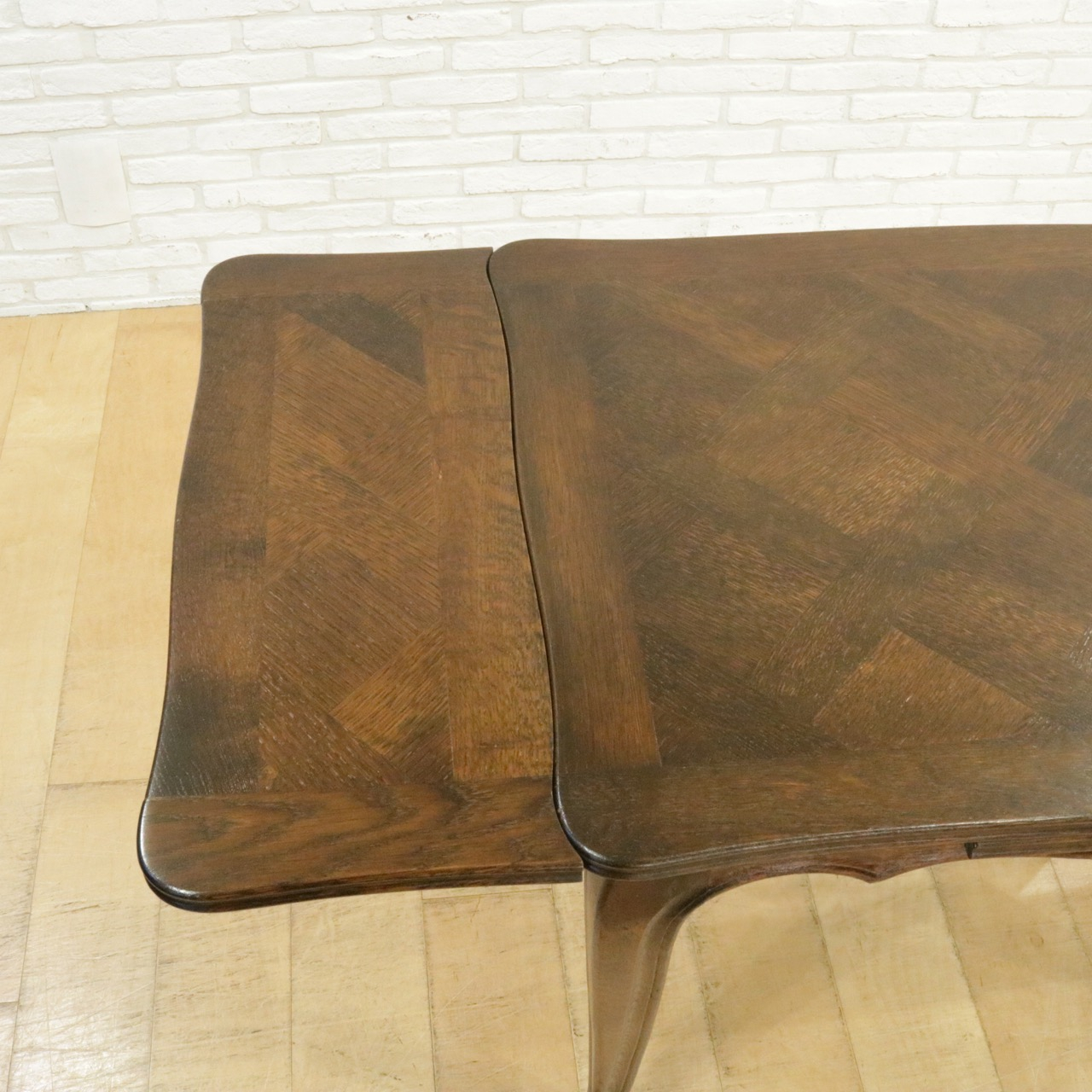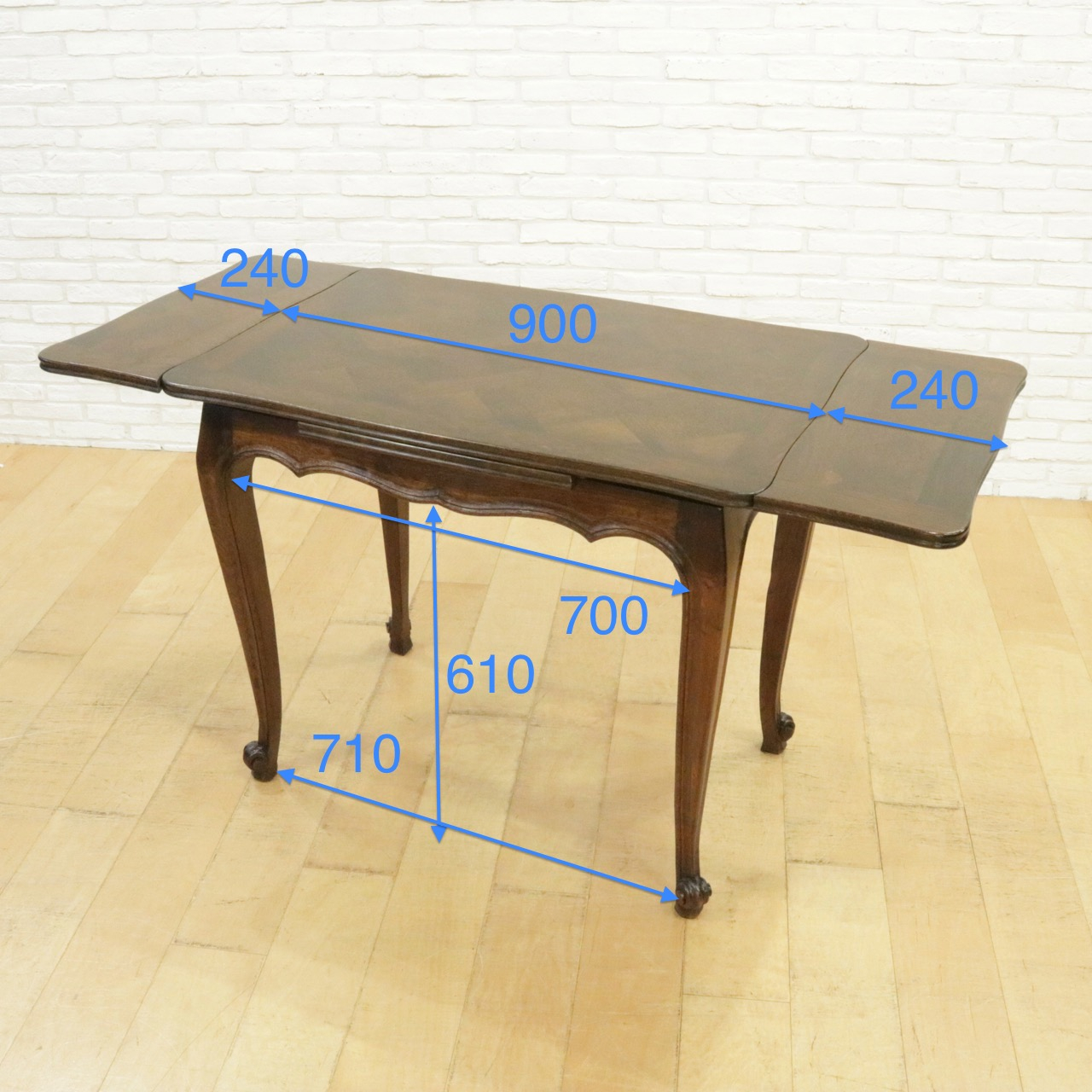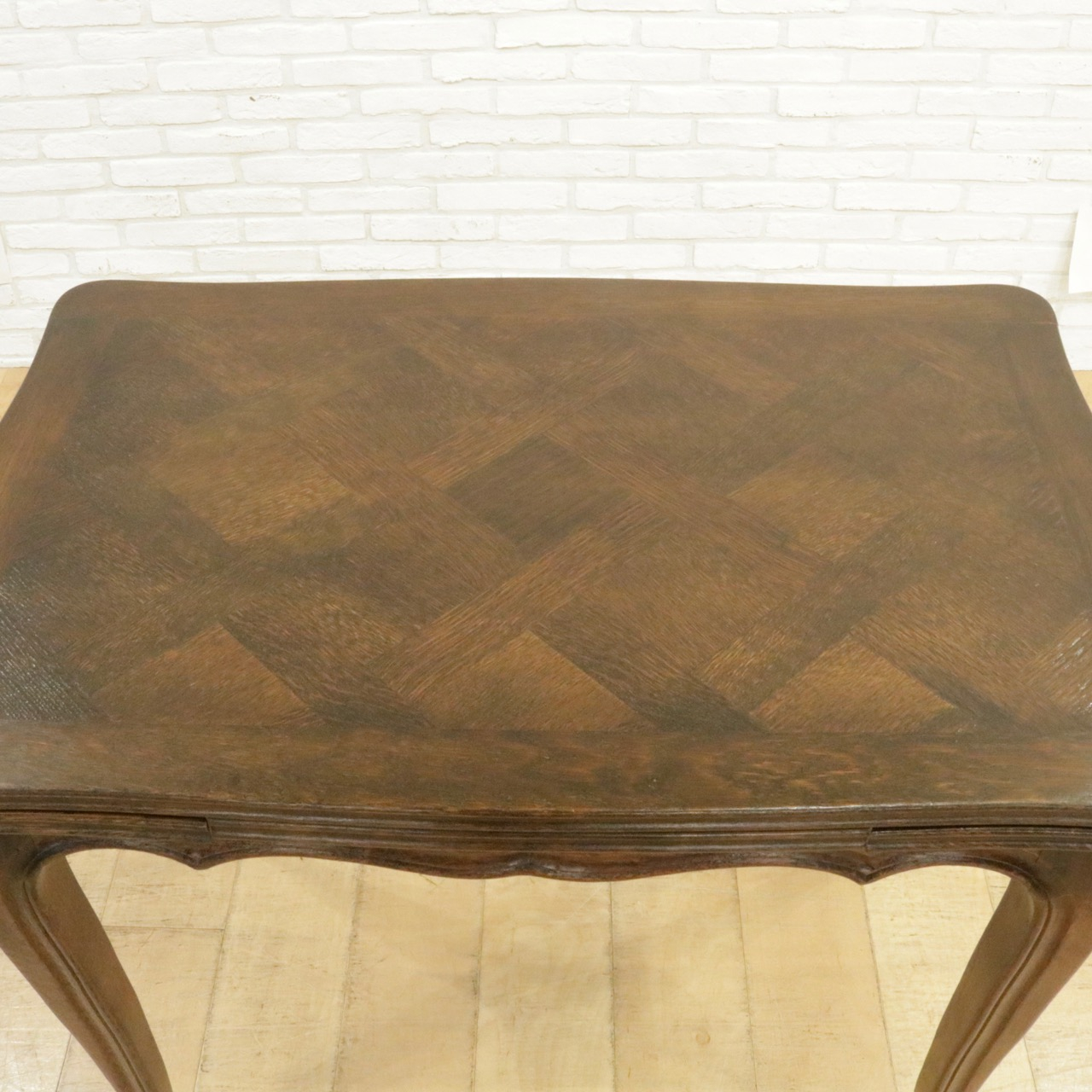 中央の天板にもリーフにも、幾何学的なパーケトリーが美しく施されています。