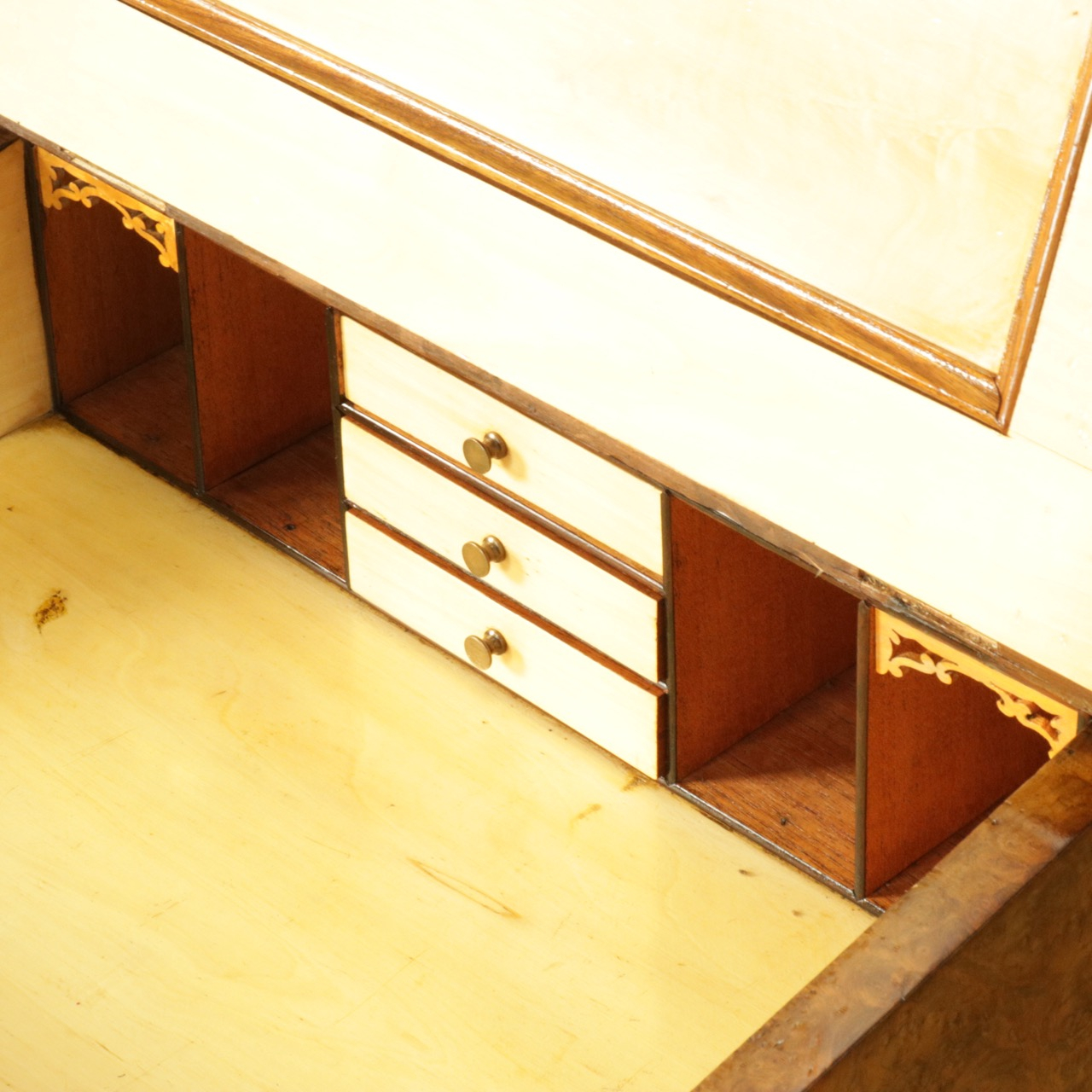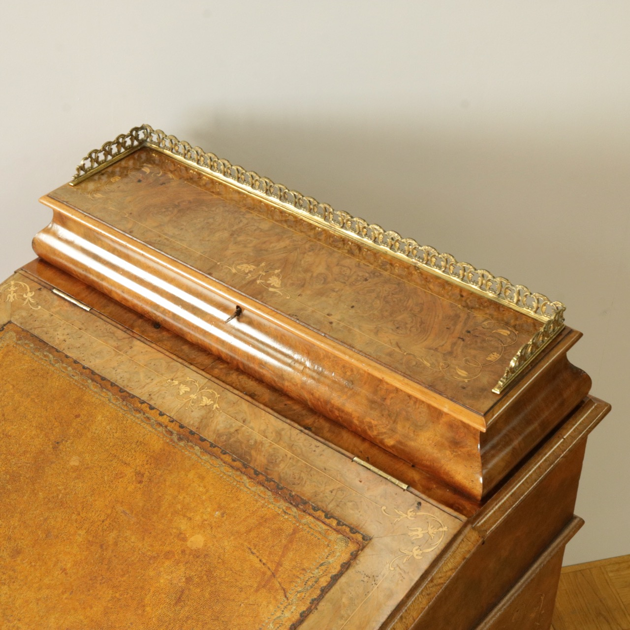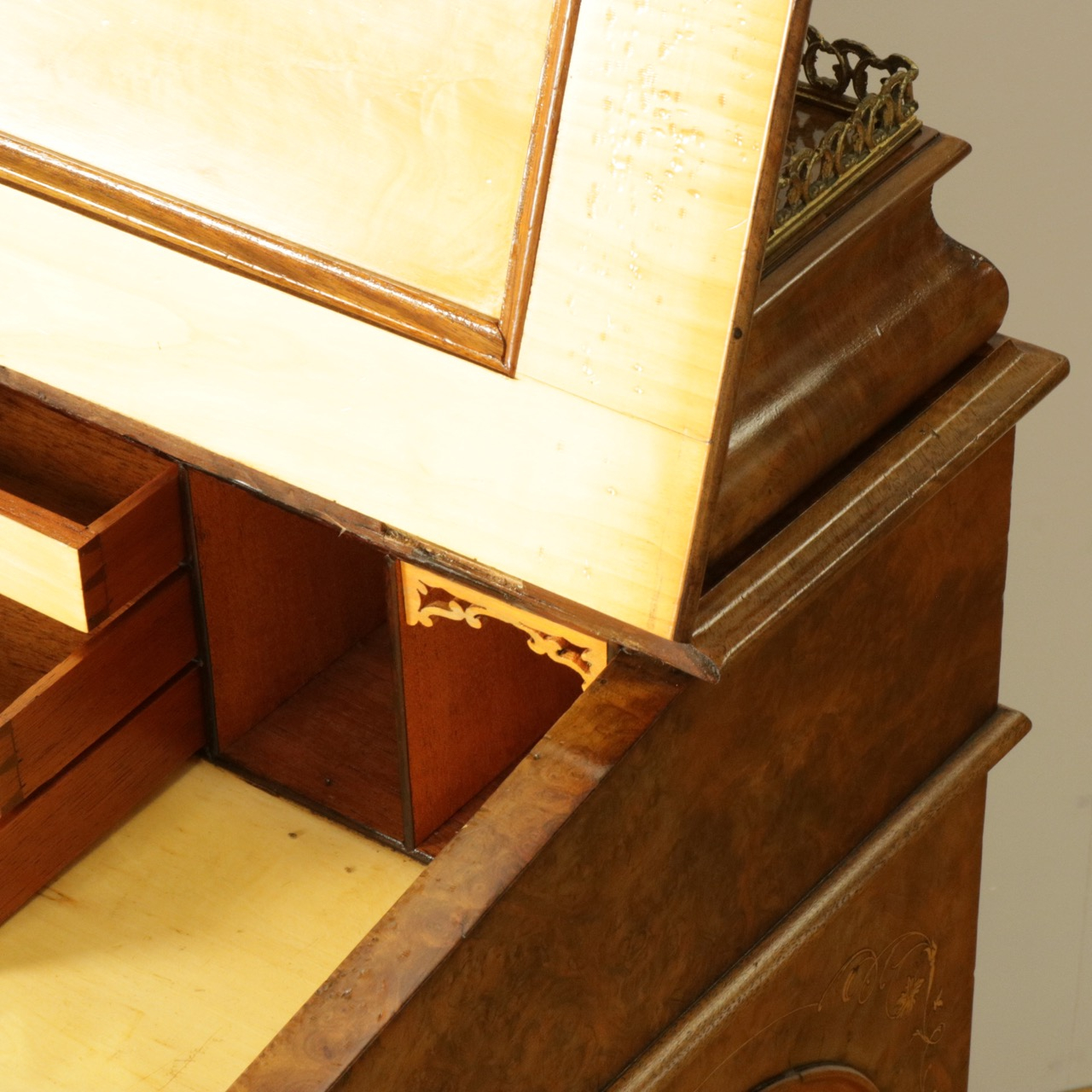 真鍮製のギャラリー付きのトップを開くと、ペントレイやインク入れの名残が。