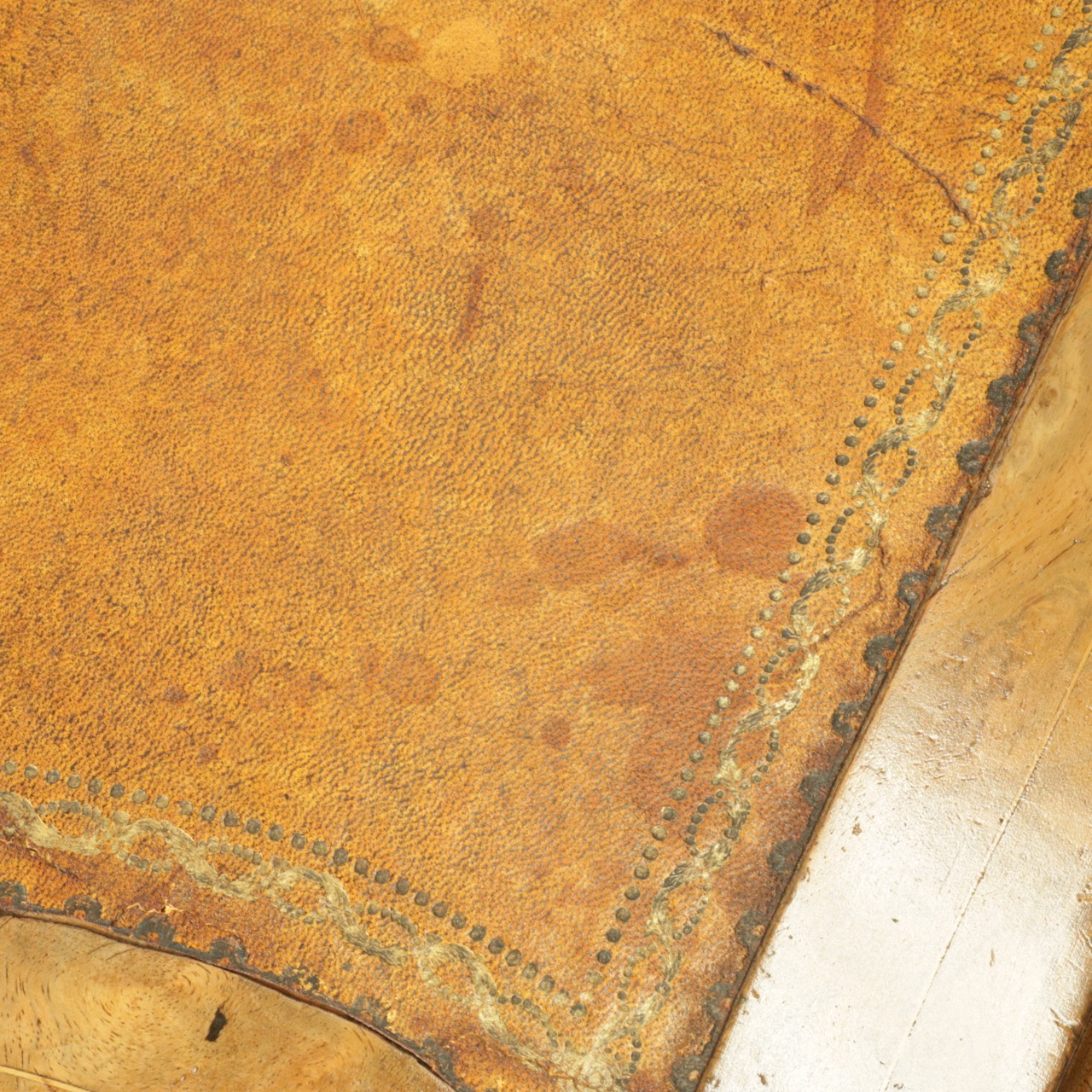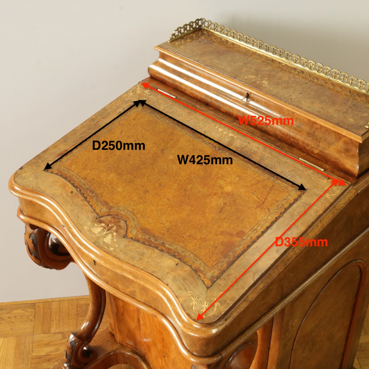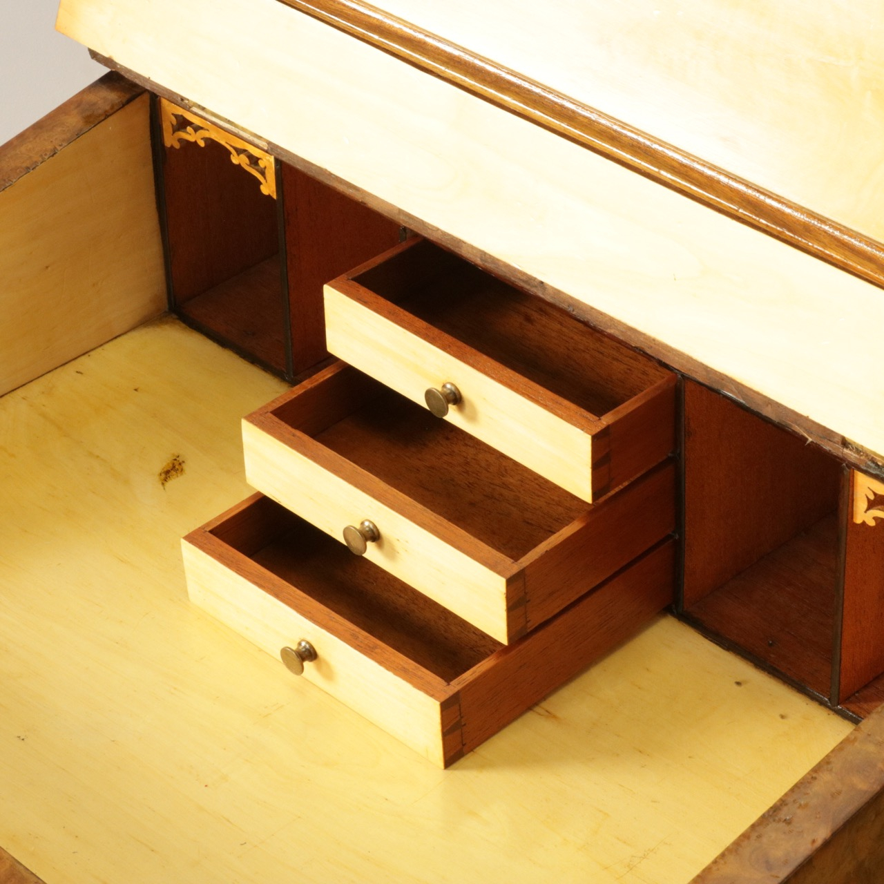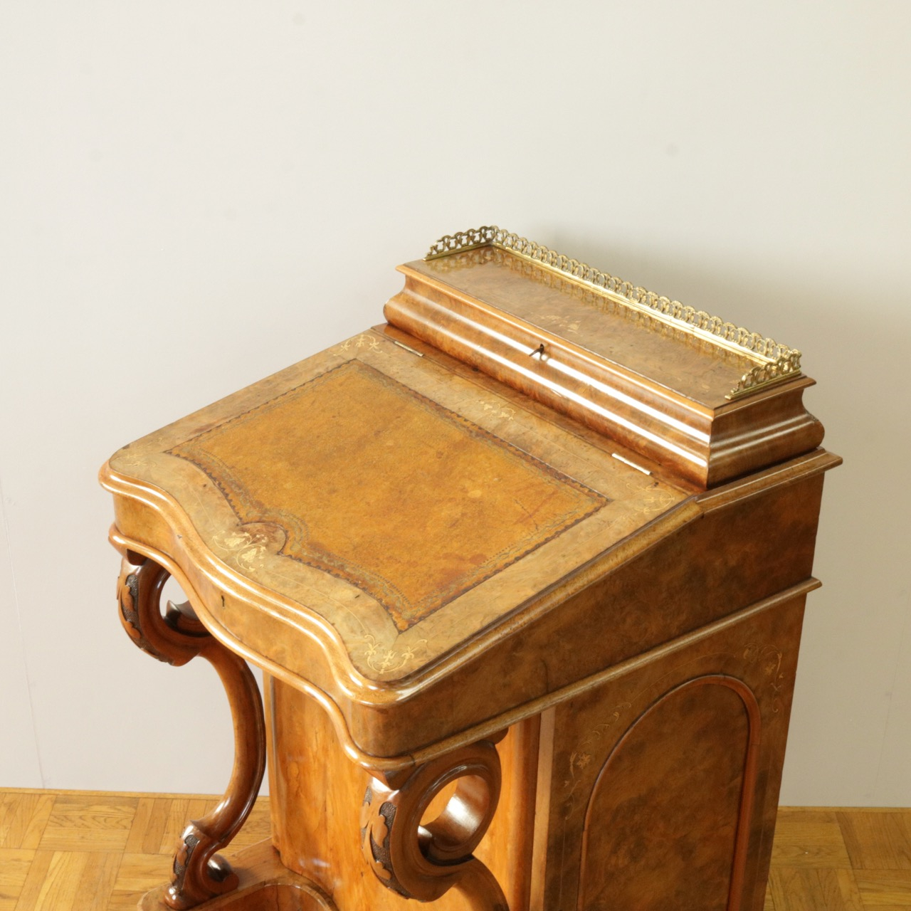 真鍮製のギャラリー付きのトップを開くと、ペントレイやインク入れの名残が。