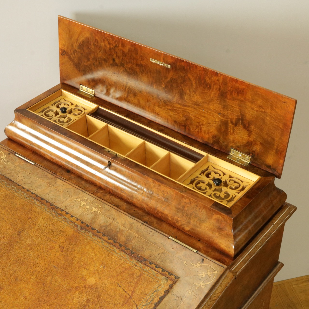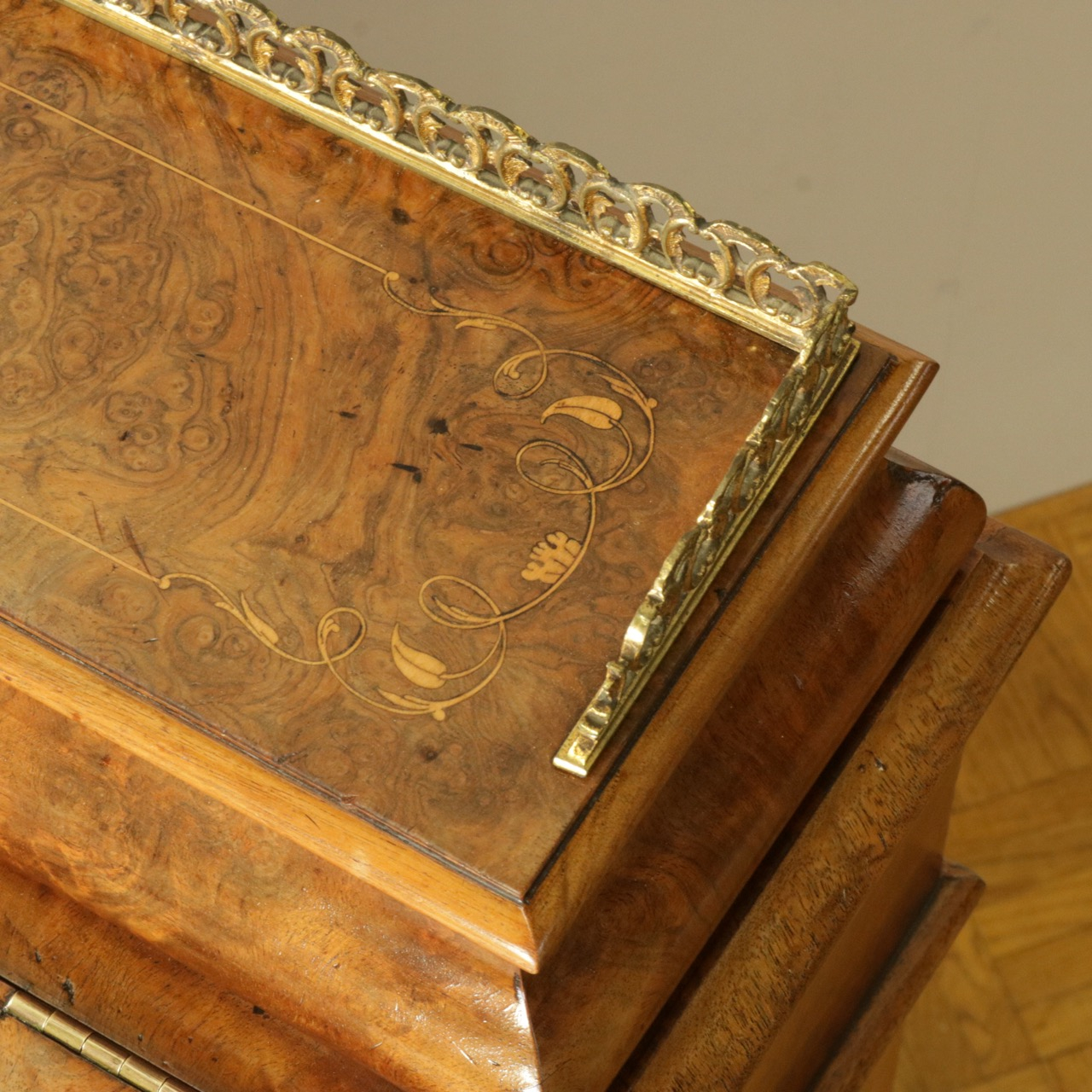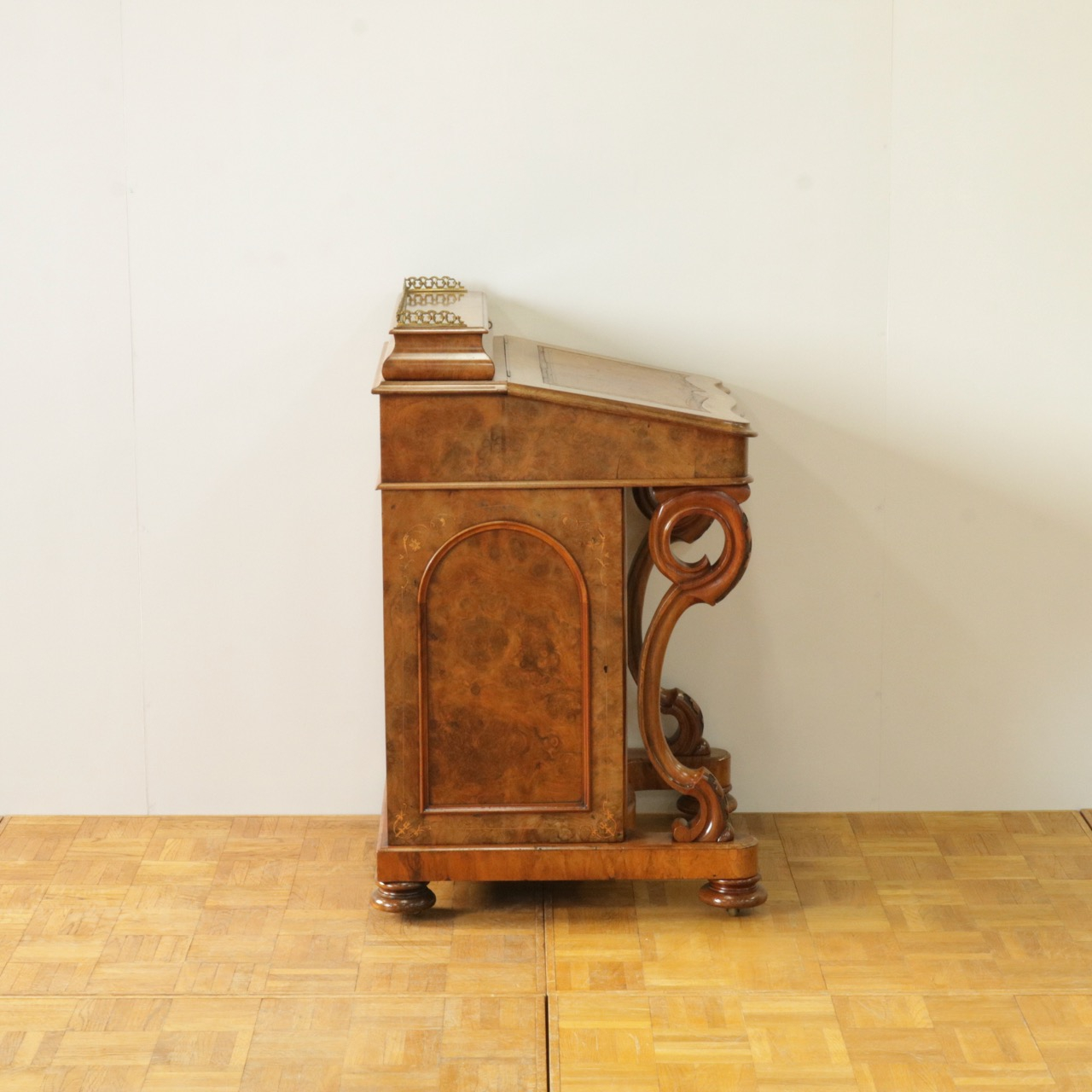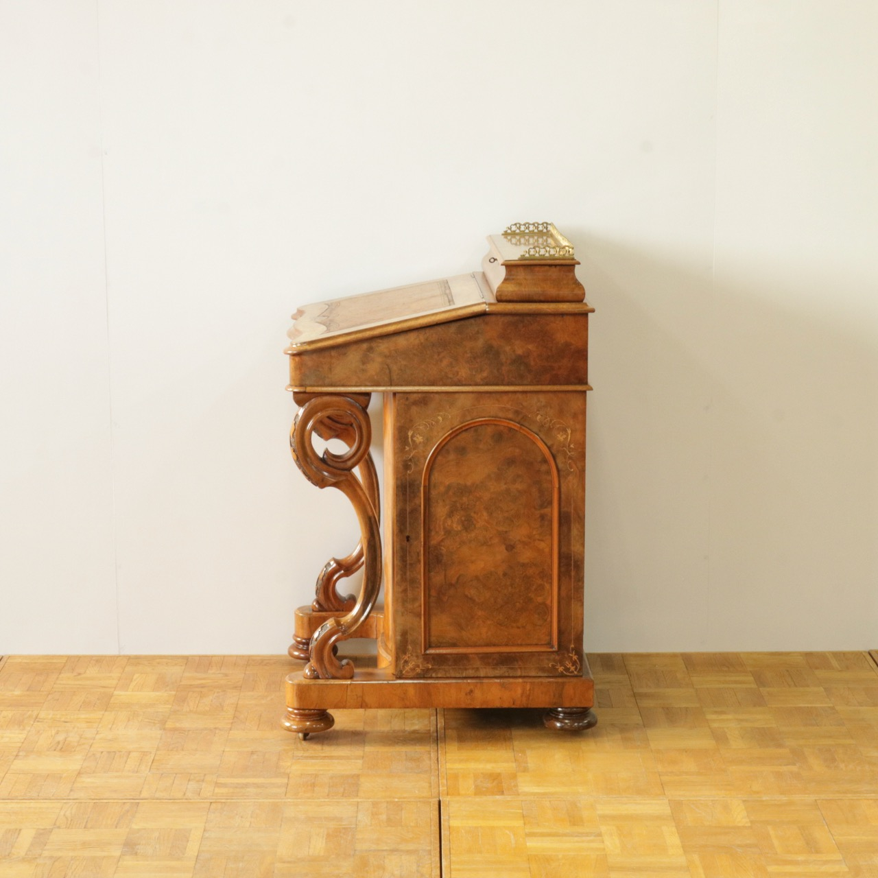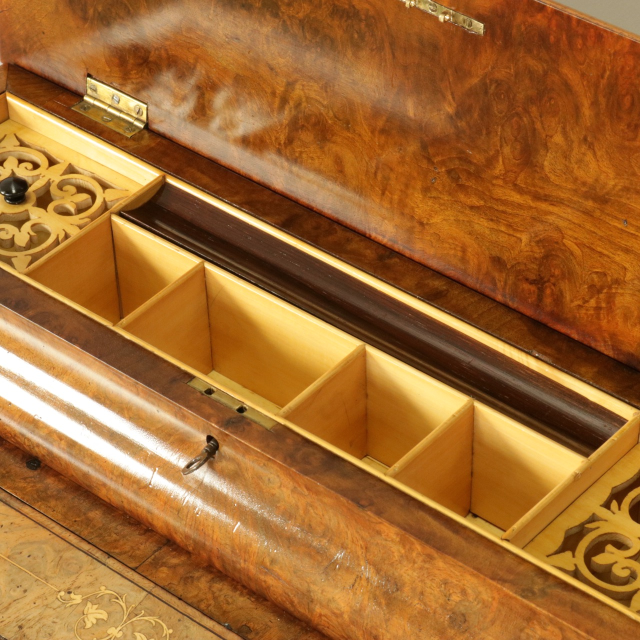 優美な曲線を描くデザインや繊細なインレイ細工、ウォールナットの杢目、真鍮ギャラリー、蓋を開けた内部の仕様などなど、どこを見ても美しく計算されて仕上げられた逸品。