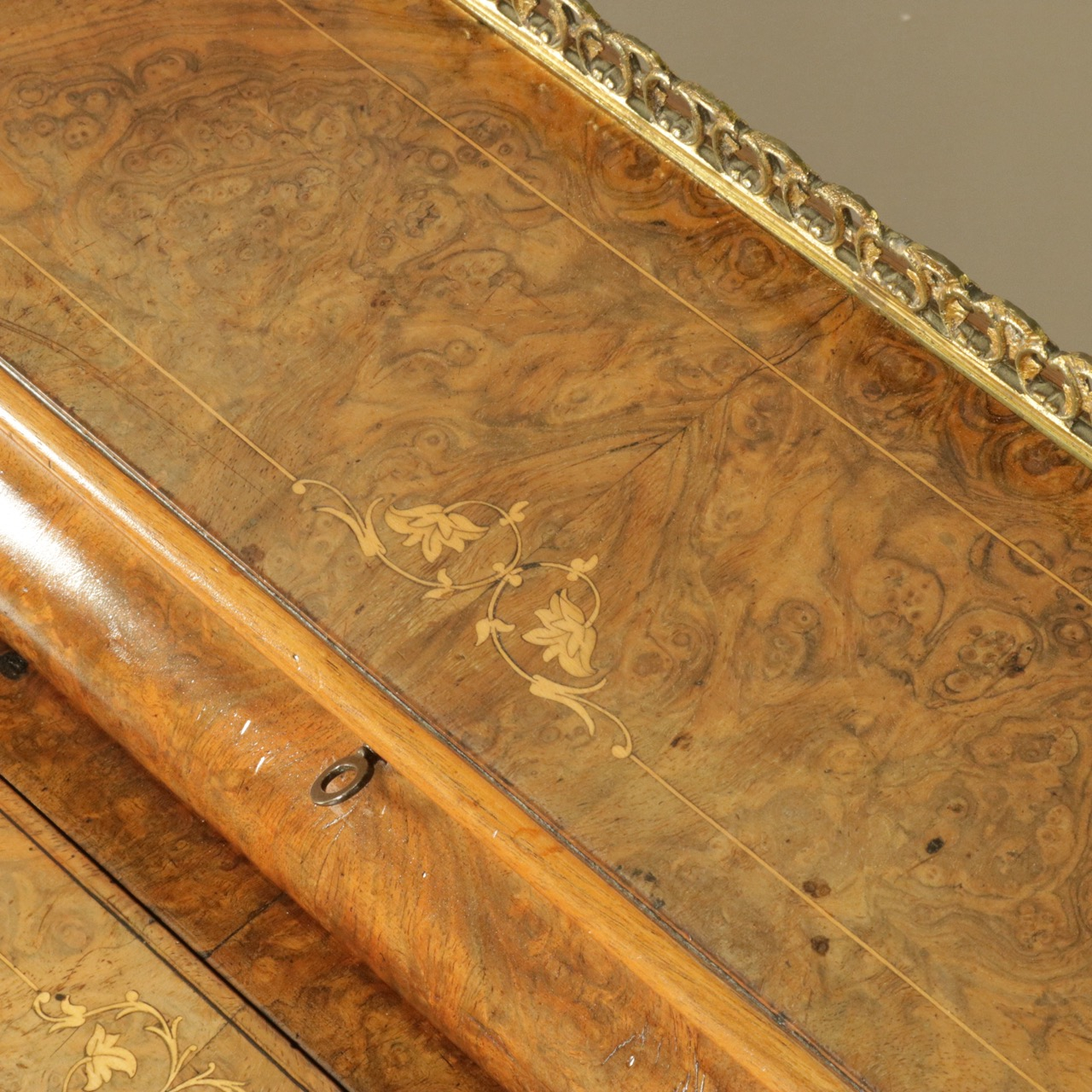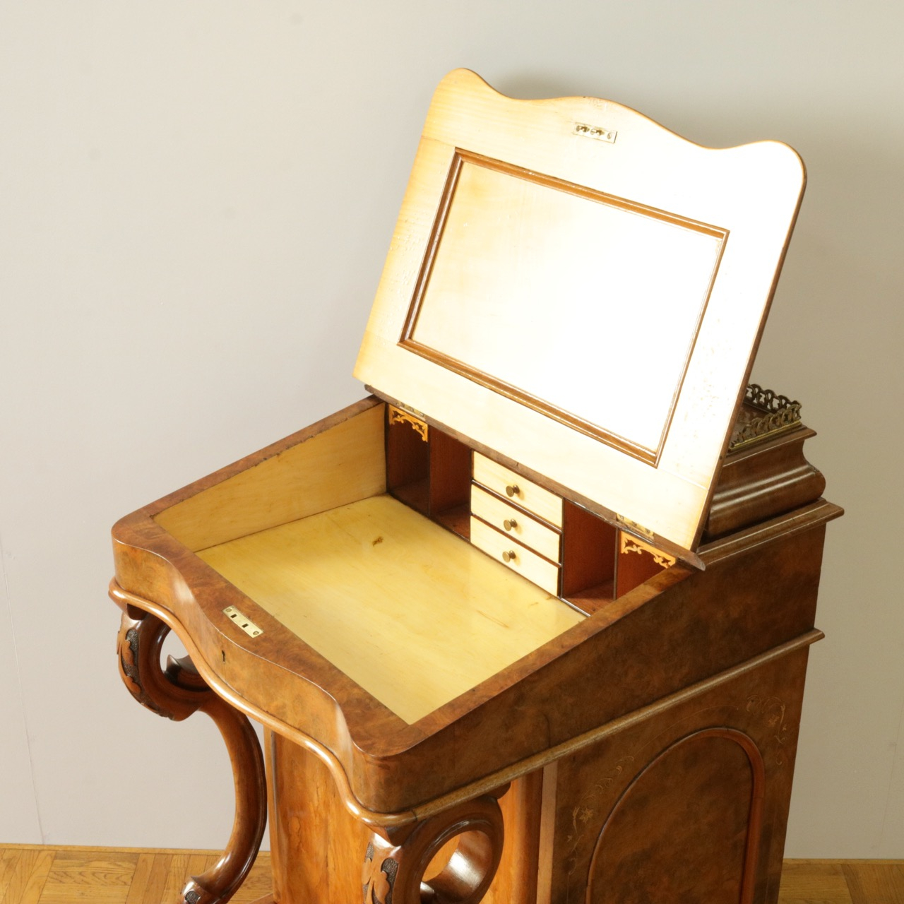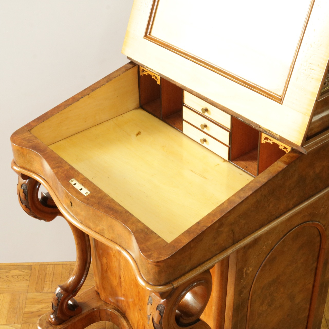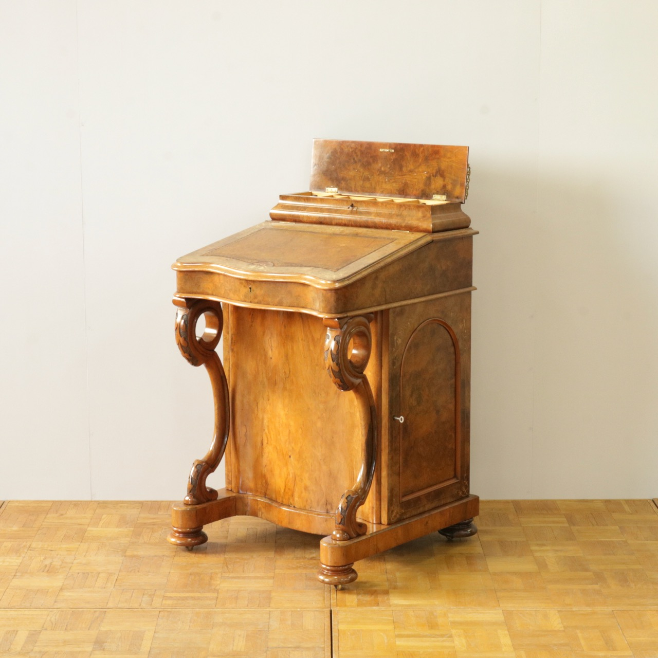 優美な曲線を描くデザインや繊細なインレイ細工、ウォールナットの杢目、真鍮ギャラリー、蓋を開けた内部の仕様などなど、どこを見ても美しく計算されて仕上げられた逸品。