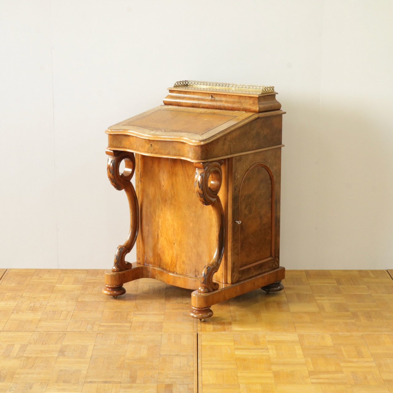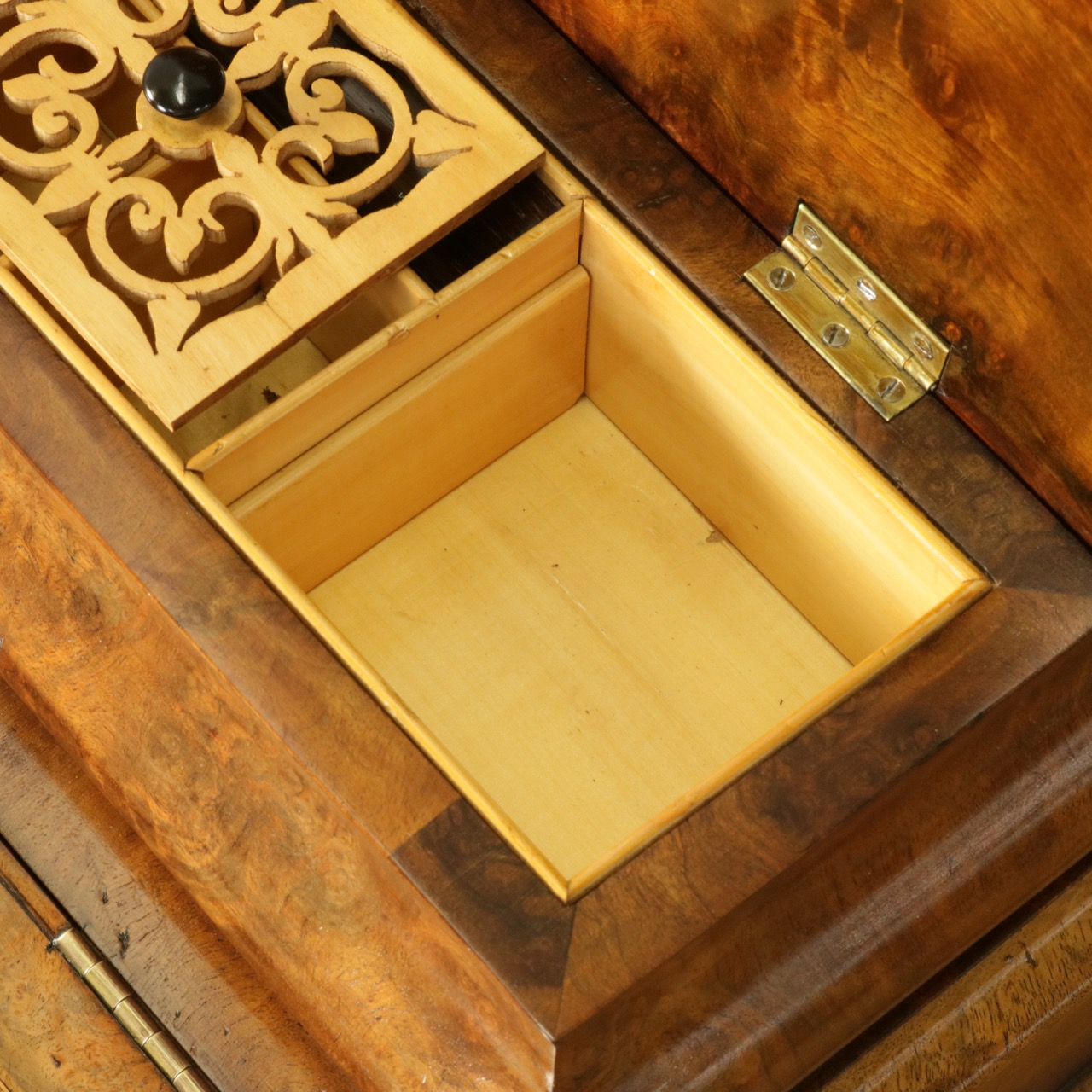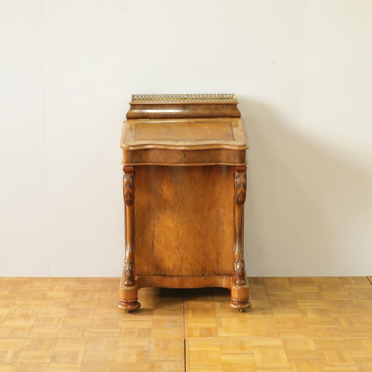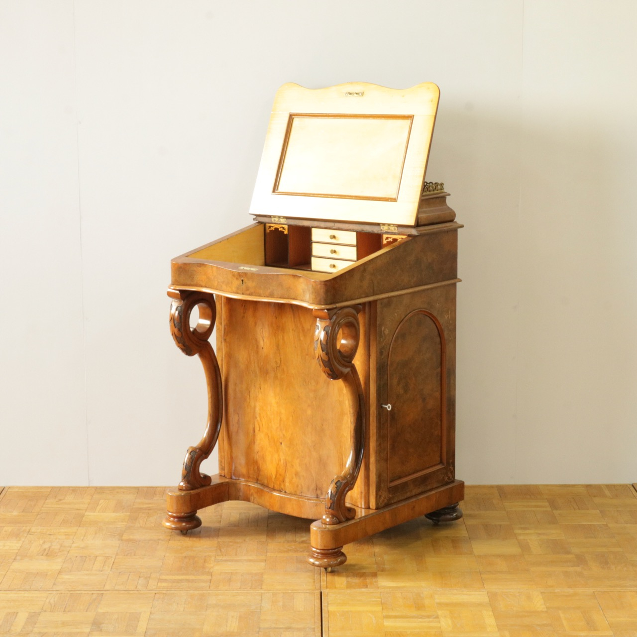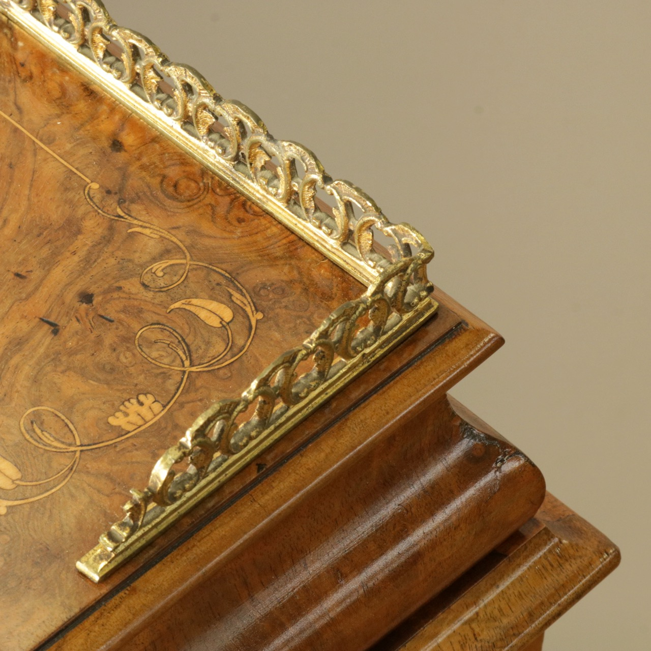 優美な曲線を描くデザインや繊細なインレイ細工、ウォールナットの杢目、真鍮ギャラリー、蓋を開けた内部の仕様などなど、どこを見ても美しく計算されて仕上げられた逸品。