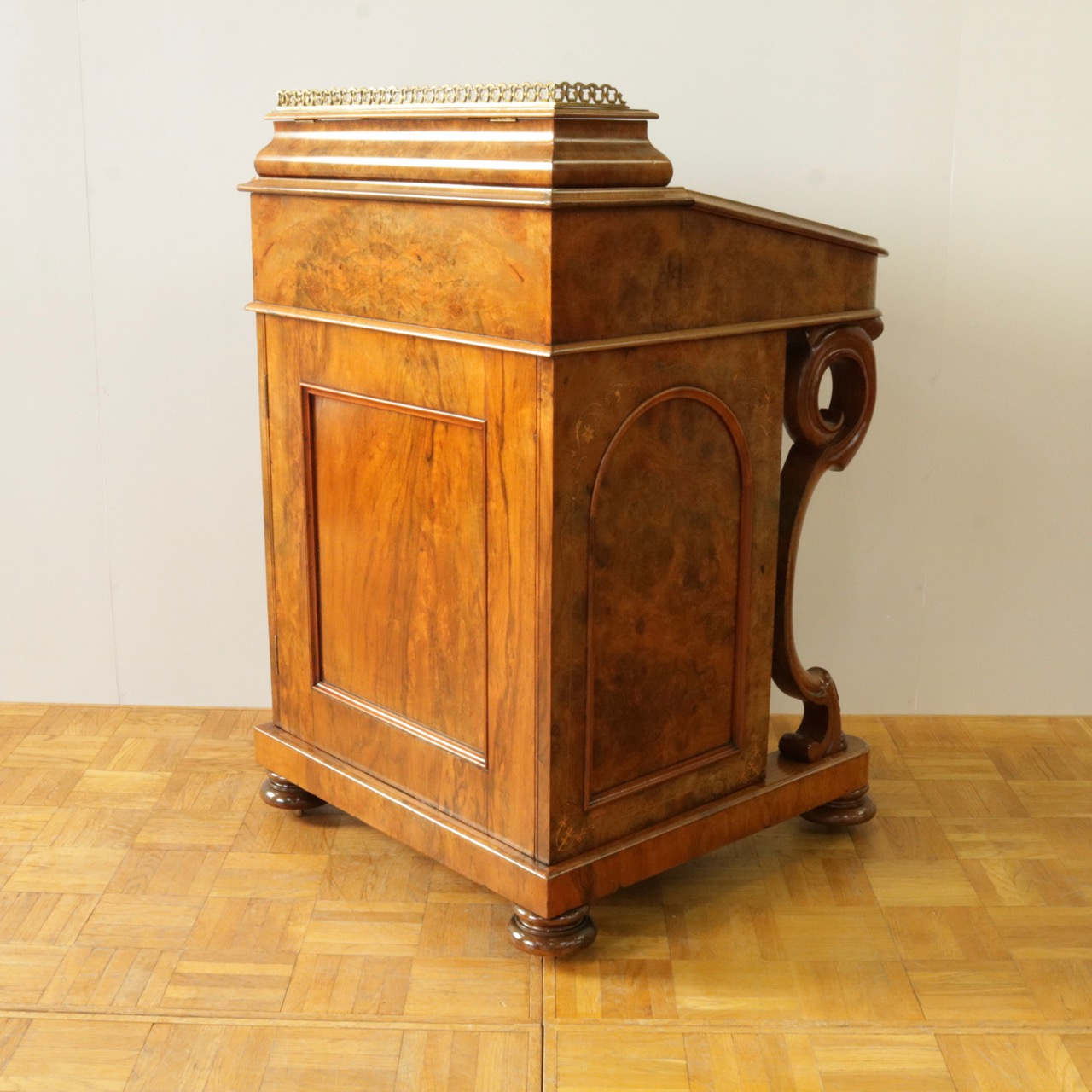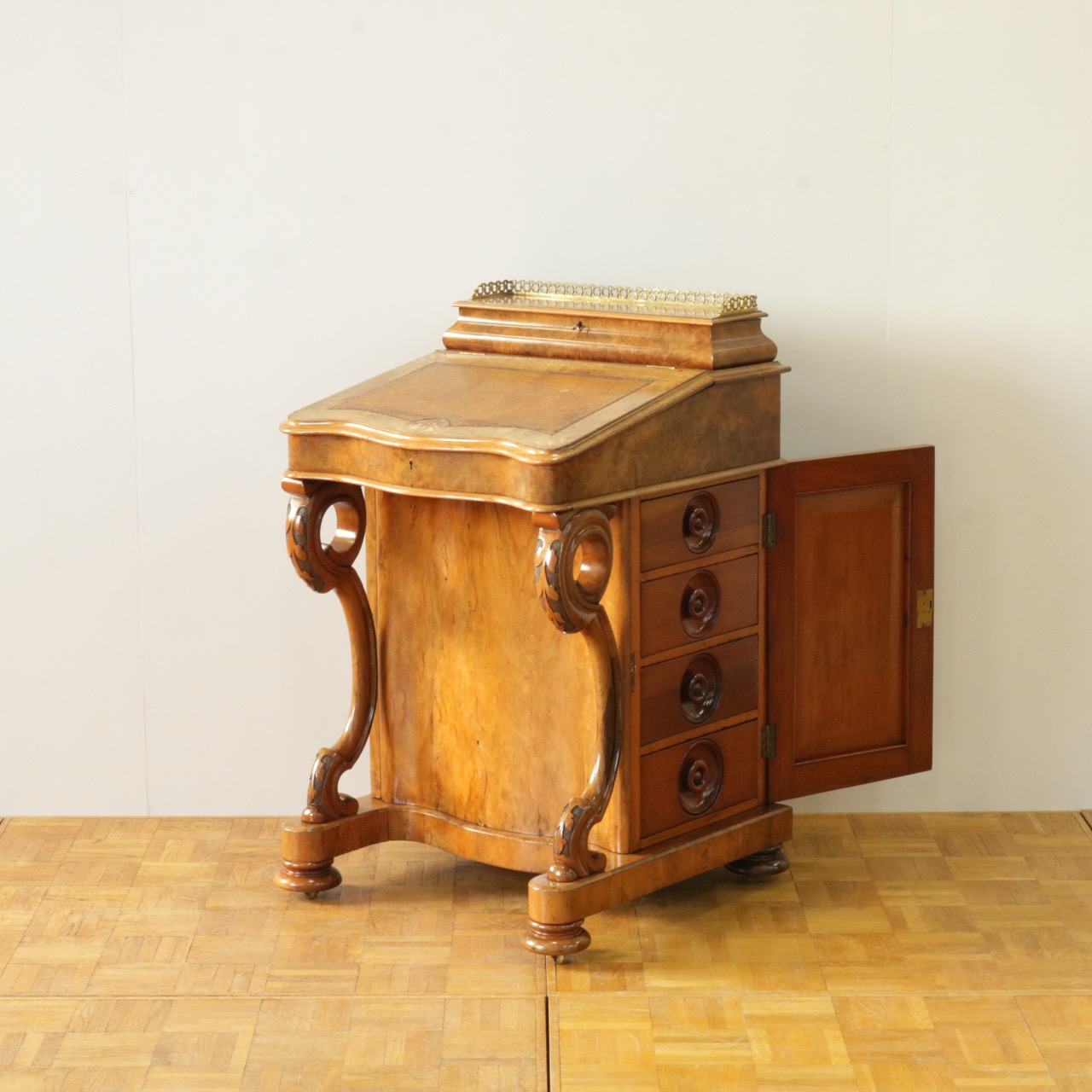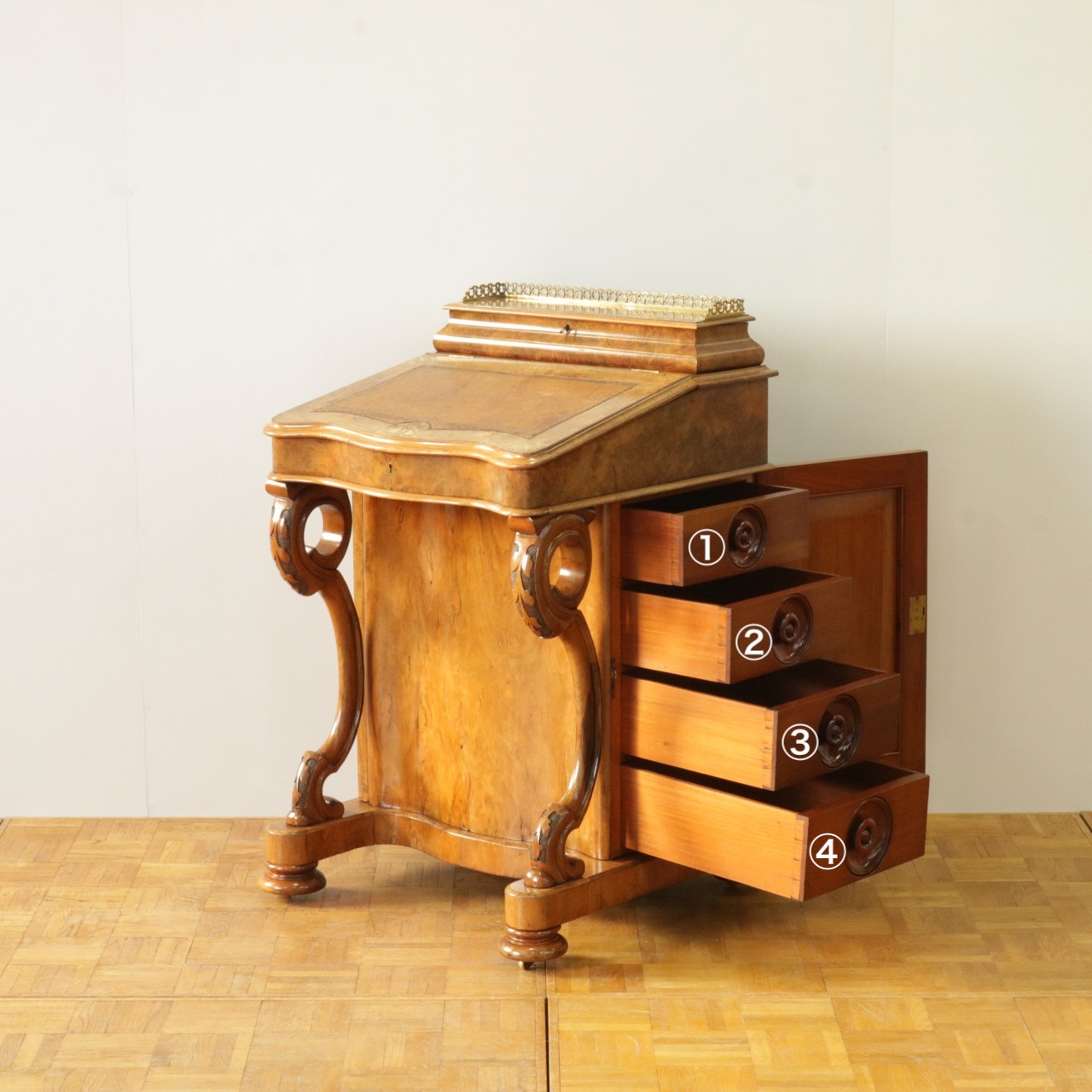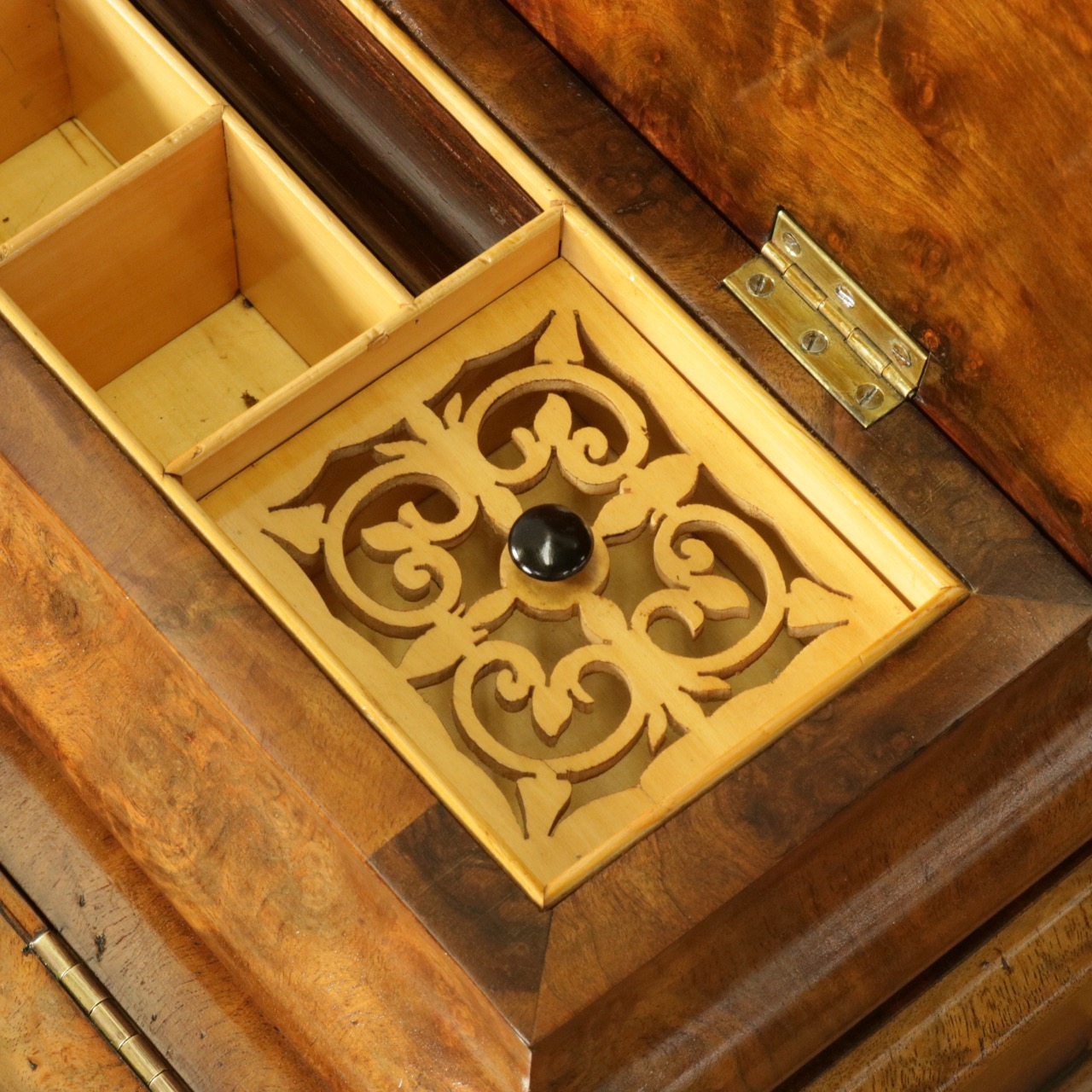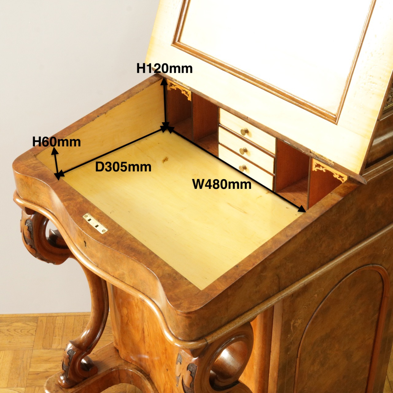 優美な曲線を描くデザインや繊細なインレイ細工、ウォールナットの杢目、真鍮ギャラリー、蓋を開けた内部の仕様などなど、どこを見ても美しく計算されて仕上げられた逸品。