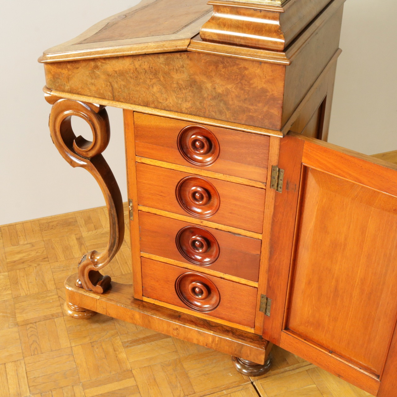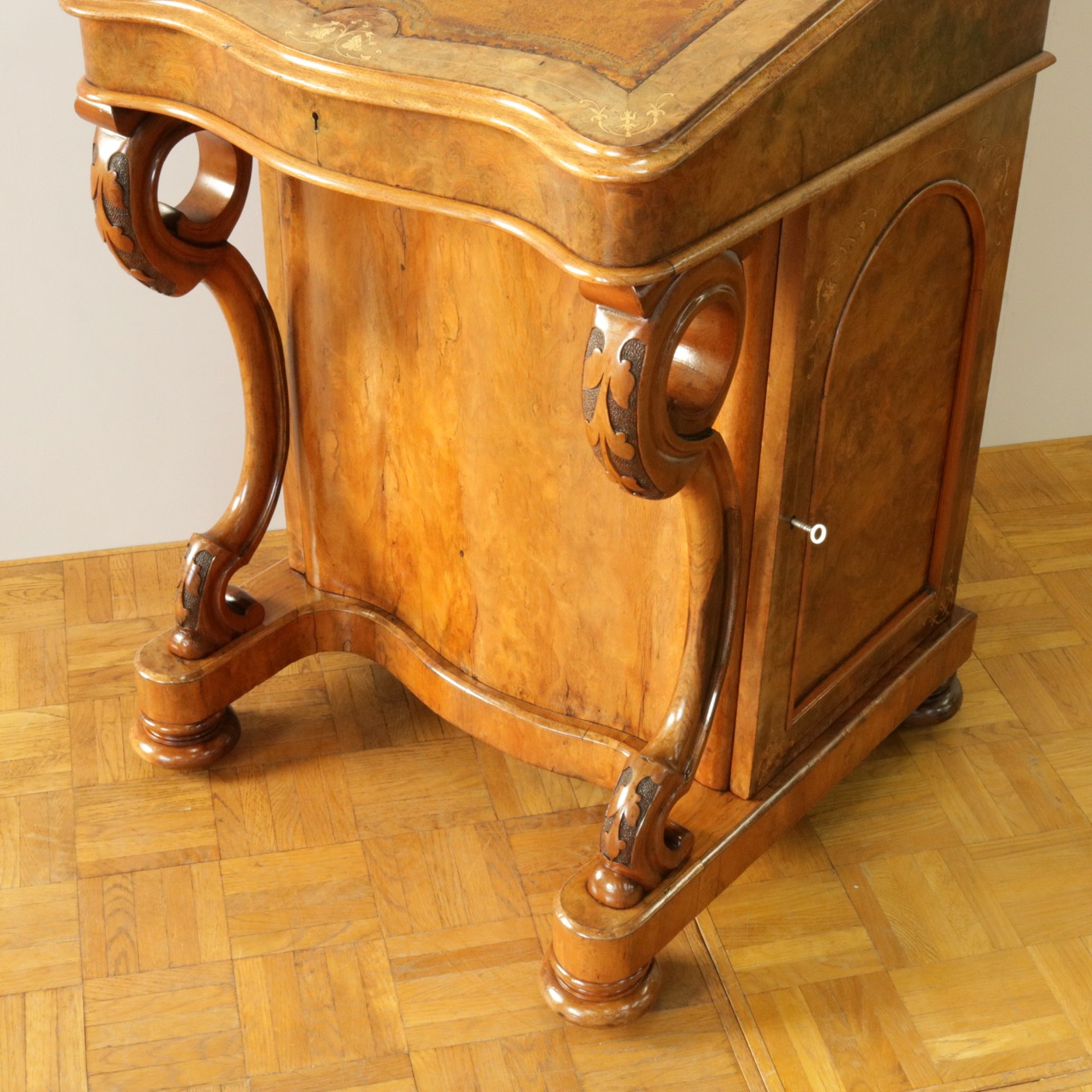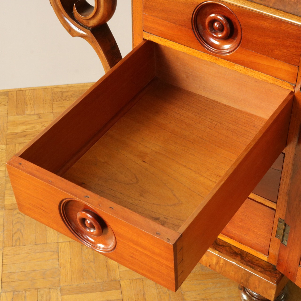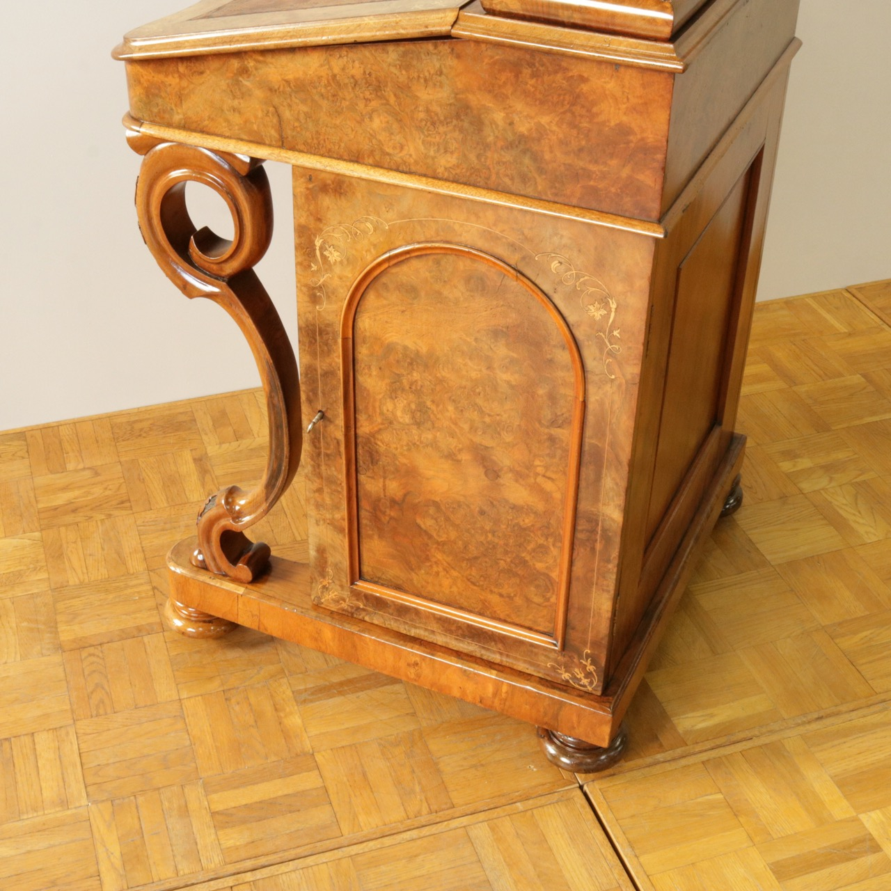 優美な曲線を描くデザインや繊細なインレイ細工、ウォールナットの杢目、真鍮ギャラリー、蓋を開けた内部の仕様などなど、どこを見ても美しく計算されて仕上げられた逸品。