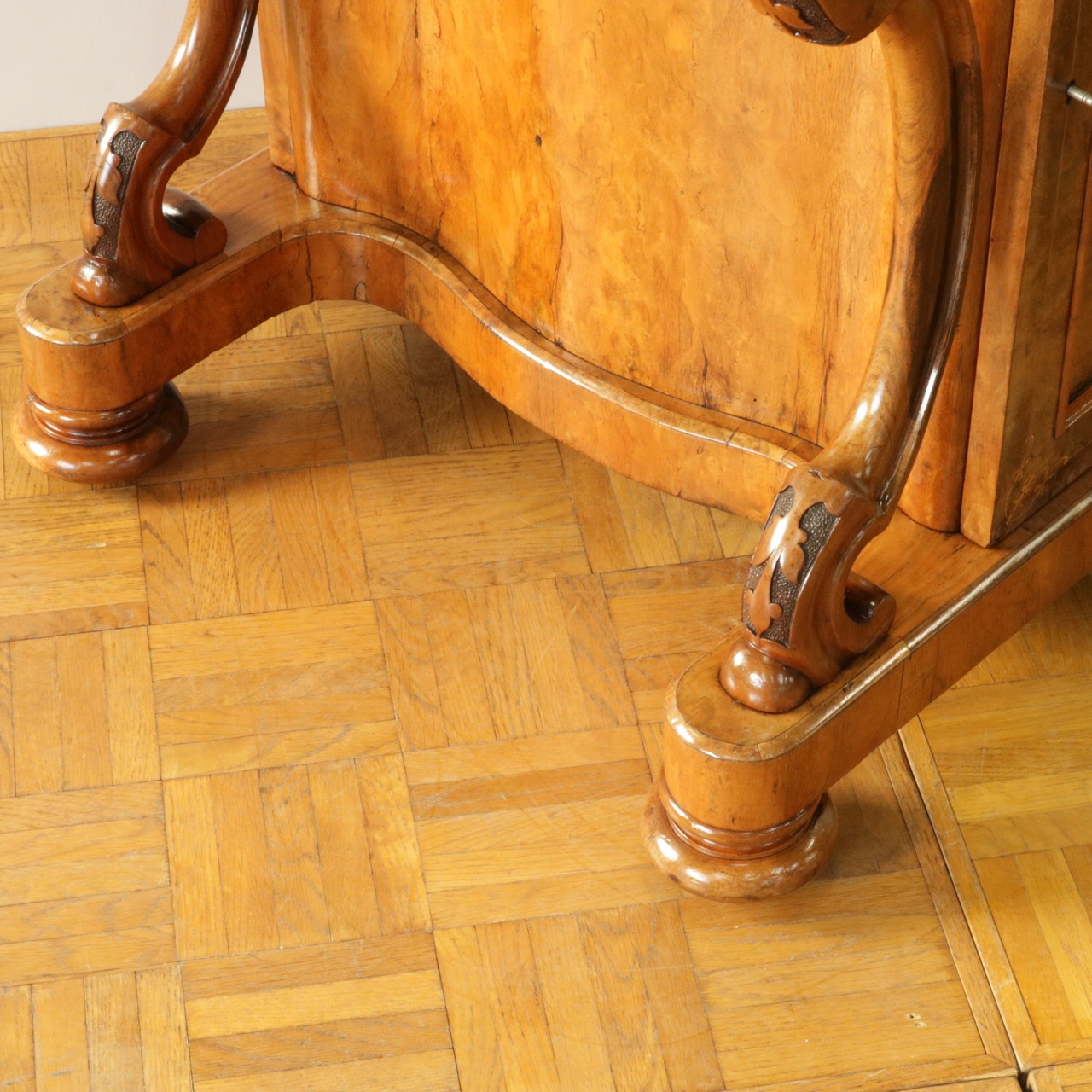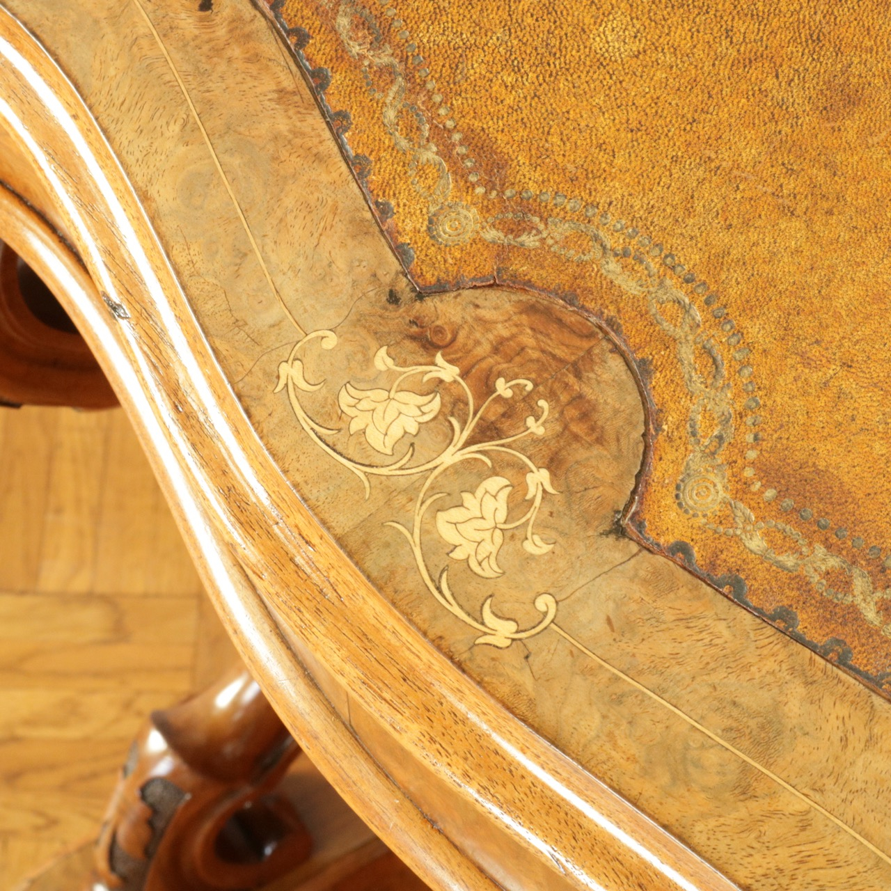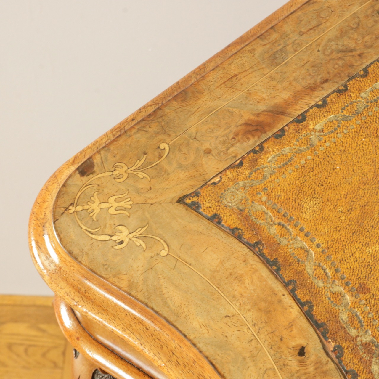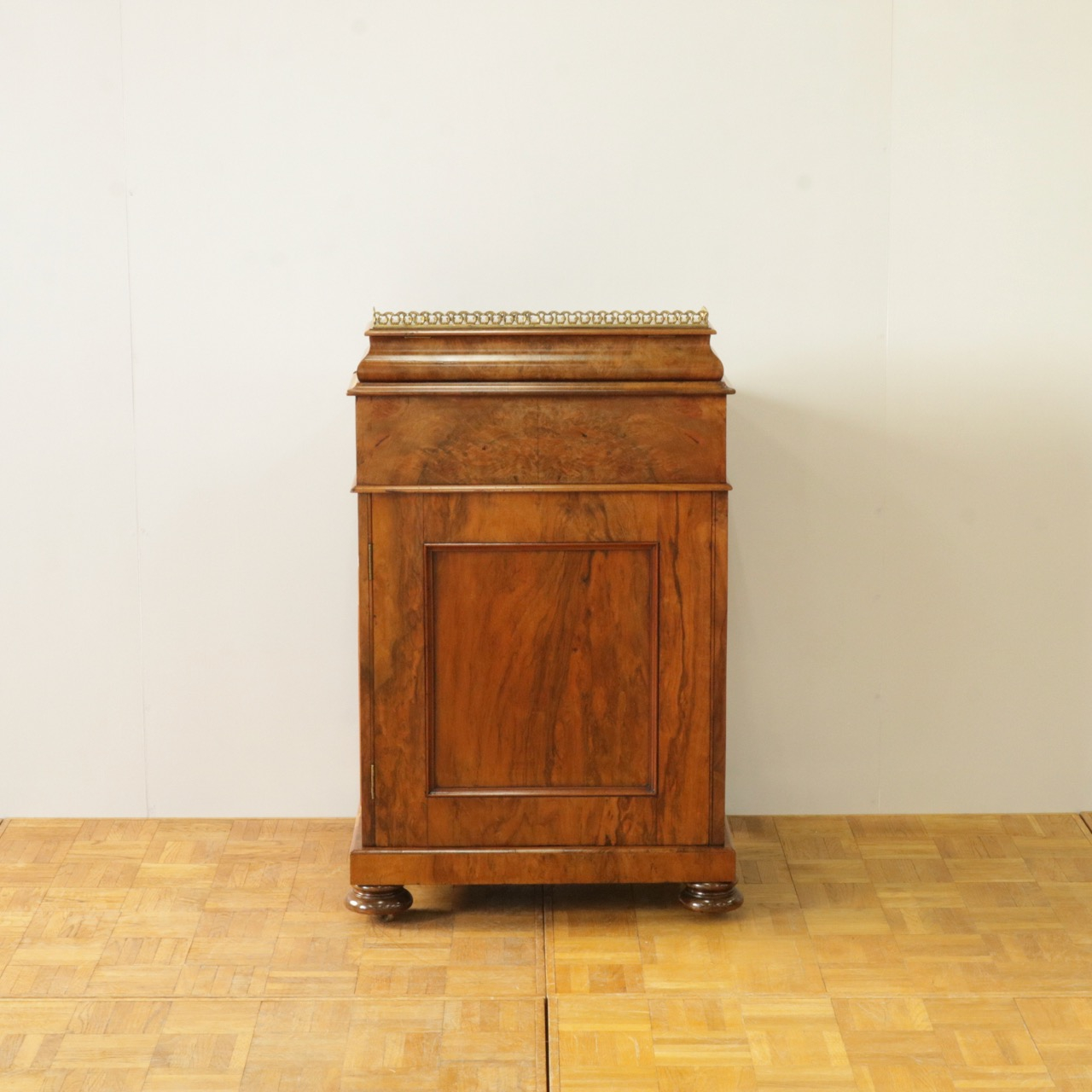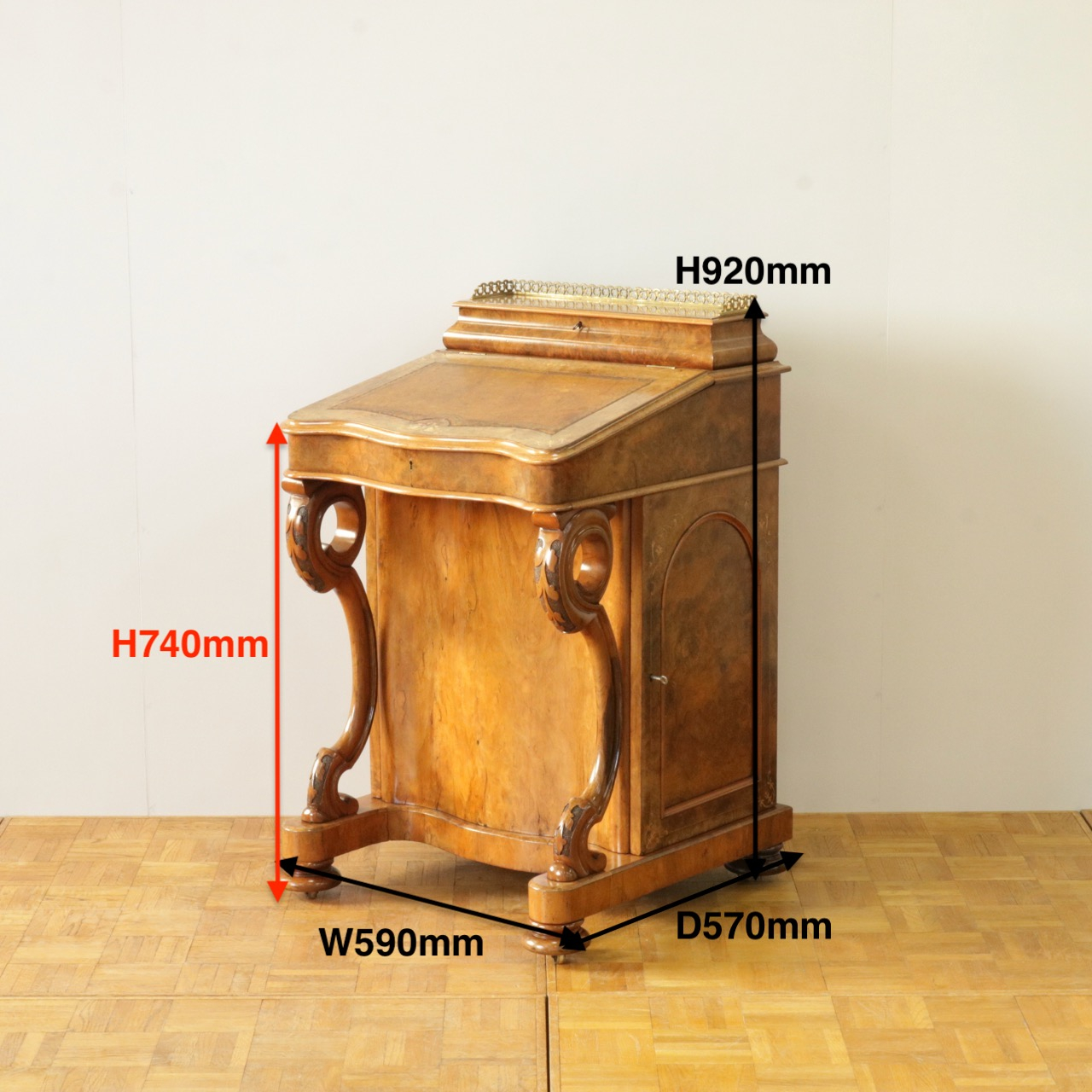 優美な曲線を描くデザインや繊細なインレイ細工、ウォールナットの杢目、真鍮ギャラリー、蓋を開けた内部の仕様などなど、どこを見ても美しく計算されて仕上げられた逸品。