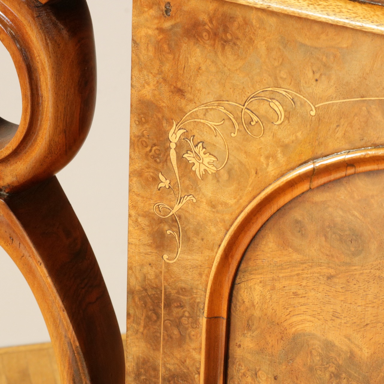 ウォールナットの杢目とインレイ細工の組み合わせが一際目を引きます。