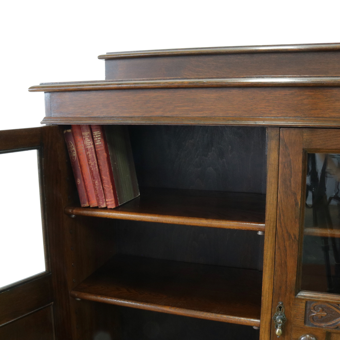 ブックケースの下に薄い引き出しが2つついています。フレットワークや取手の部分など、細部の装飾も素敵な一品です。