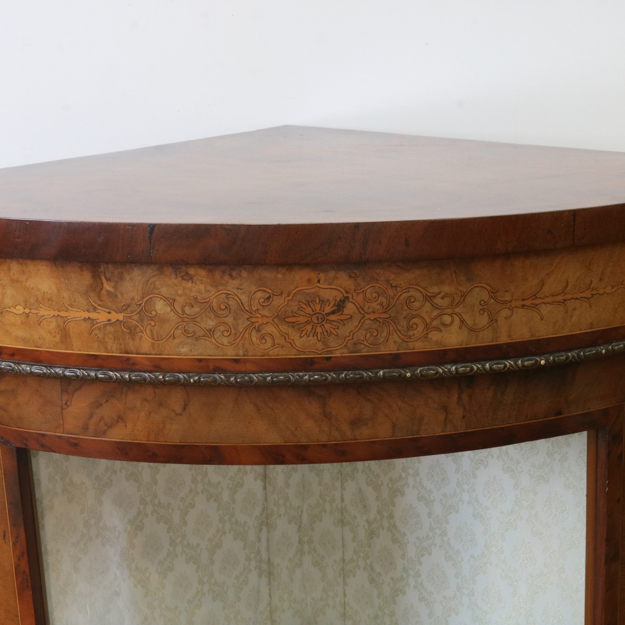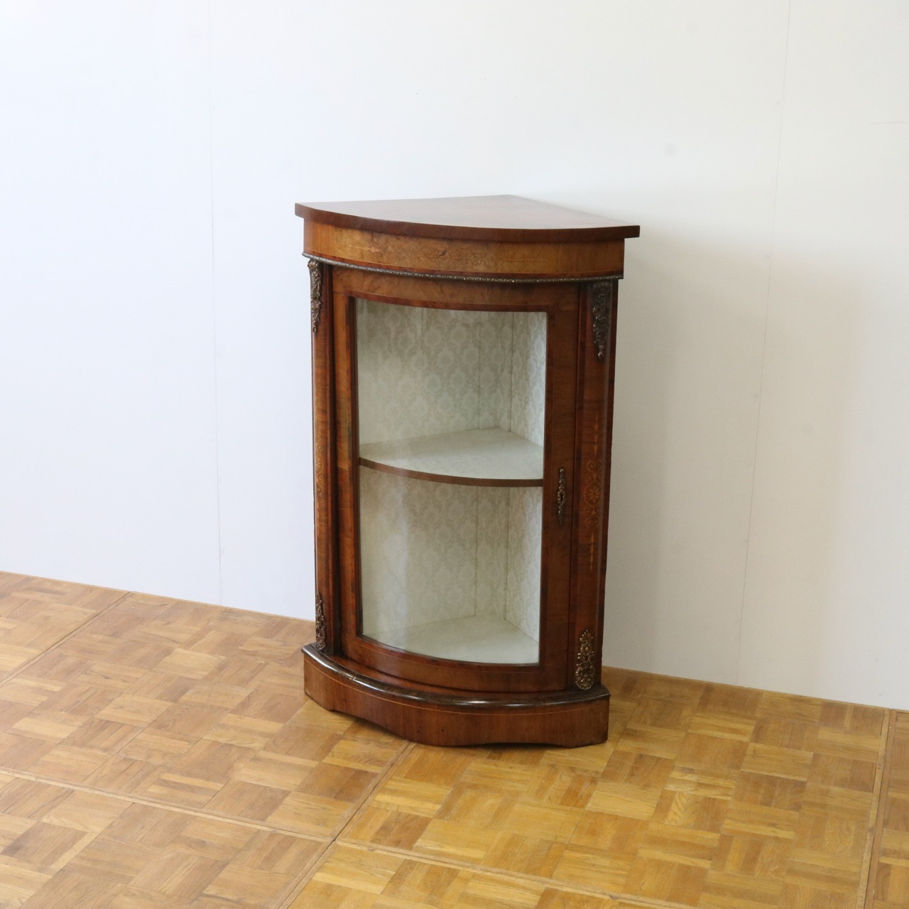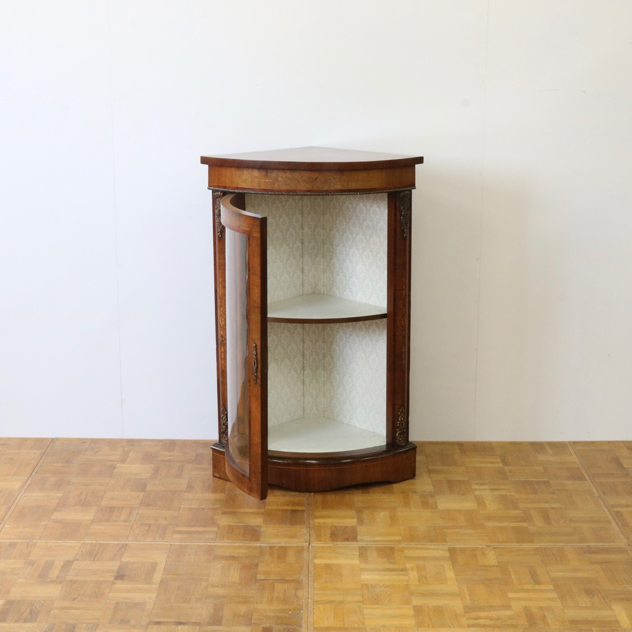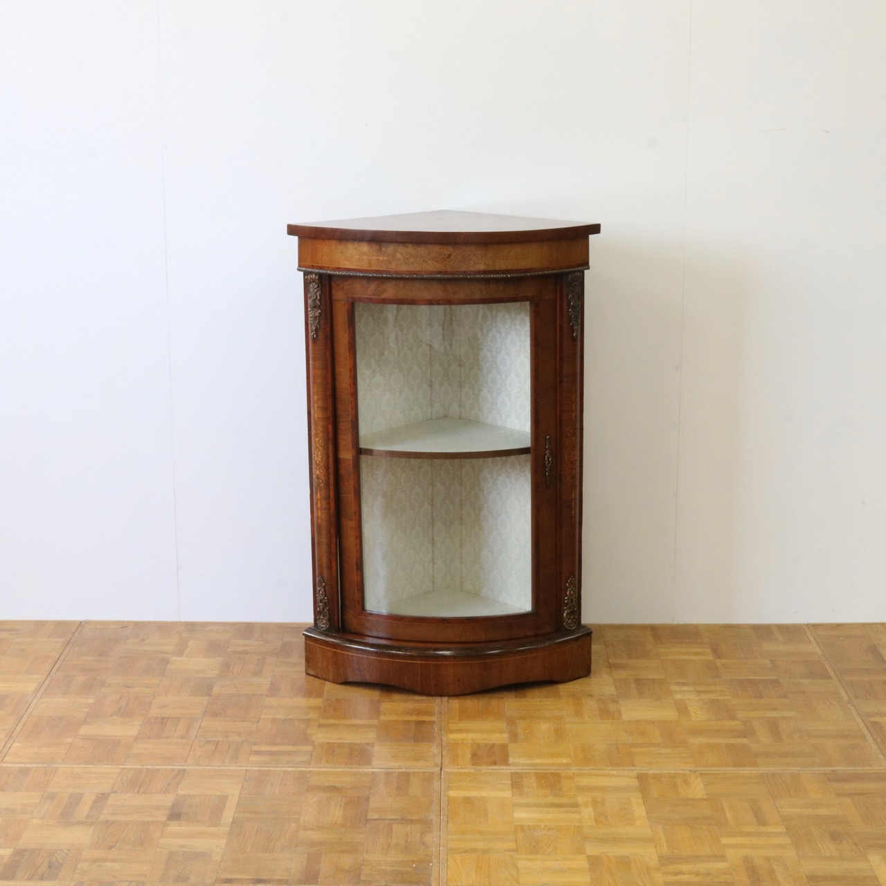 配送料の目安 ▶︎1890年代ヴィクトリアン、ウォールナットのコーナーキャビネット。美しい木目と繊細なインレイが施されたアンティークらしい意匠が際立つデザイン。コーナーを華やかに彩ります。