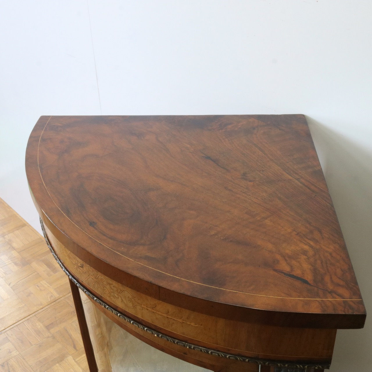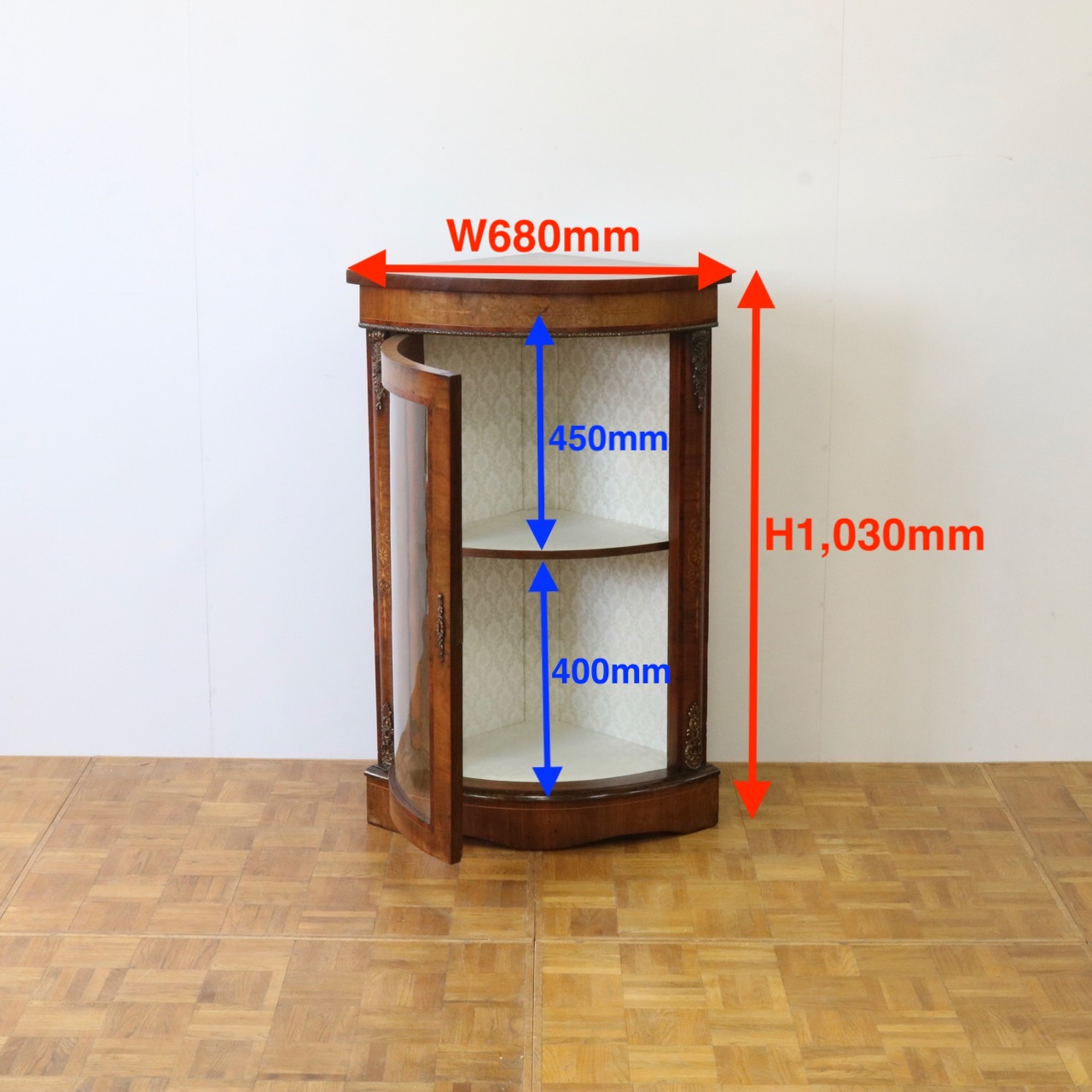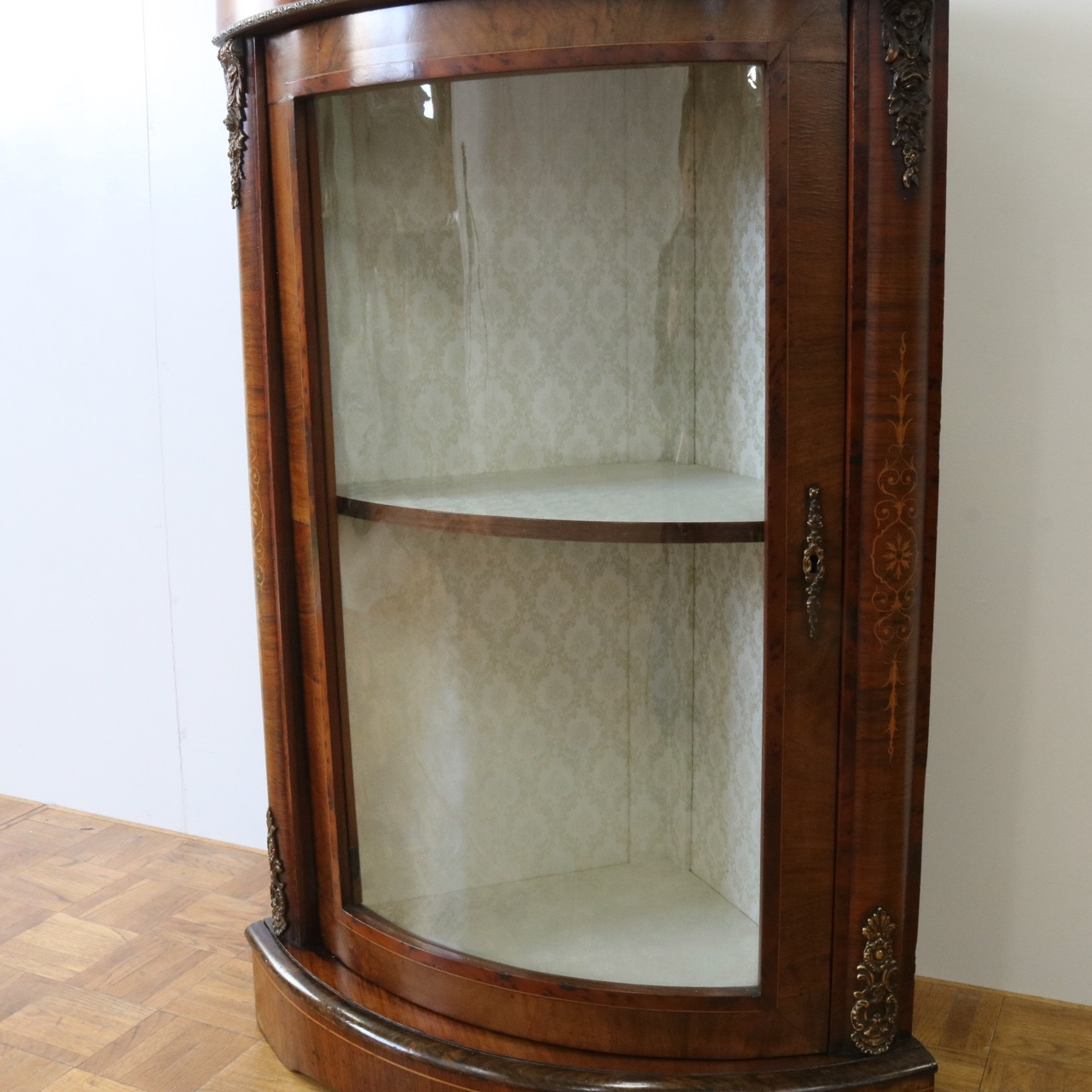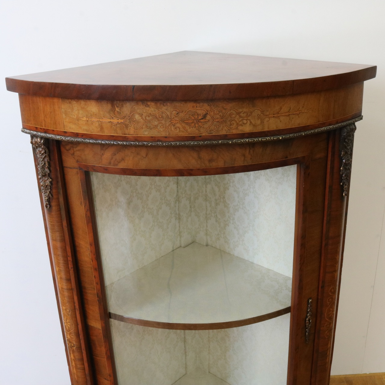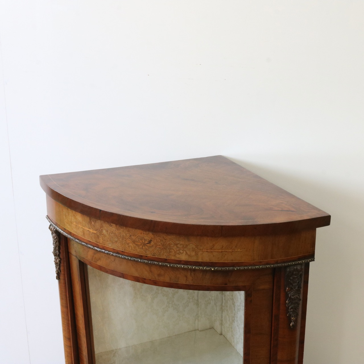 配送料の目安 ▶︎1890年代ヴィクトリアン、ウォールナットのコーナーキャビネット。美しい木目と繊細なインレイが施されたアンティークらしい意匠が際立つデザイン。コーナーを華やかに彩ります。