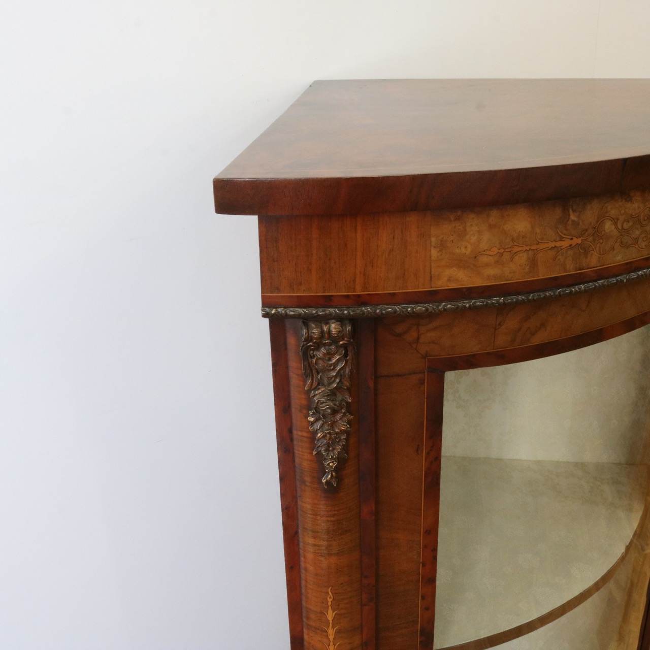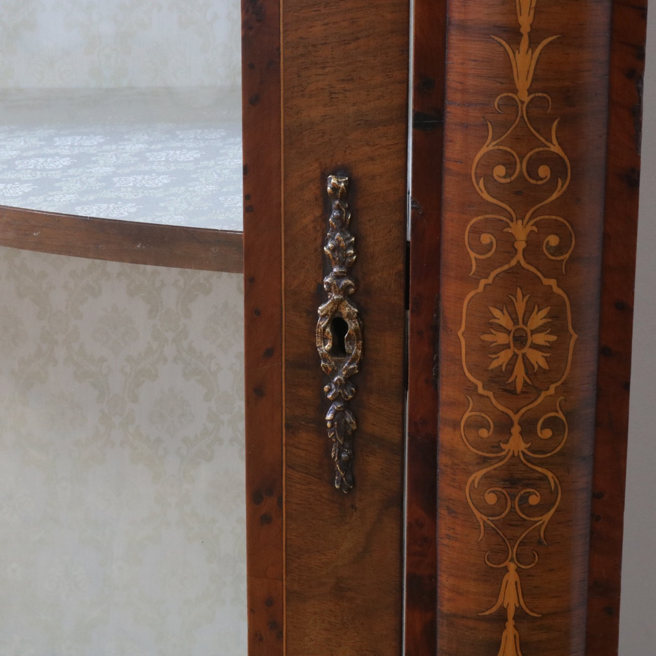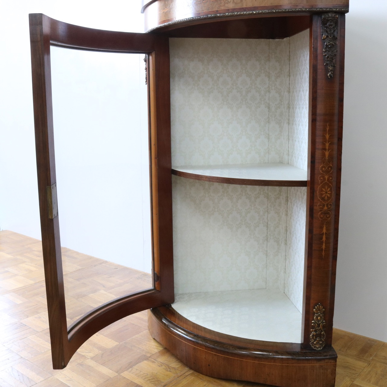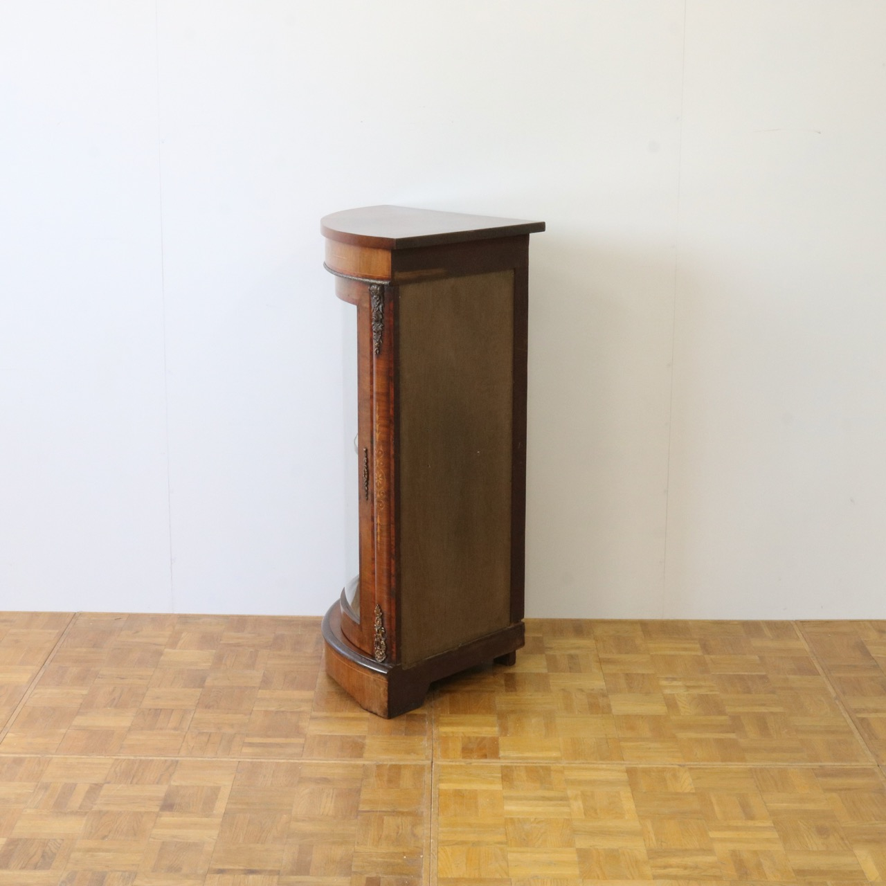 配送料の目安 ▶︎1890年代ヴィクトリアン、ウォールナットのコーナーキャビネット。美しい木目と繊細なインレイが施されたアンティークらしい意匠が際立つデザイン。コーナーを華やかに彩ります。