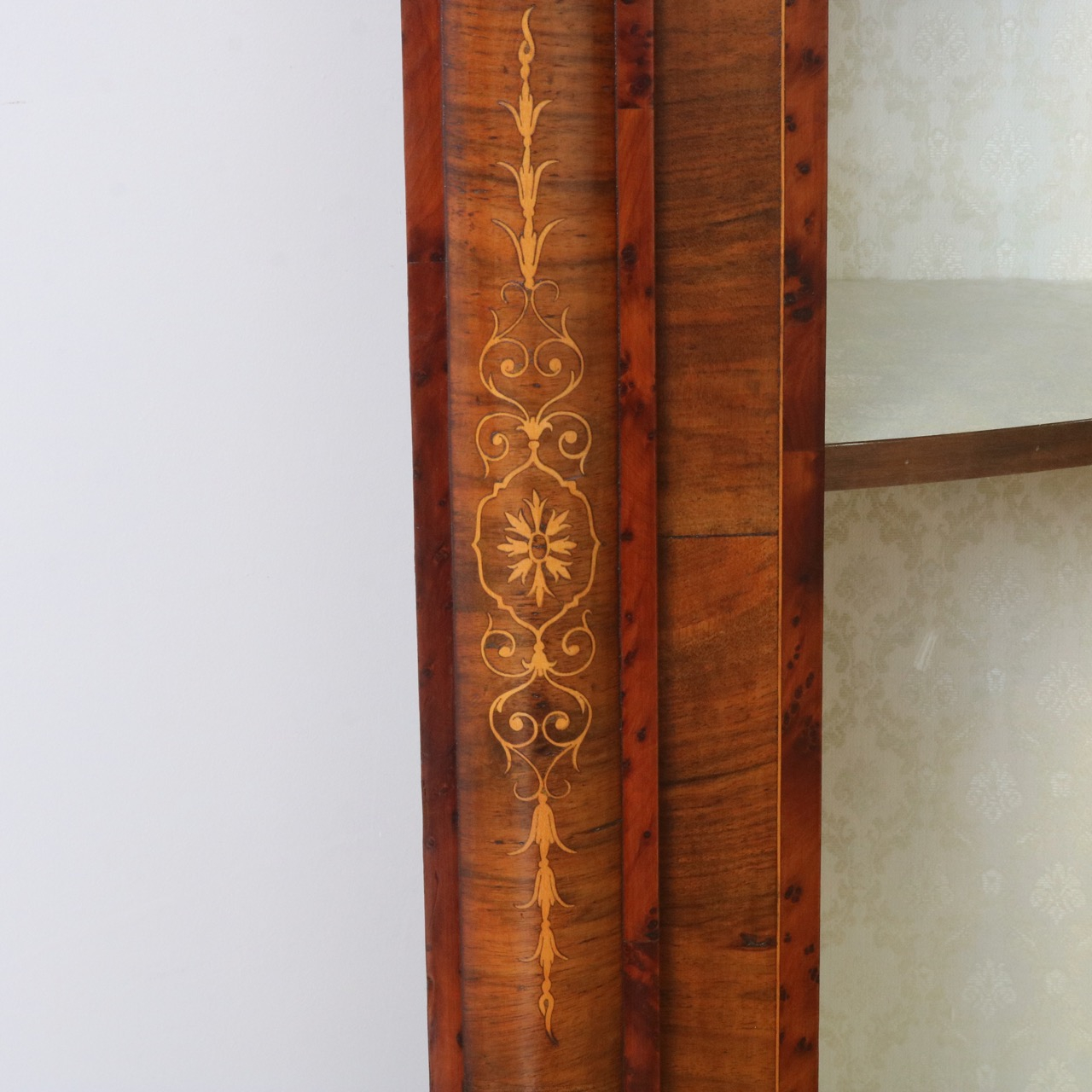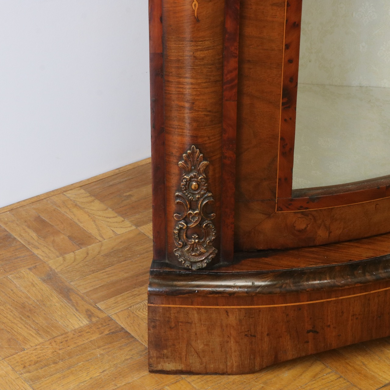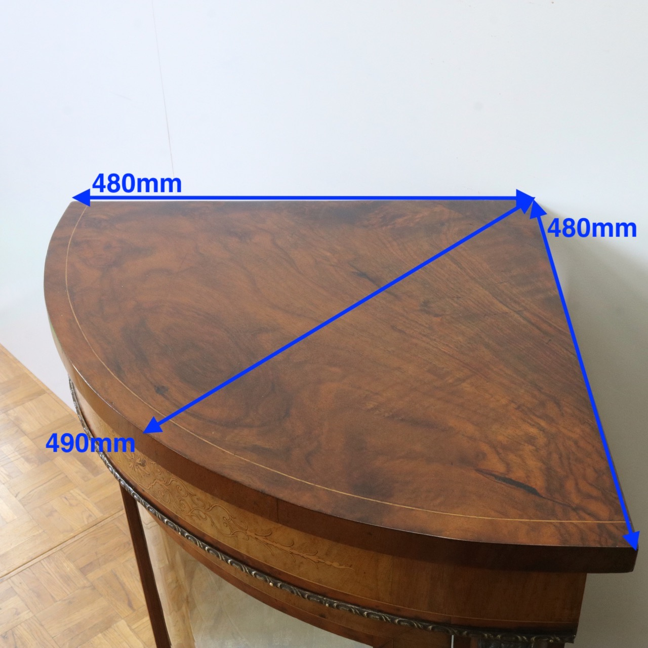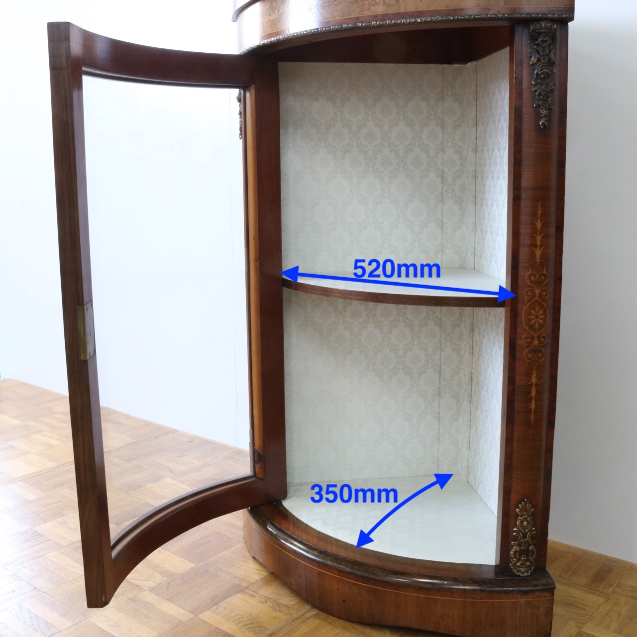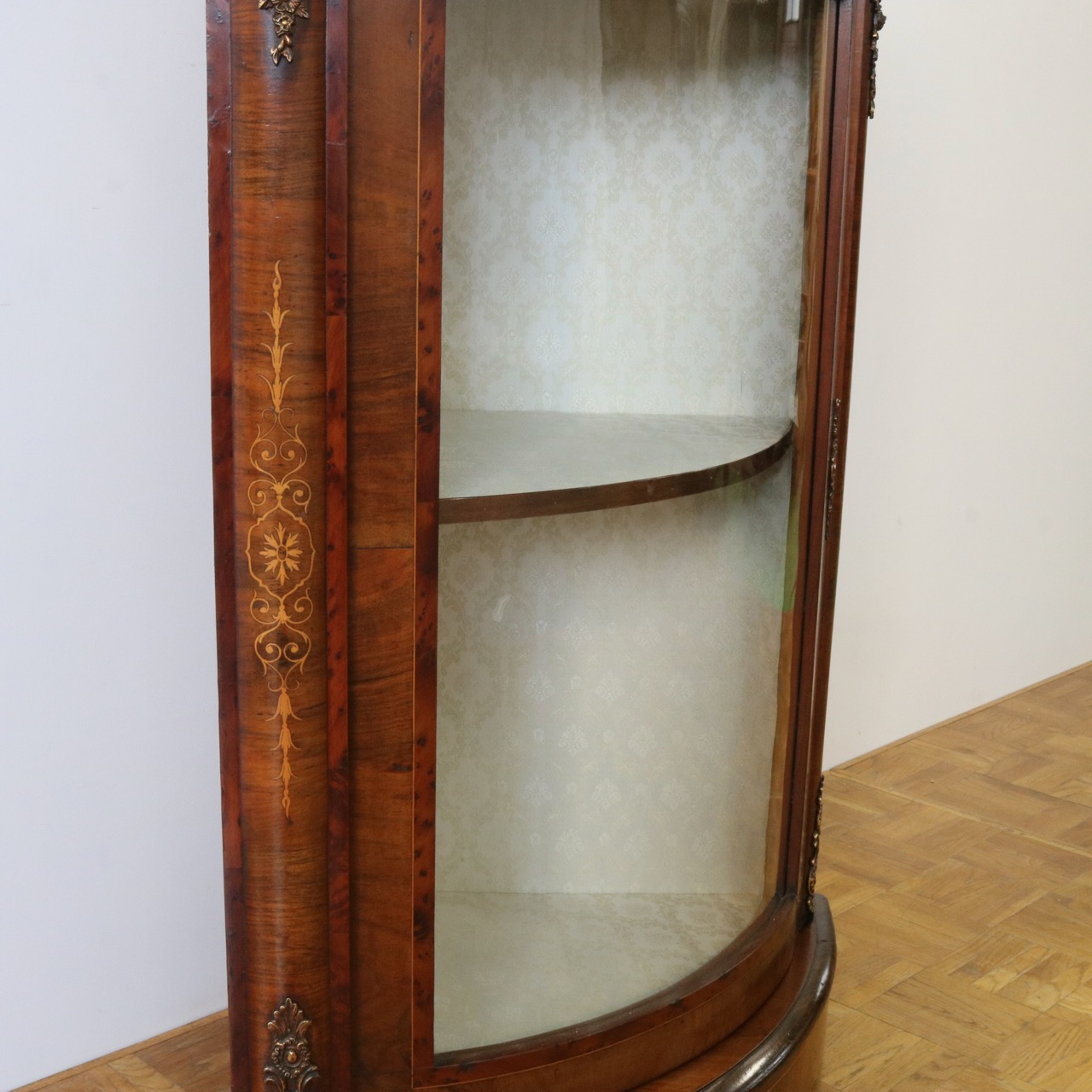 配送料の目安 ▶︎1890年代ヴィクトリアン、ウォールナットのコーナーキャビネット。美しい木目と繊細なインレイが施されたアンティークらしい意匠が際立つデザイン。コーナーを華やかに彩ります。