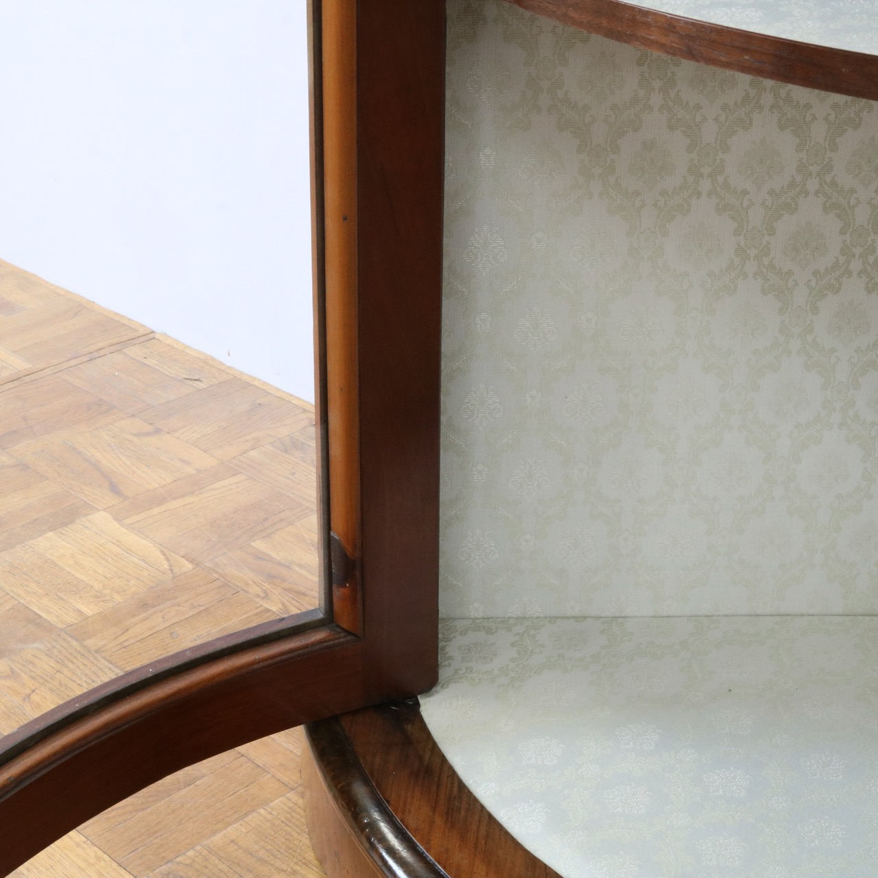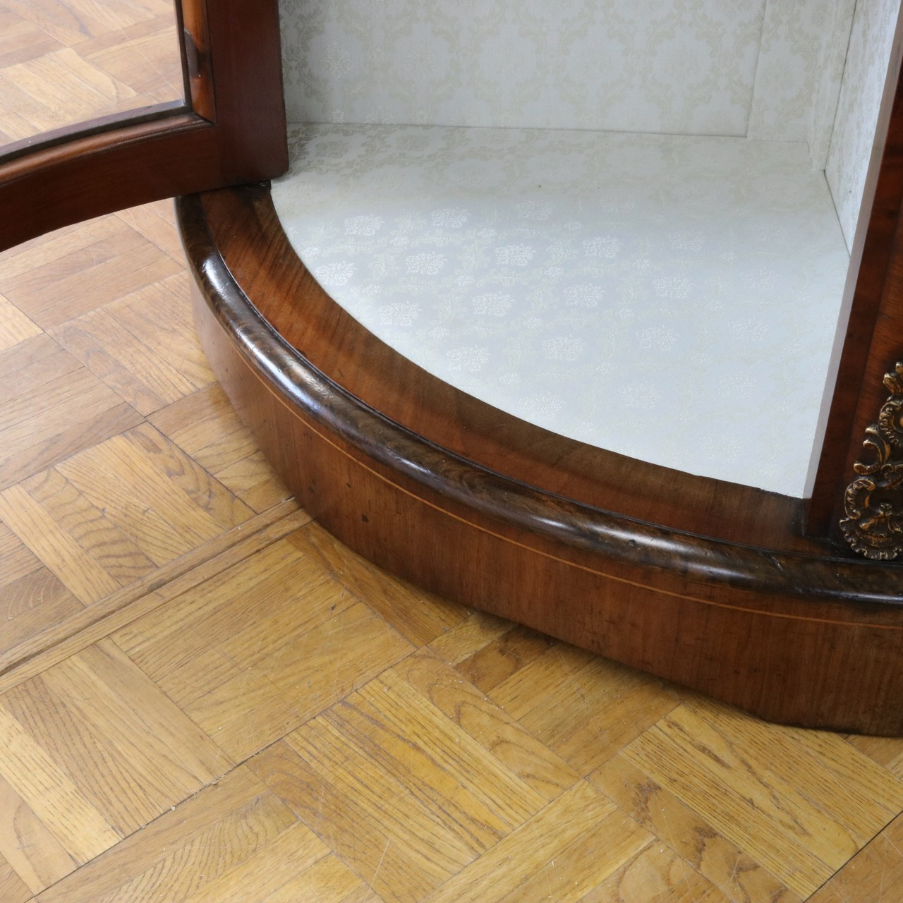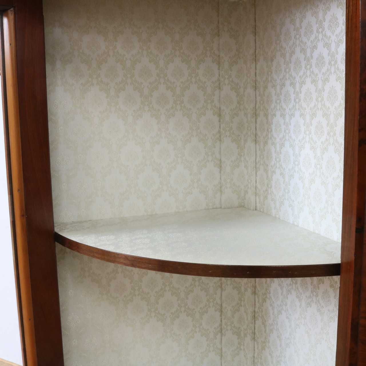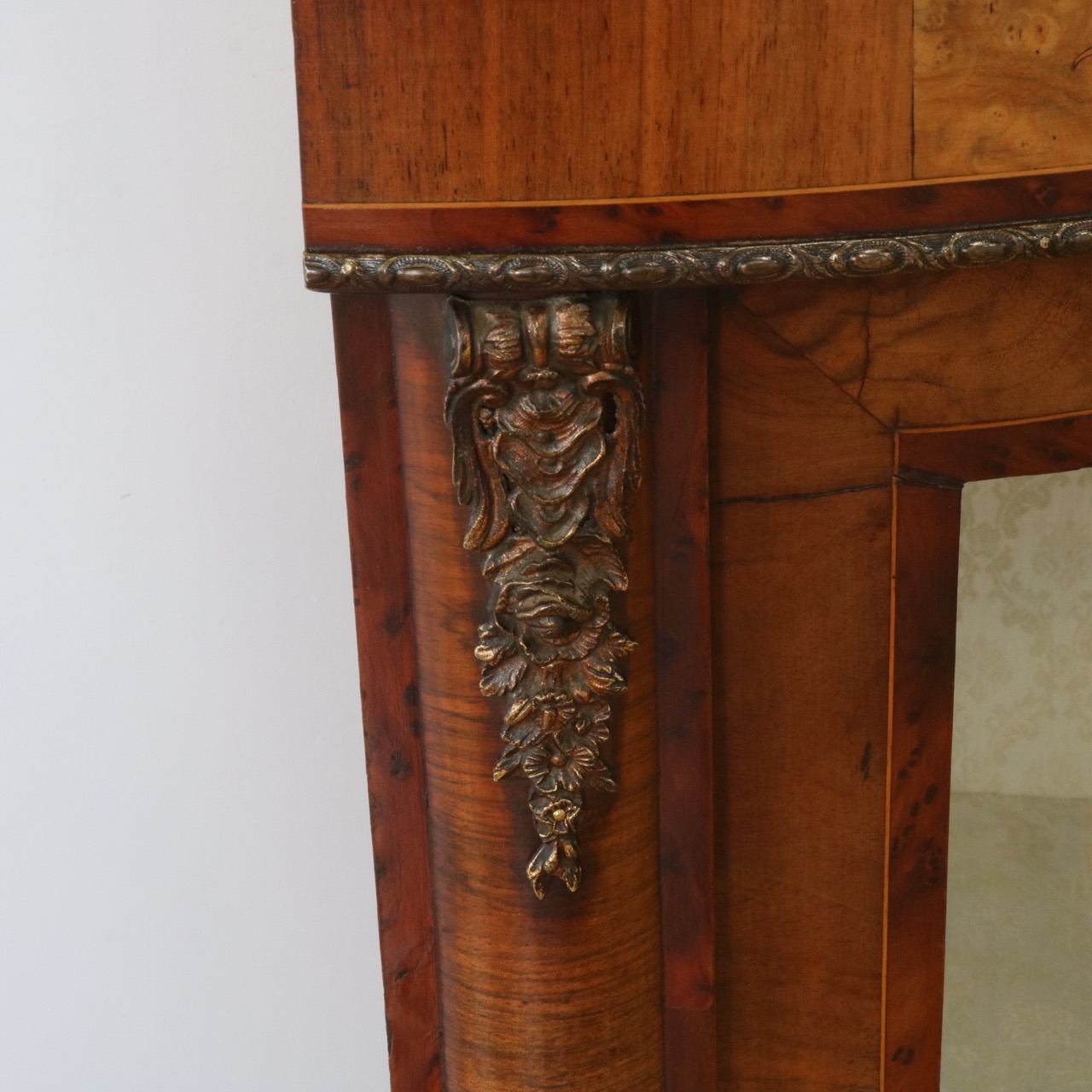 配送料の目安 ▶︎1890年代ヴィクトリアン、ウォールナットのコーナーキャビネット。美しい木目と繊細なインレイが施されたアンティークらしい意匠が際立つデザイン。コーナーを華やかに彩ります。