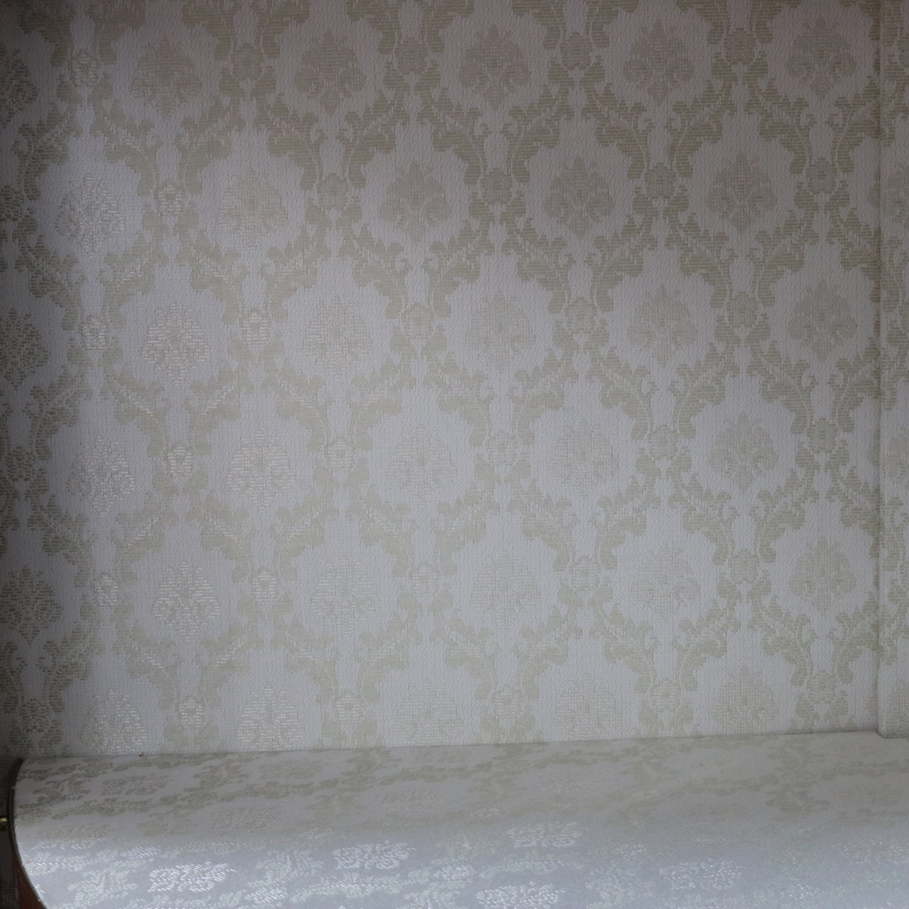 内部は明るく光沢感のある白いダマスク柄の生地を張りました。