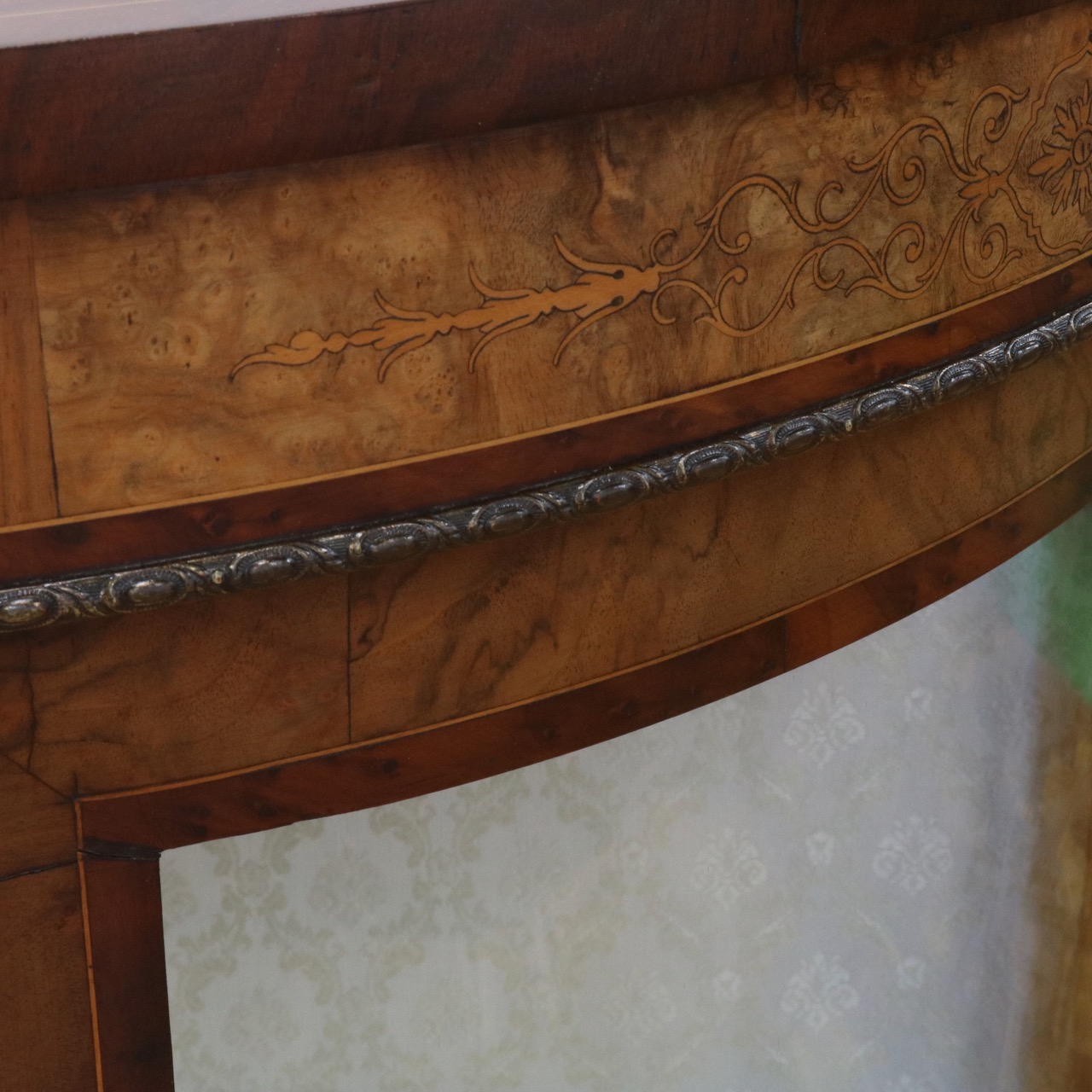 天板のすぐ下には、明るい色味のベースにお花のモチーフの優美なインレイ装飾。