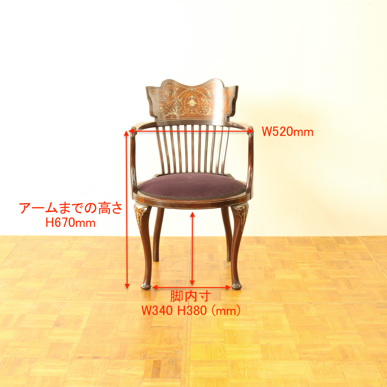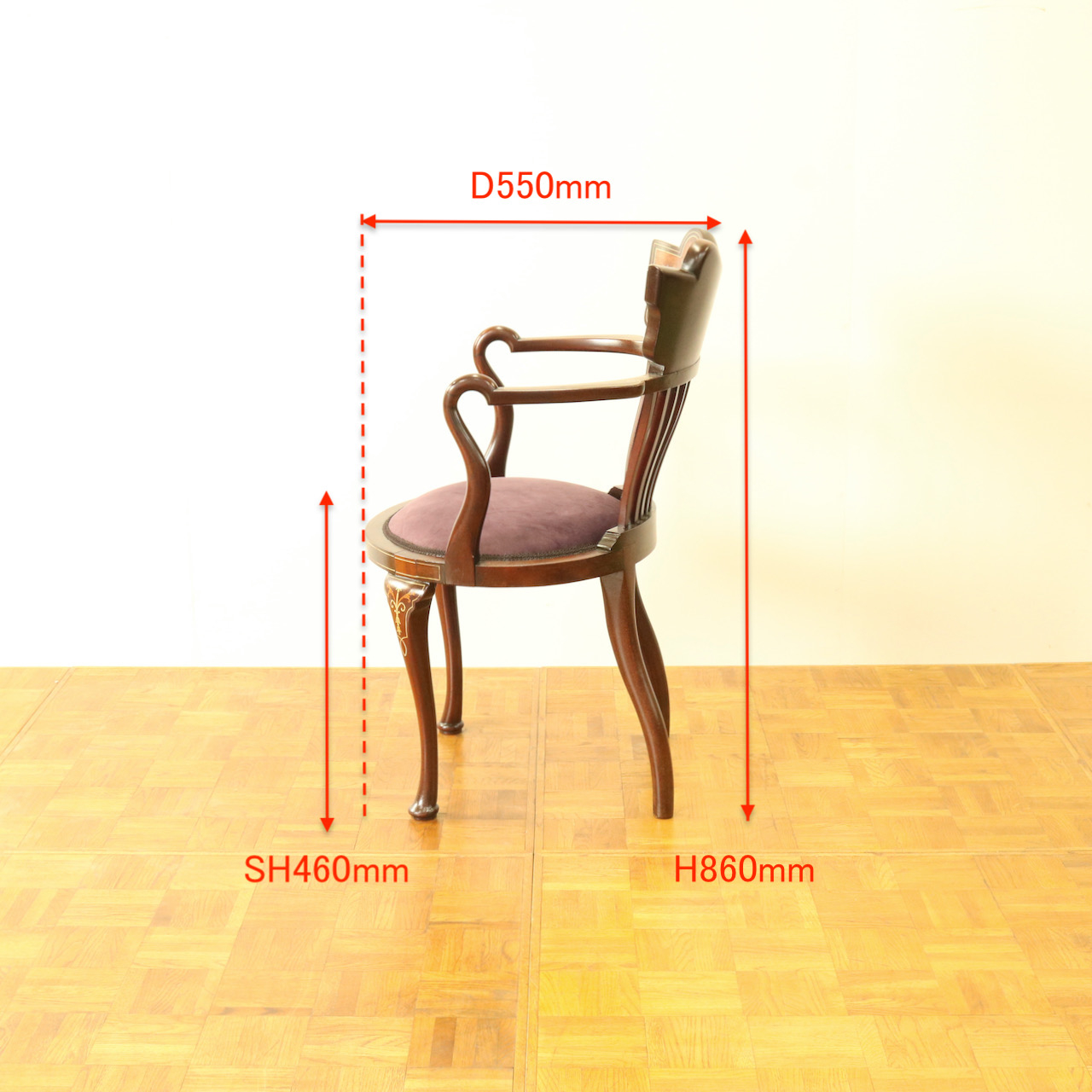 背もたれや脚部の繊細なインレイ装飾が魅力的。