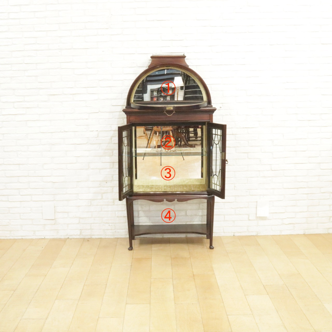 こちらも内部奥はミラー仕様で新しいものに交換しています。飾るものの後ろ姿も美しく映し出します。