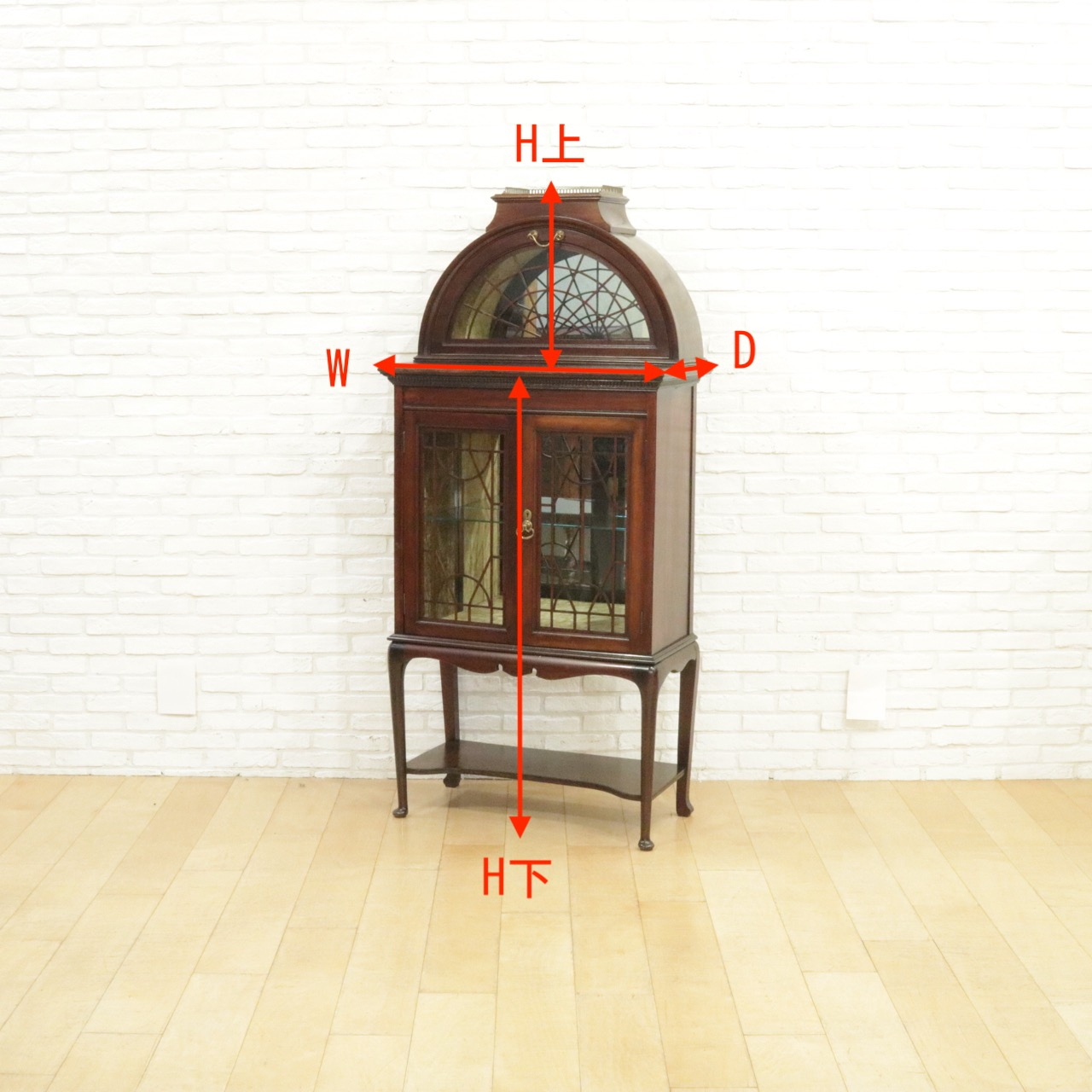 ガラス扉の木桟デザインやマホガニーの艶もアンティークらしい雰囲気を放つひと品。