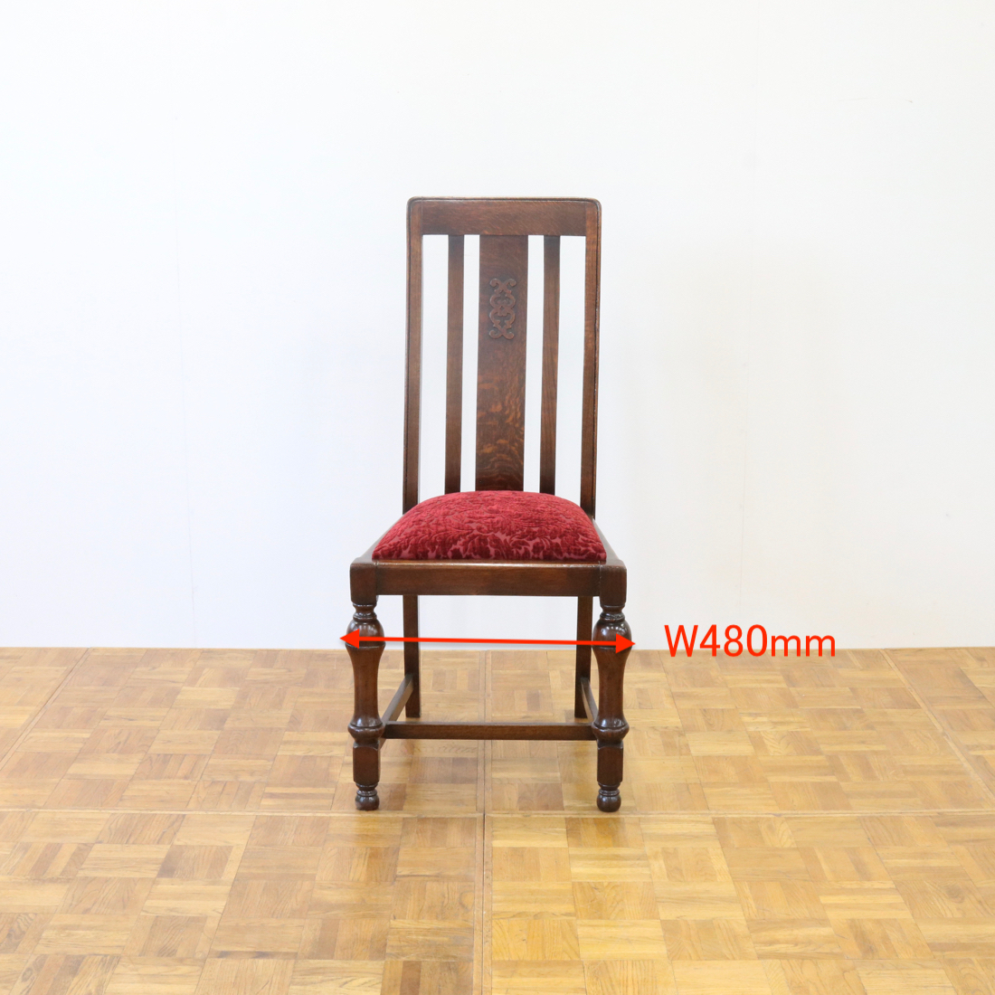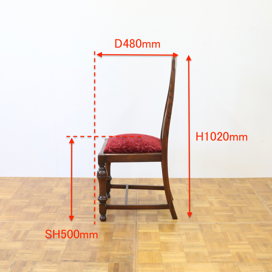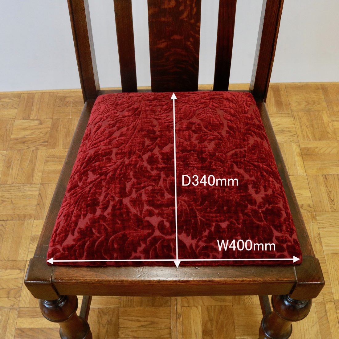 座面は植物柄の赤い生地を用い、クラシカルで華やかに仕上げました。